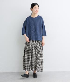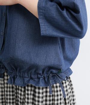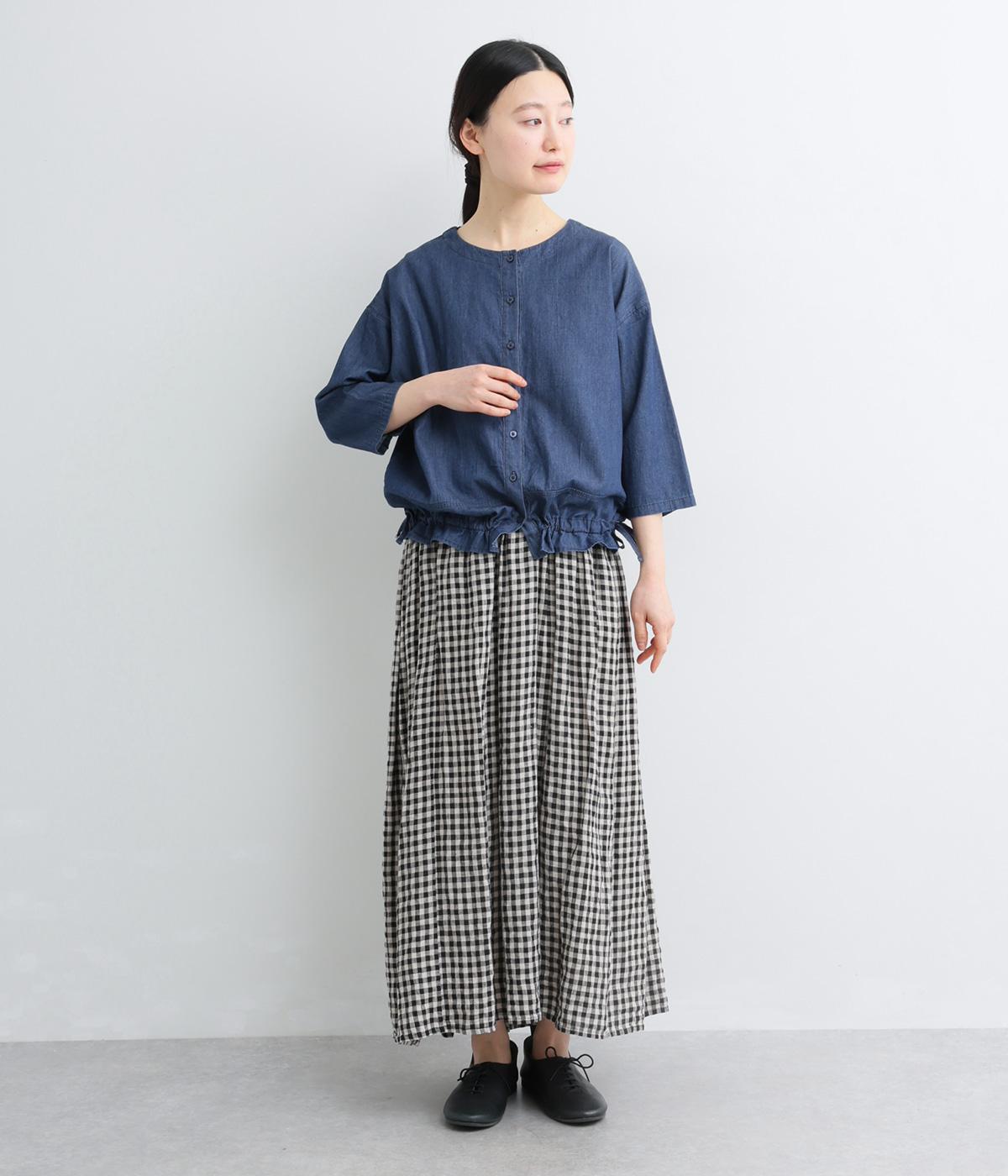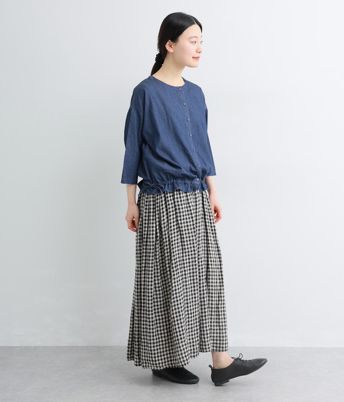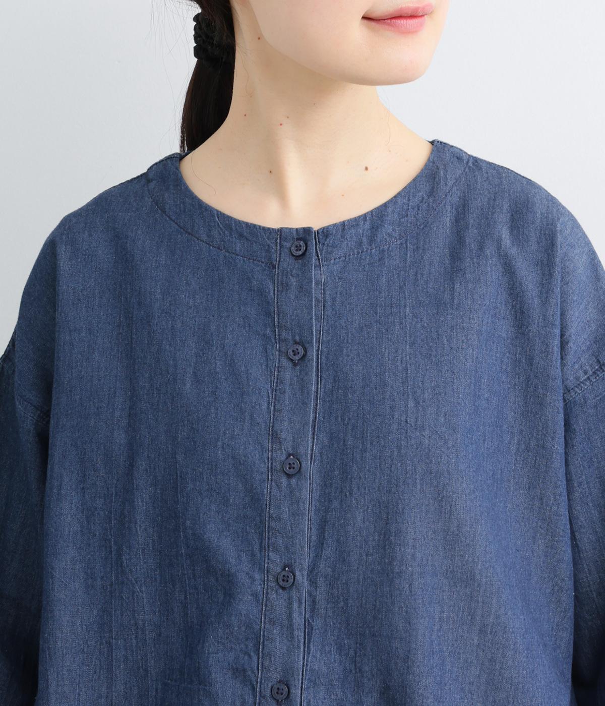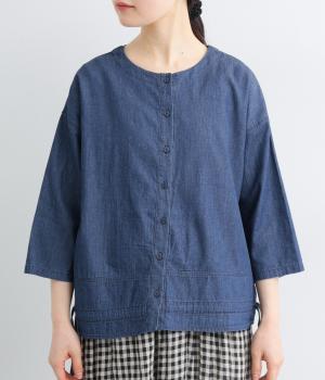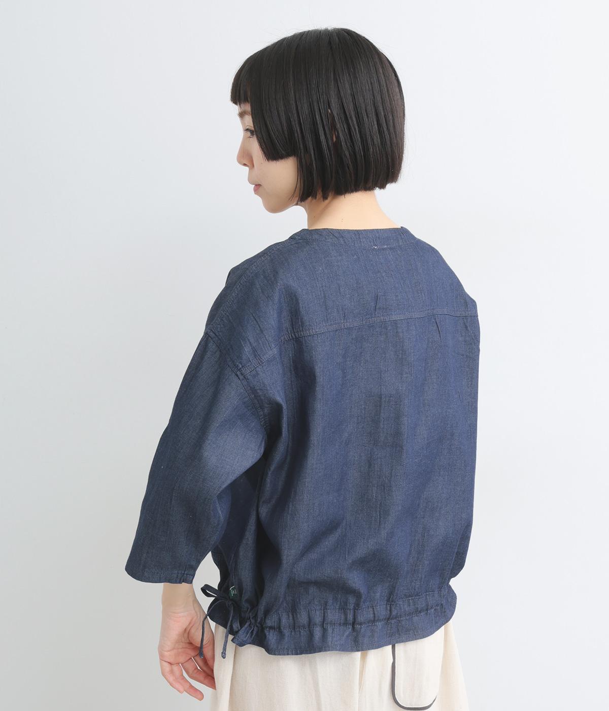 ワイドシルエットと、すっきりとしたノーカラーの首元が好バランスなブラウスです。裾に通したドローコードを絞ると、コクーンシルエットとしての着こなしも楽しめます。前をあけて、羽織りとして合わせるのもおすすめな一枚です。