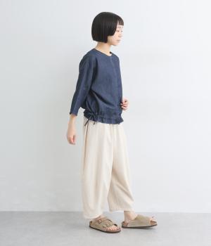 コットンのライトオンスデニムを使用した、非常に軽やかで柔らかな肌ざわり。デニム特有の重さや硬さを感じにくく、ストレスなく快適に過ごせます。