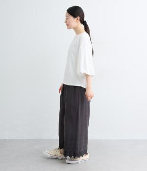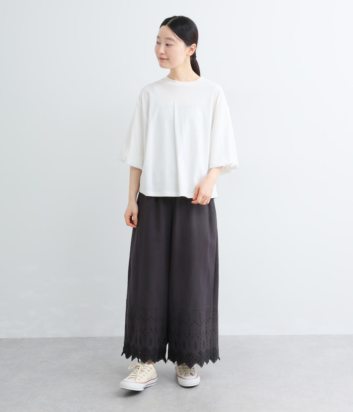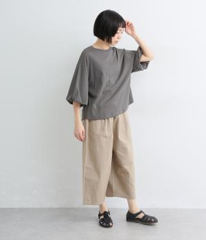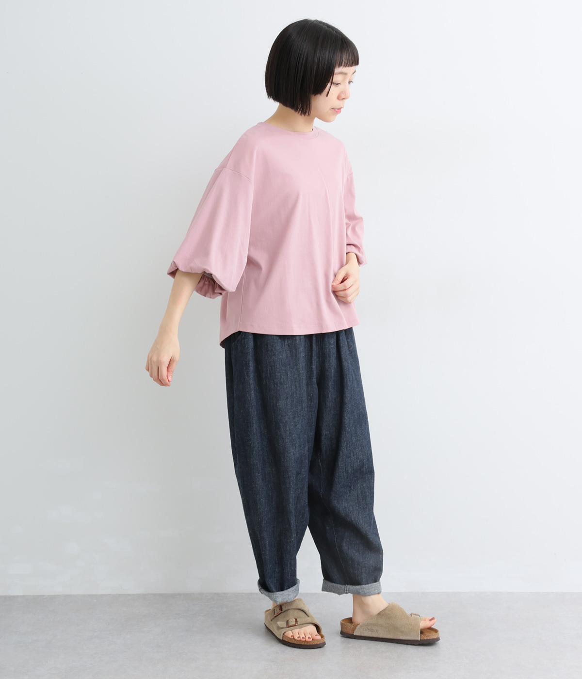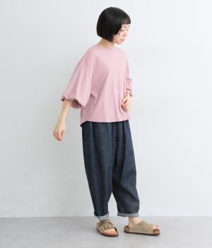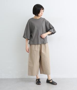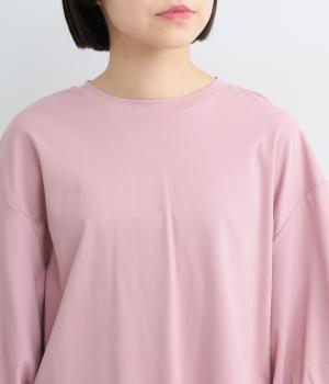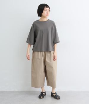 背面に施された深めのタックが、印象的なバックスタイルを演出するTシャツです。ふんわりと膨らむバルーンスリーブは、大人かわいく二の腕を自然にカバー。前後差のある裾ラインでボトム合わせもしやすく、こなれた装いをつくります。