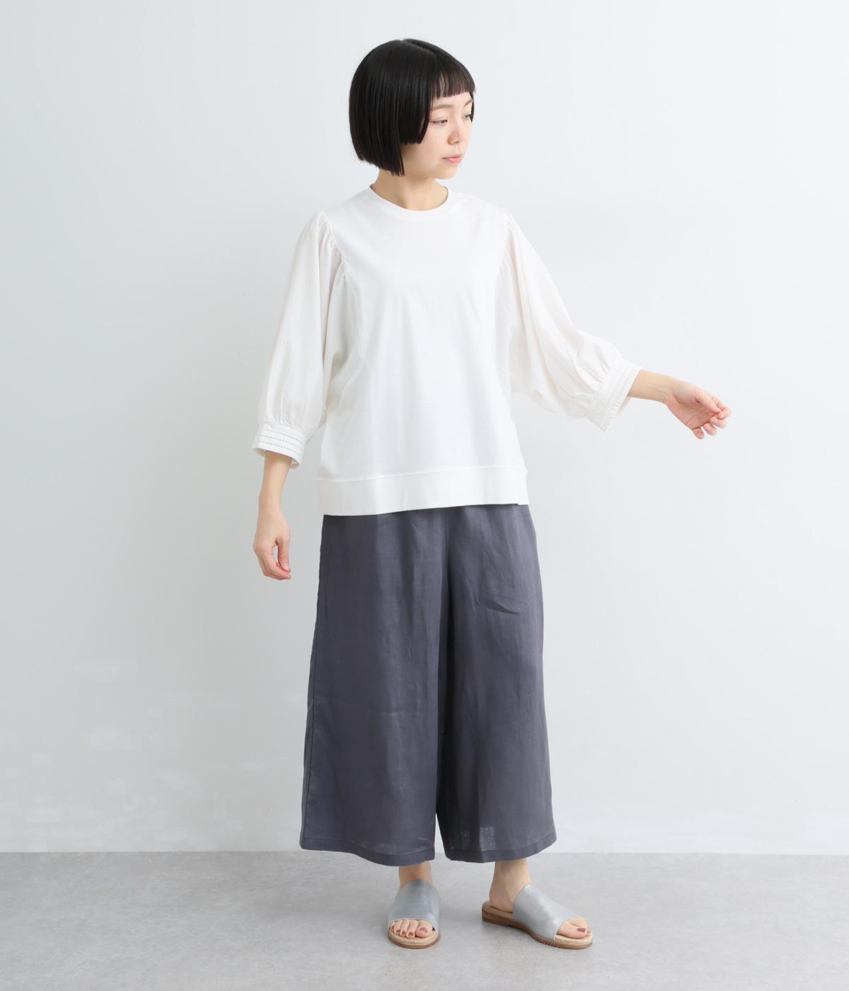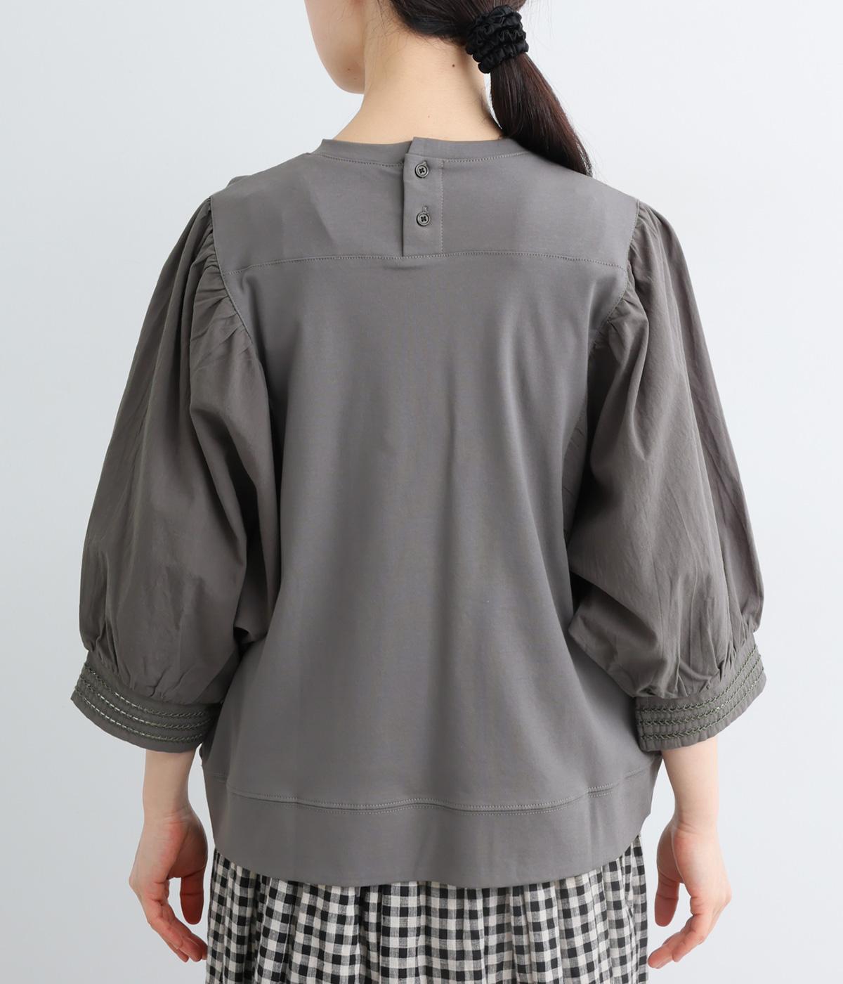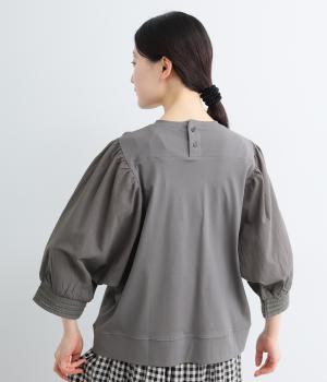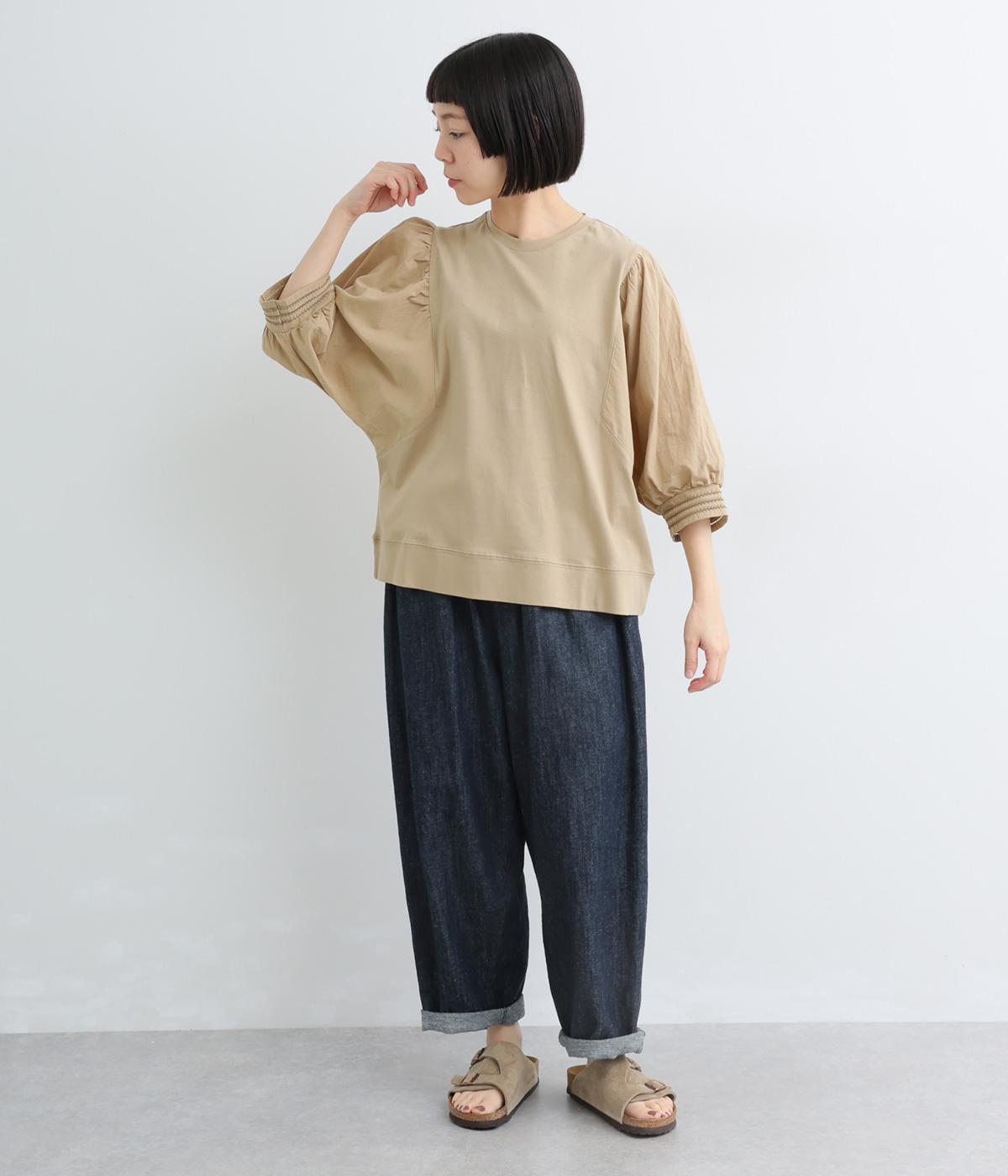 異素材のコントラストが目を惹くプルオーバーです。立体的なドルマンスリーブのボリューム感は、大人のかわいさを引き立てます。ゆとりを持たせたワイドシルエットが着やすく、着膨れしにくいのもポイントに。