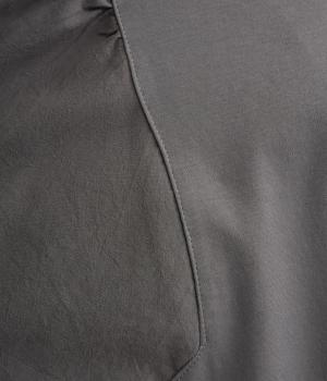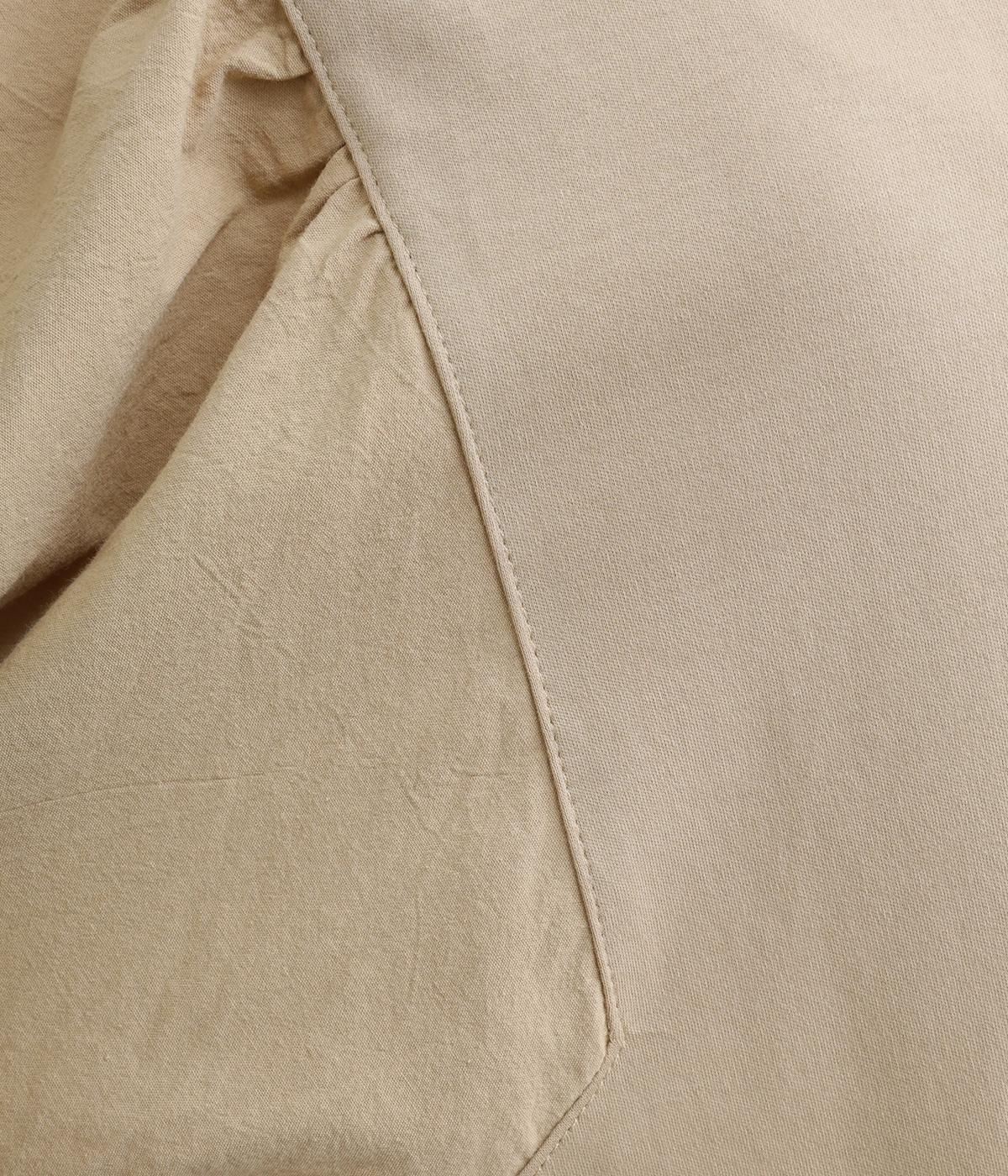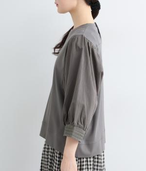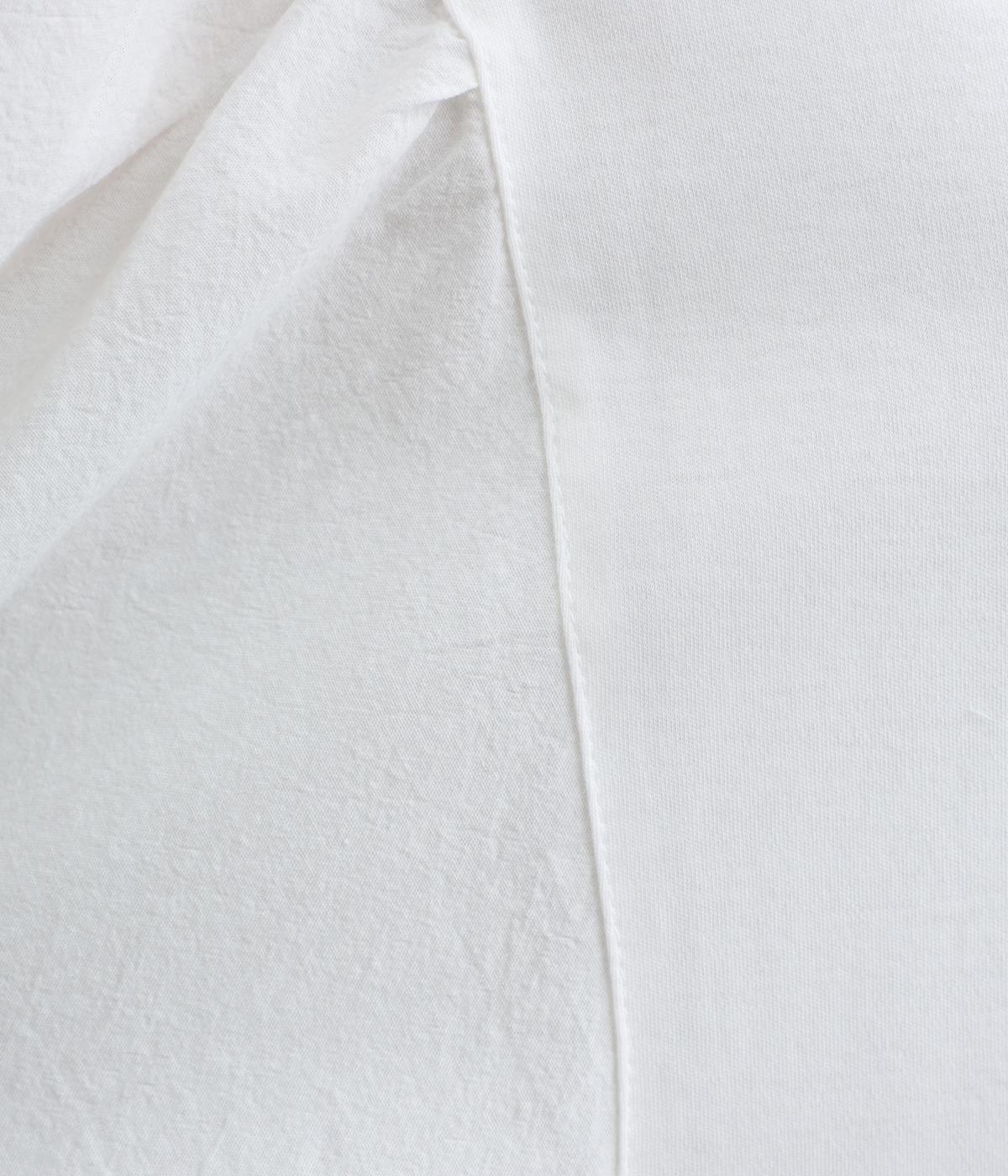強撚糸による清涼感と、シルケット加工のツヤが混在する上質な素材です。通気性が良く型崩れもしにくいため、一日中涼やかに着用できます。袖部分は風合いの異なる布帛生地を使用しています。
