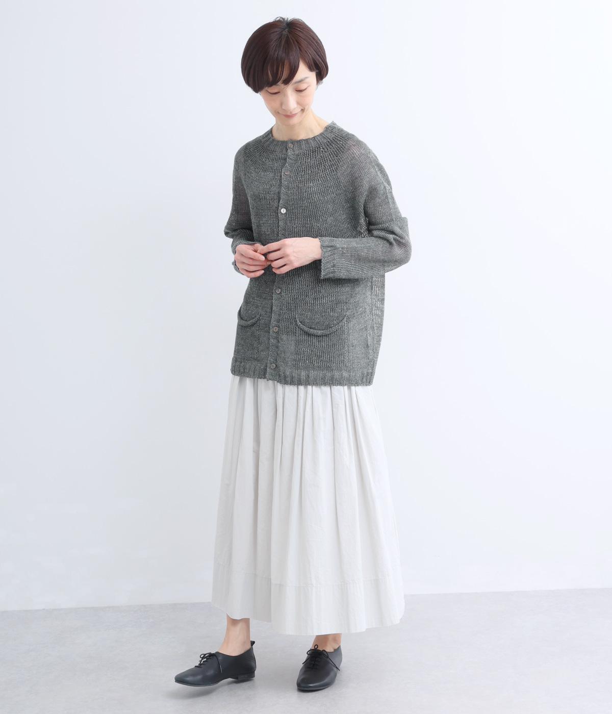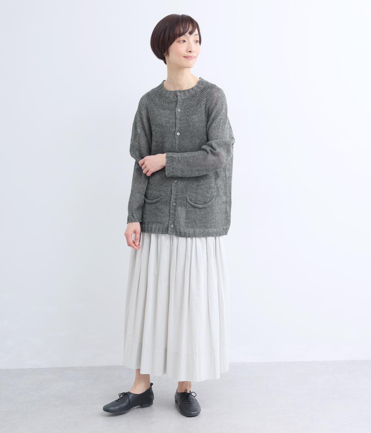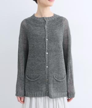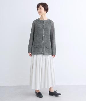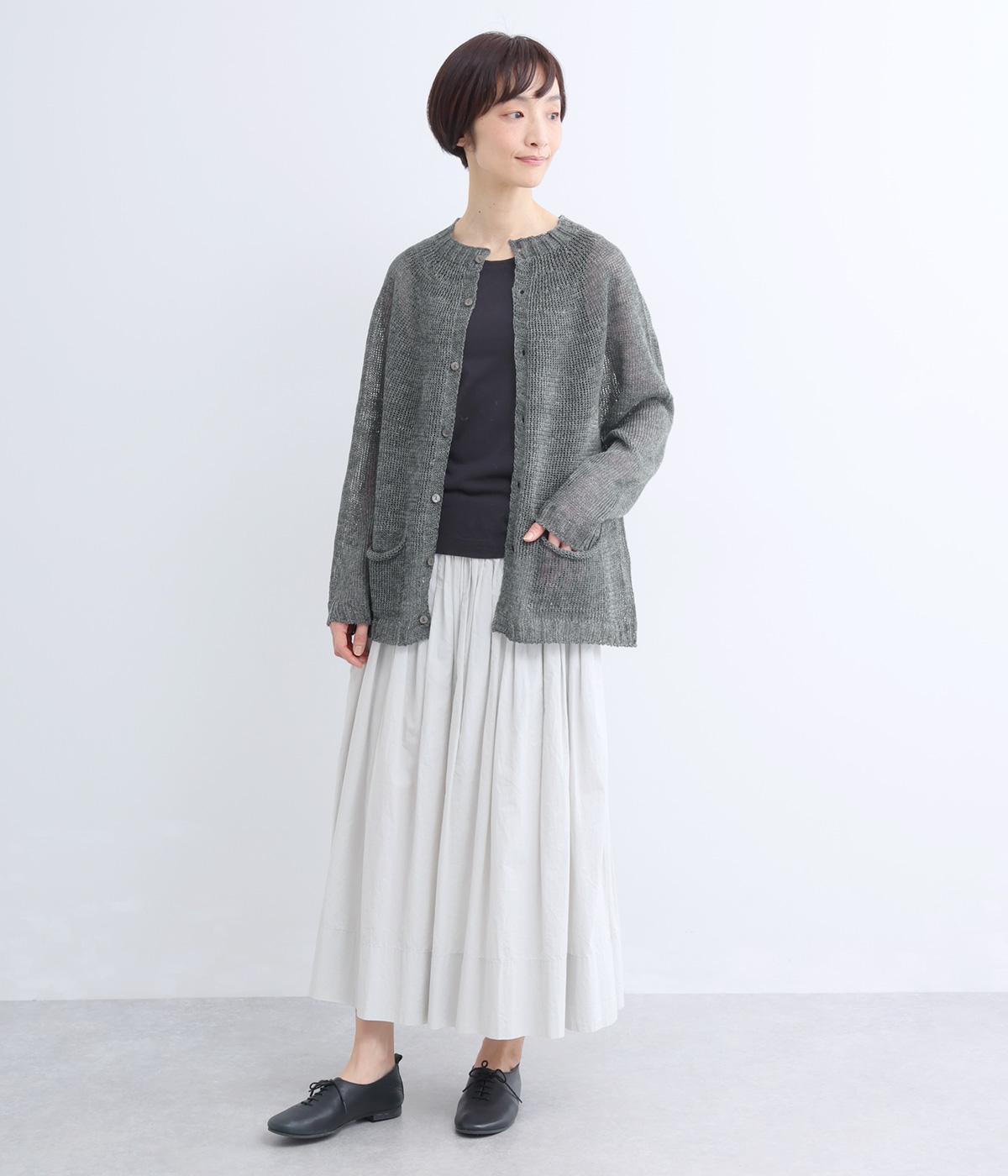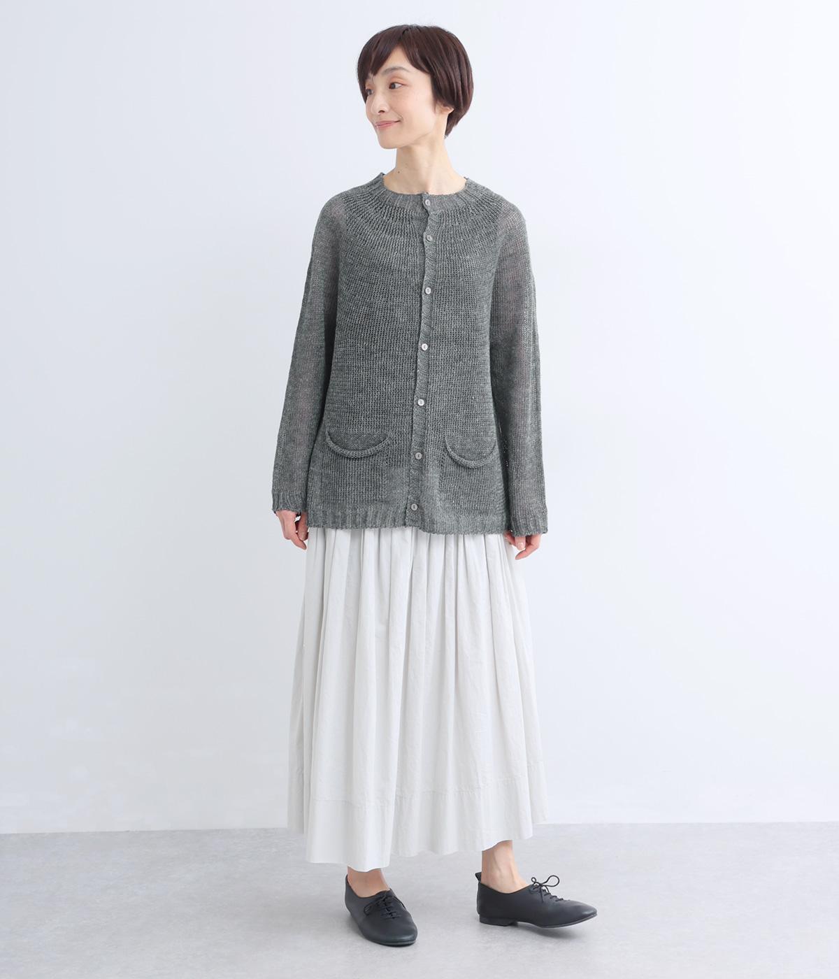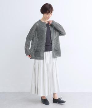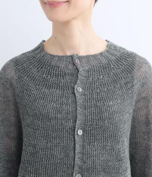 国産フレンチリネンをざっくりと編み立てた、シャリ感のあるニット生地です。肌離れがよく、暑い季節も心地よく着用できます。素材ならではのほのかな光沢と編み地のシアー感が、軽やかに装いを引き立てます。