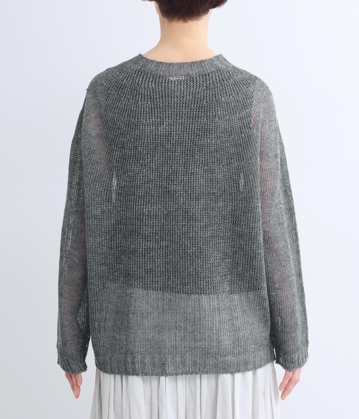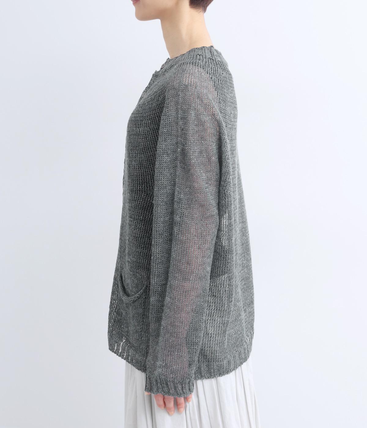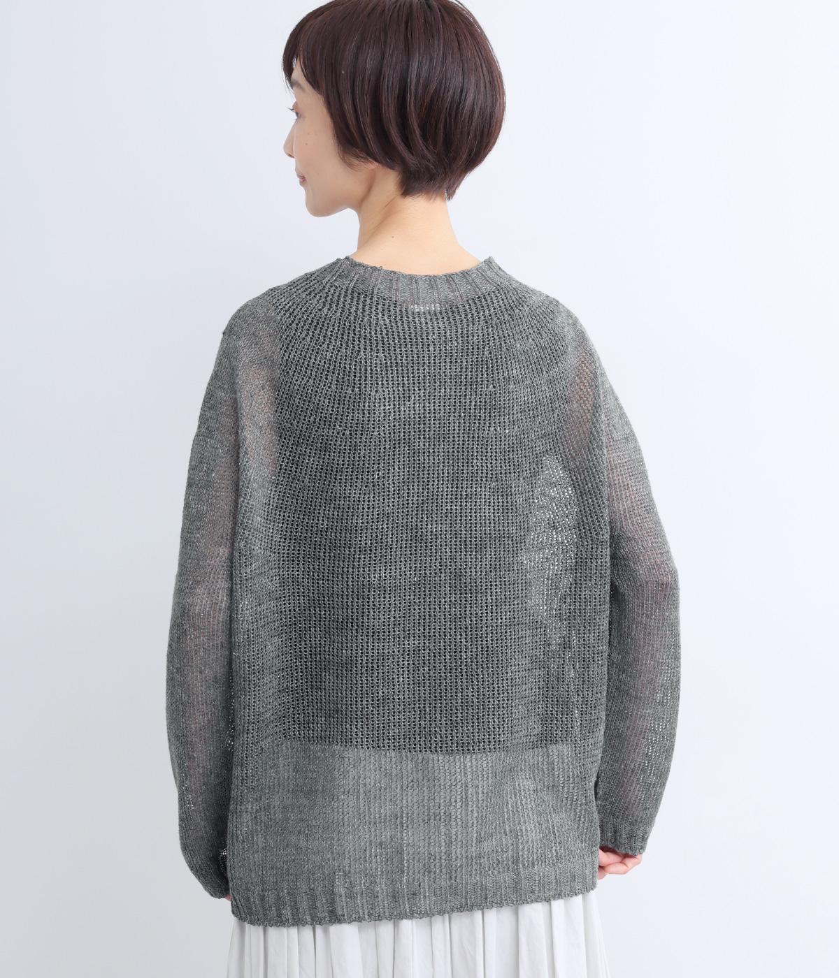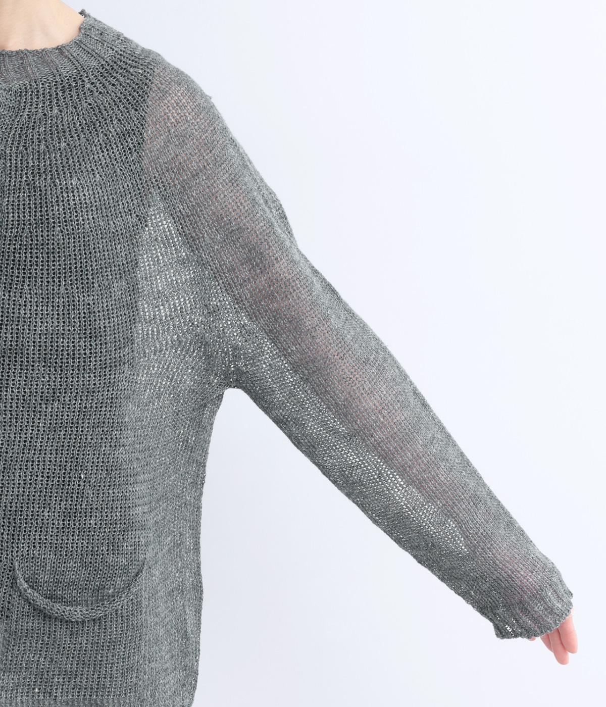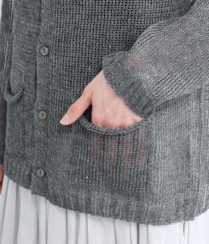 国産フレンチリネンをざっくりと編み立てた、シャリ感のあるニット生地です。肌離れがよく、暑い季節も心地よく着用できます。素材ならではのほのかな光沢と編み地のシアー感が、軽やかに装いを引き立てます。