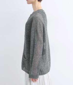 求心編みで仕立てた、ゆったりとしたフォルムが特徴です。切り替えのないデザインで、肩まわりも動きやすく、やさしくなじむ着心地に。やや長めの丈感が腰まわりをさりげなくカバー。前ポケットのやわらかな表情がアクセントになっています。