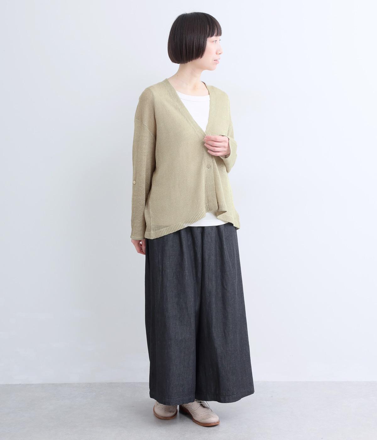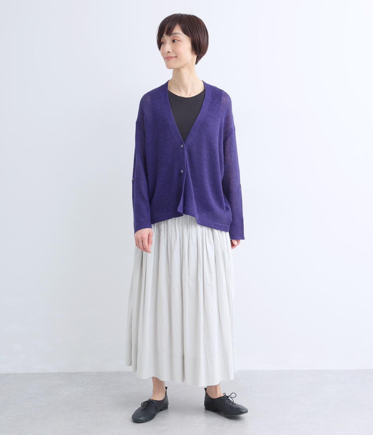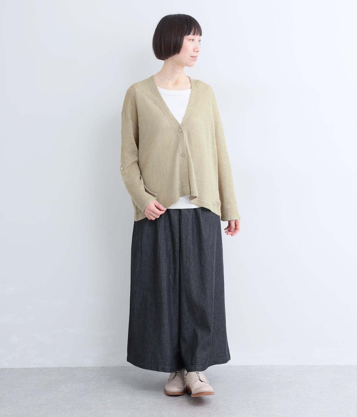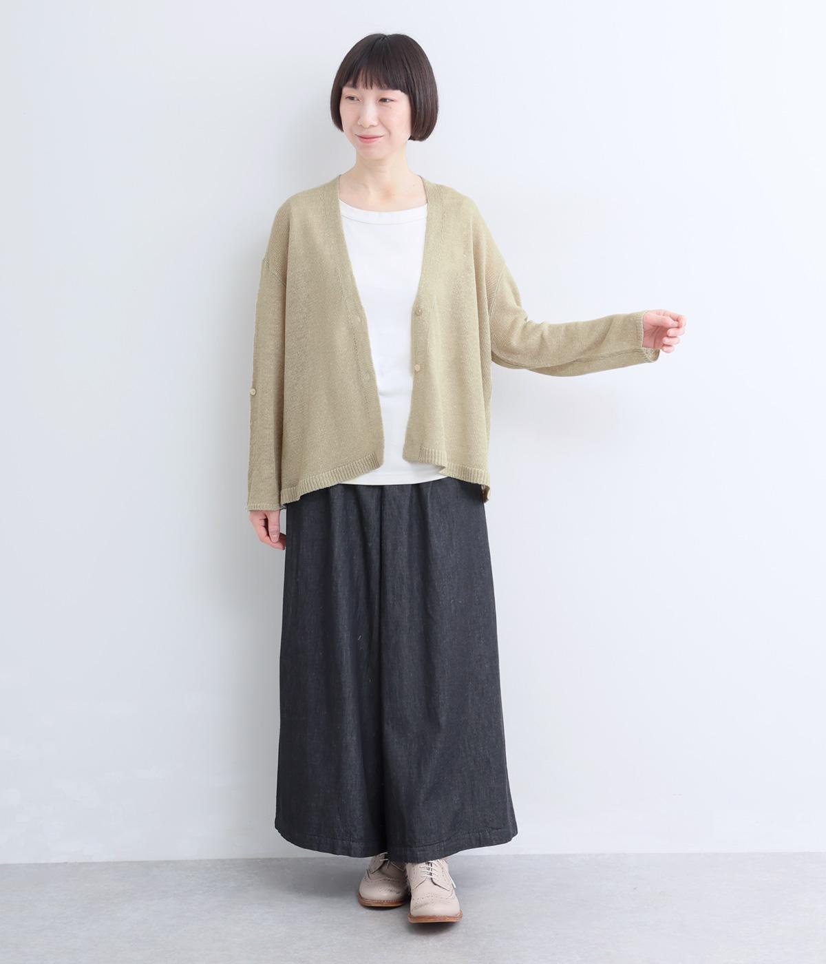 シンプルなシルエットのカーディガンに、やや深めのVネックを合わせました。ほどよい丈感でバランスが取りやすく、インナーとのレイヤードも自然に映えるデザインです。袖を巻き上げやすい、ロールアップボタンつきなのもうれしいポイント。