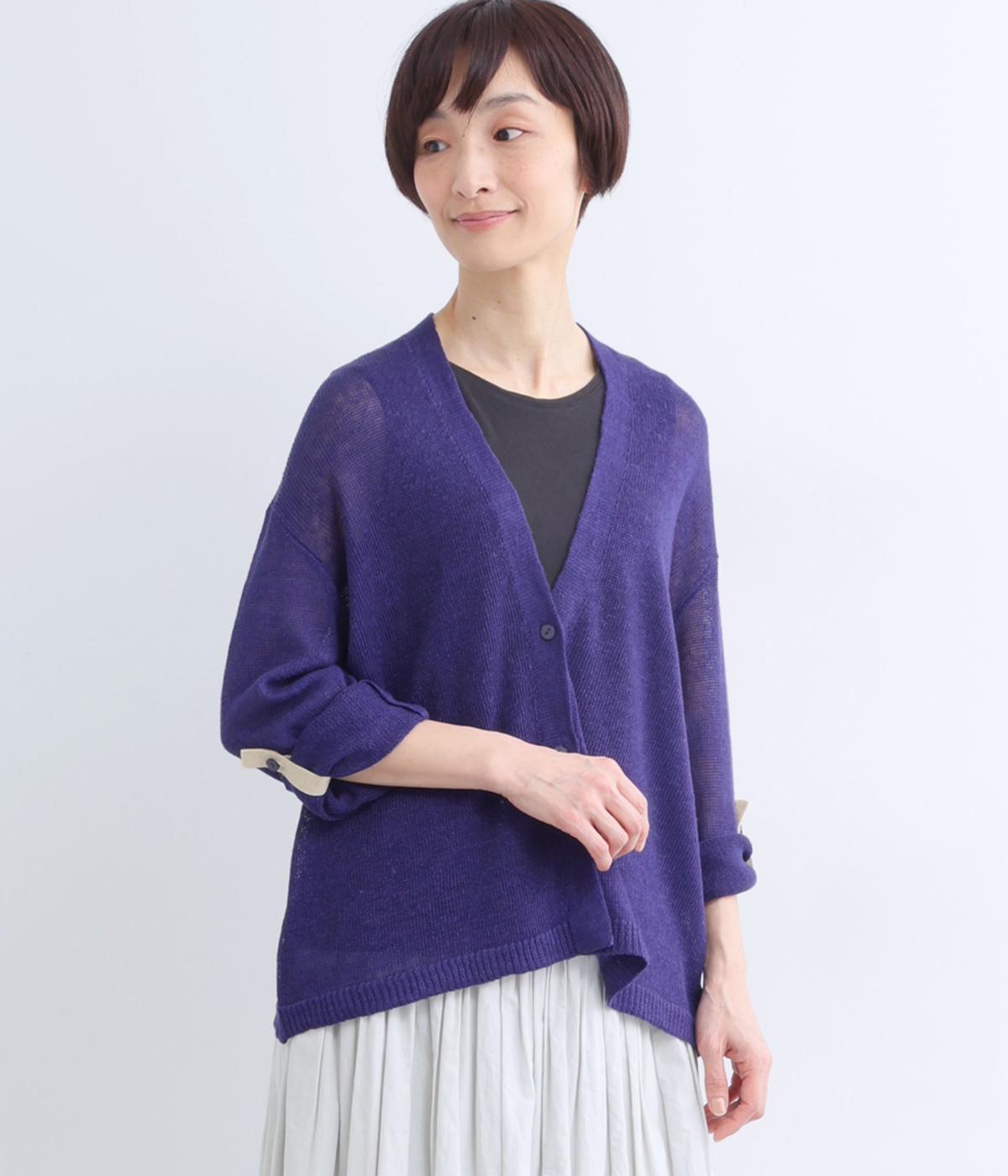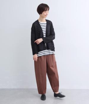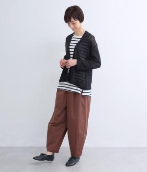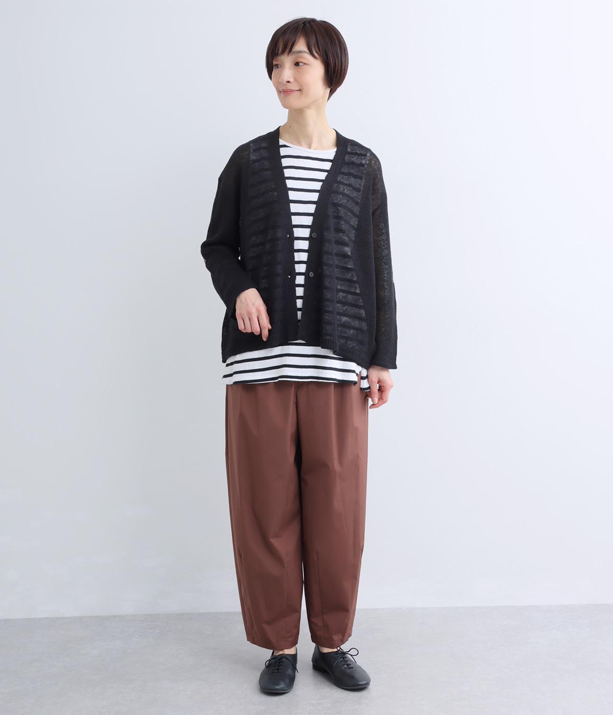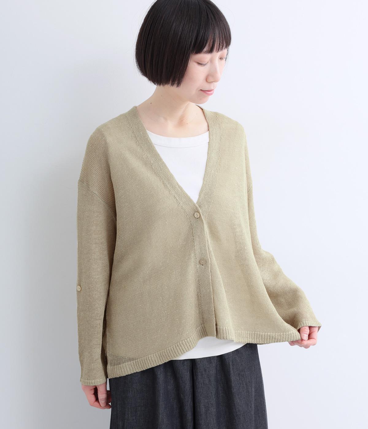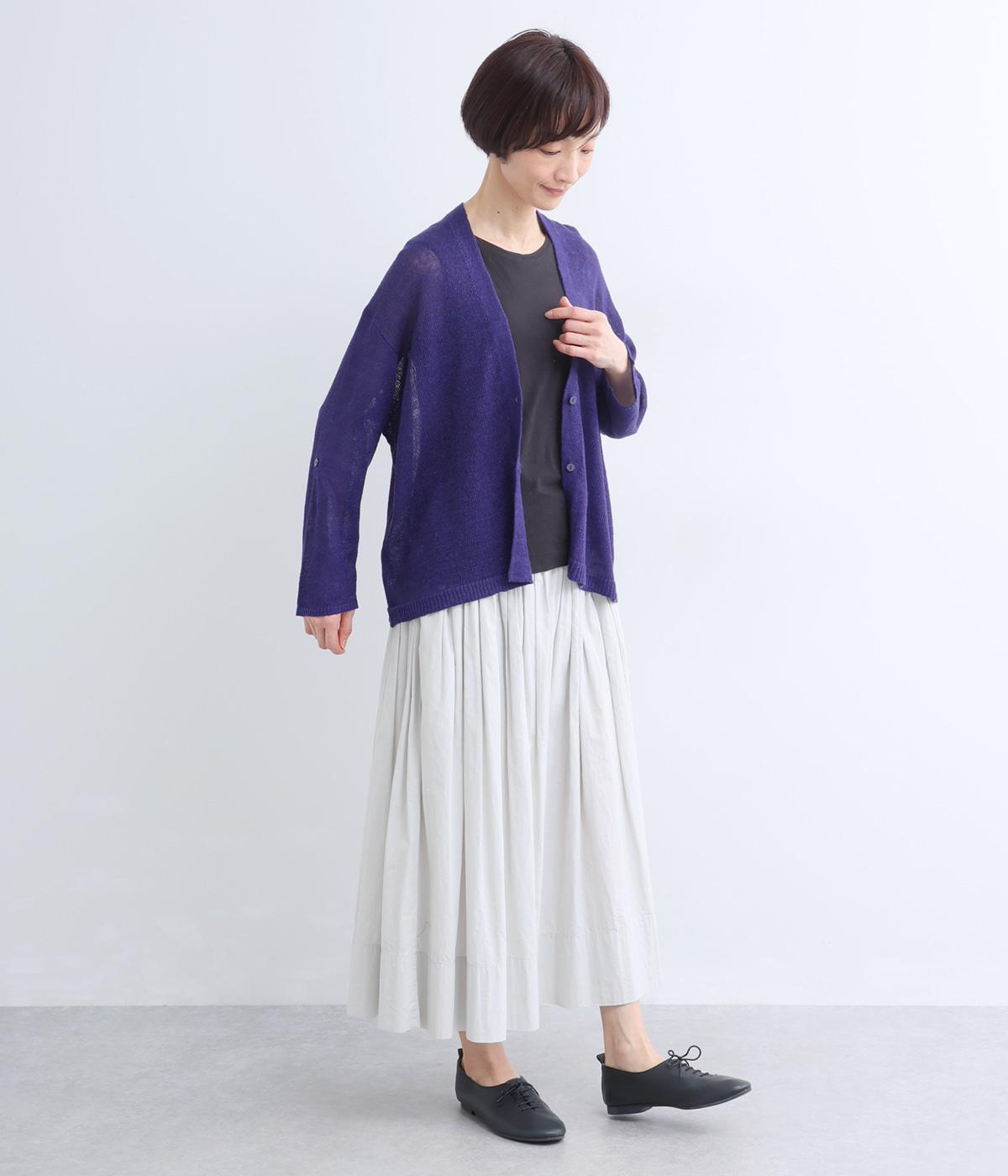 シンプルなシルエットのカーディガンに、やや深めのVネックを合わせました。ほどよい丈感でバランスが取りやすく、インナーとのレイヤードも自然に映えるデザインです。袖を巻き上げやすい、ロールアップボタンつきなのもうれしいポイント。