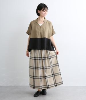 さらりとした肌ざわりが心地よい、コットンリネン素材です。軽やかさのなかにほどよいハリも備え、タックの立体感をきれいに引き立てます。洗いざらしのようなナチュラルな風合いが、装いにこなれた雰囲気を添える生地感です。