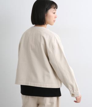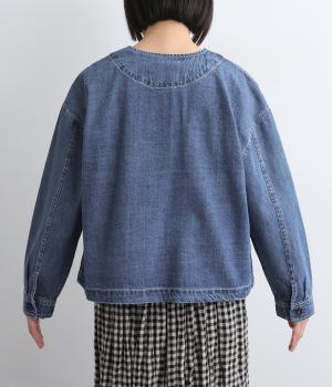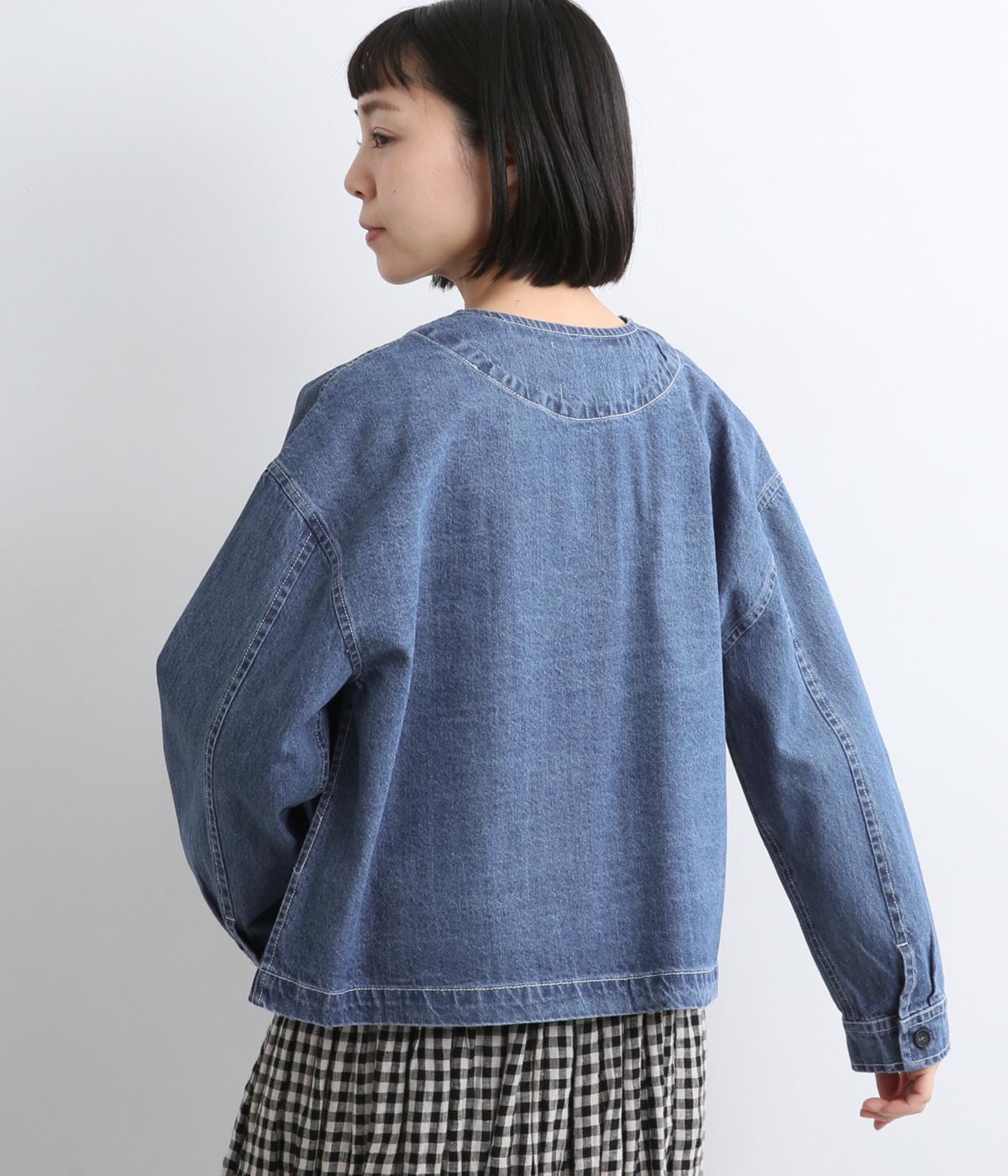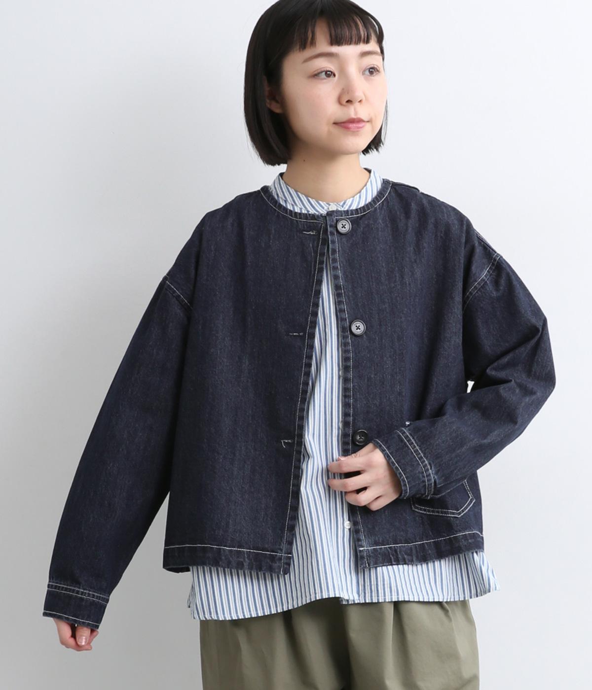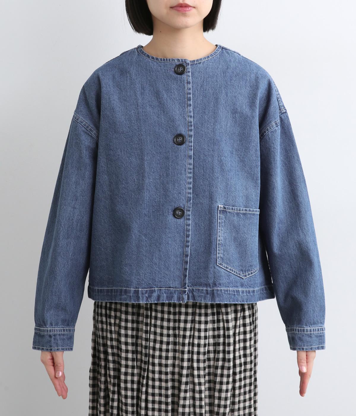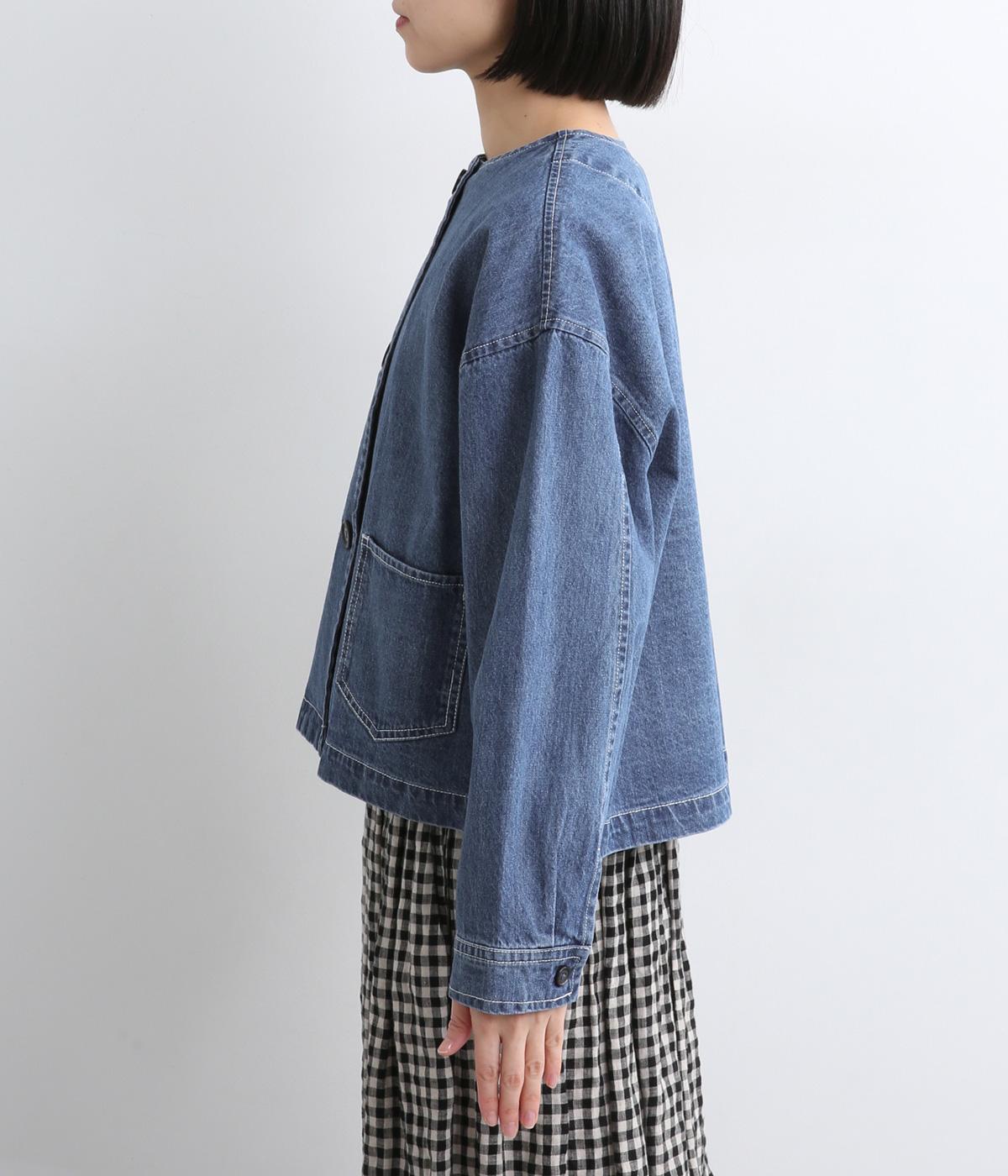 すっきりとしたノーカラーでカジュアルさを軽減させたデニムジャケット。片側だけにポケットをつけたアシンメトリーデザインも特徴的で、定番デニムスタイルに鮮度をプラス。着丈はコンパクトで軽やかに仕上げました。