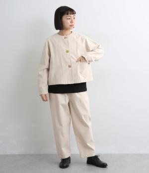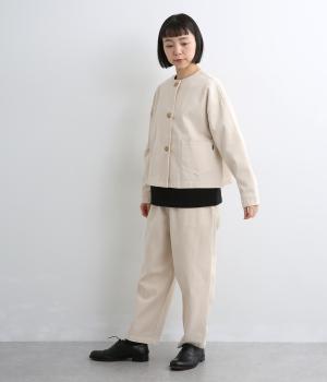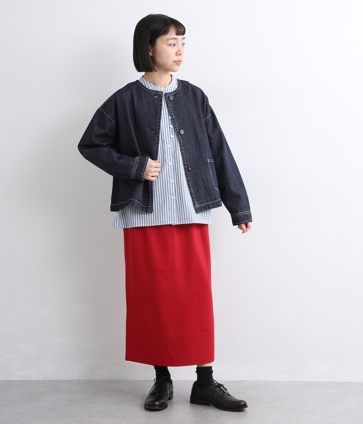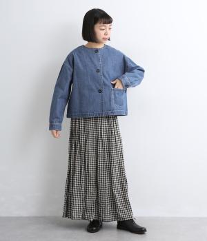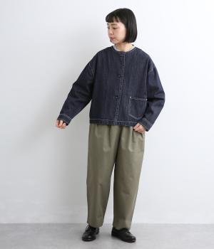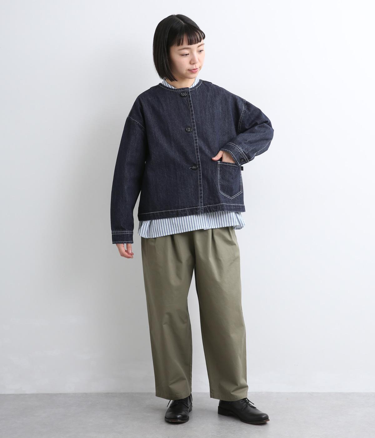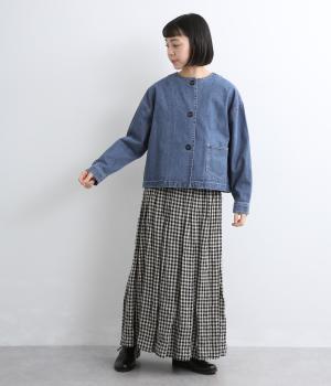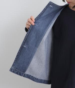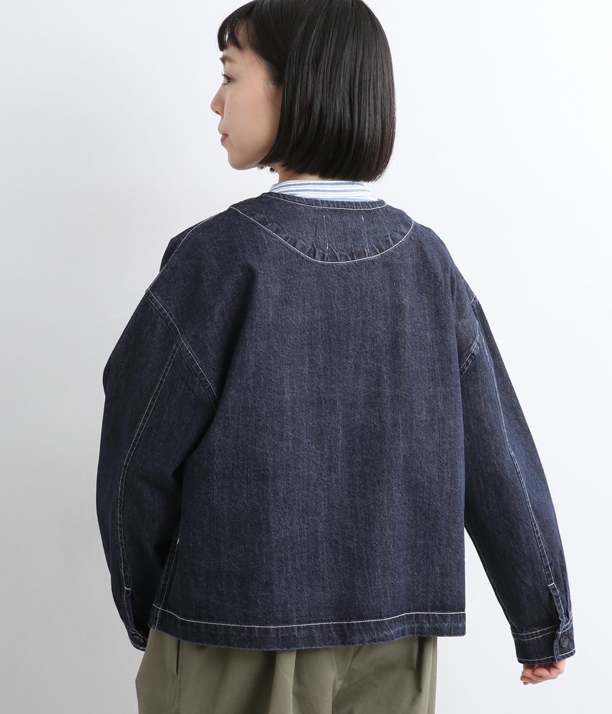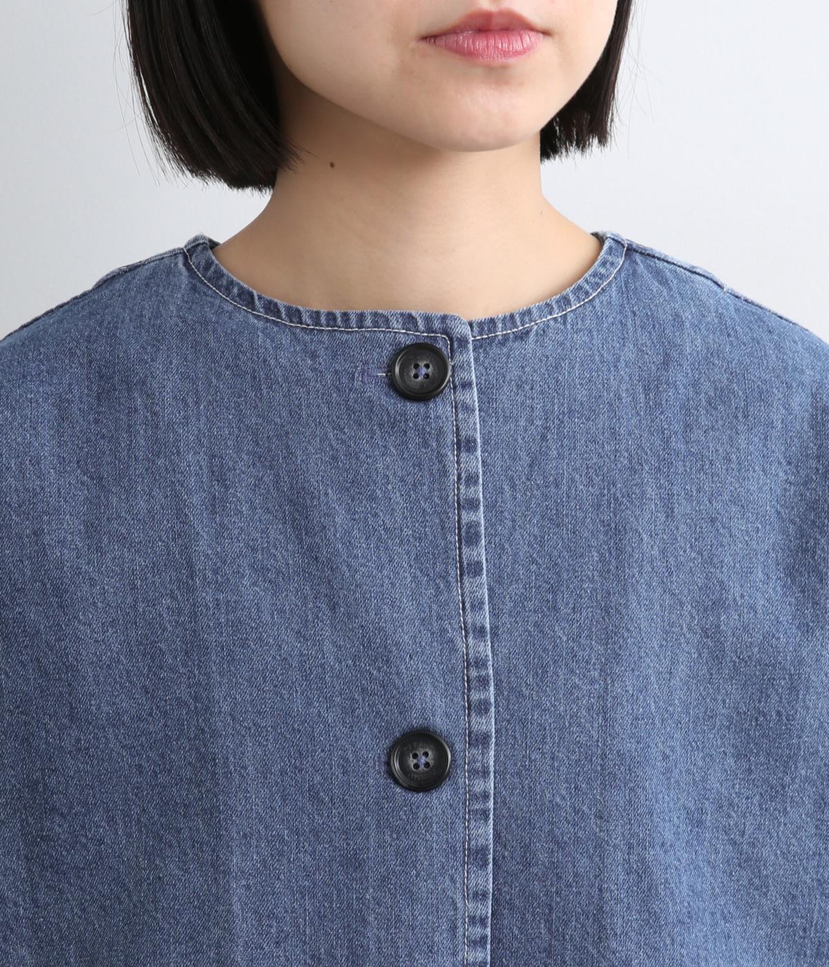 すっきりとしたノーカラーでカジュアルさを軽減させたデニムジャケット。片側だけにポケットをつけたアシンメトリーデザインも特徴的で、定番デニムスタイルに鮮度をプラス。着丈はコンパクトで軽やかに仕上げました。