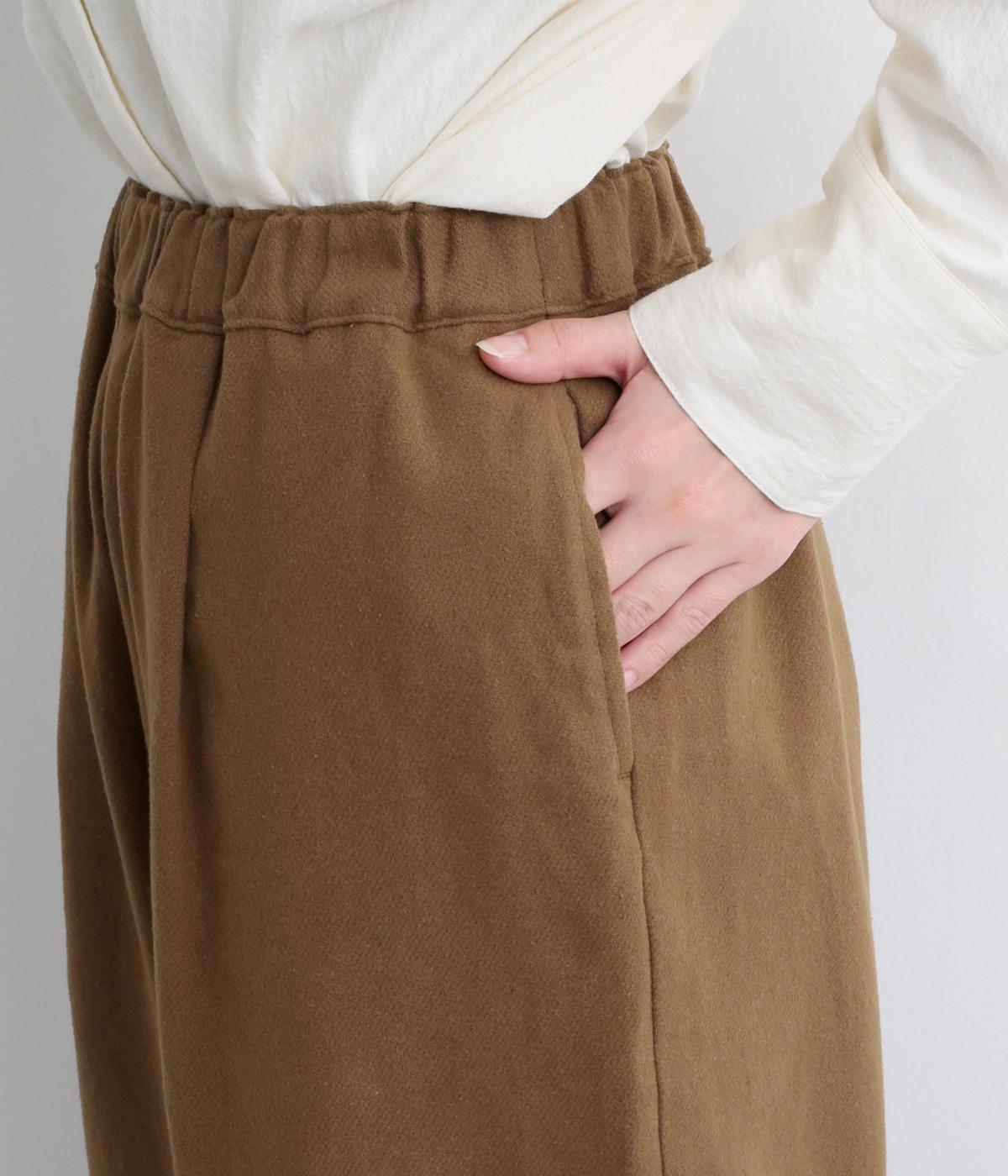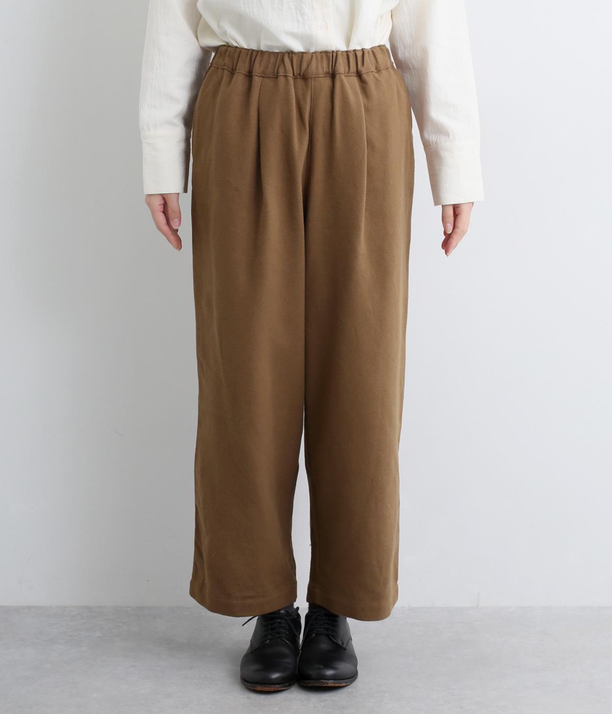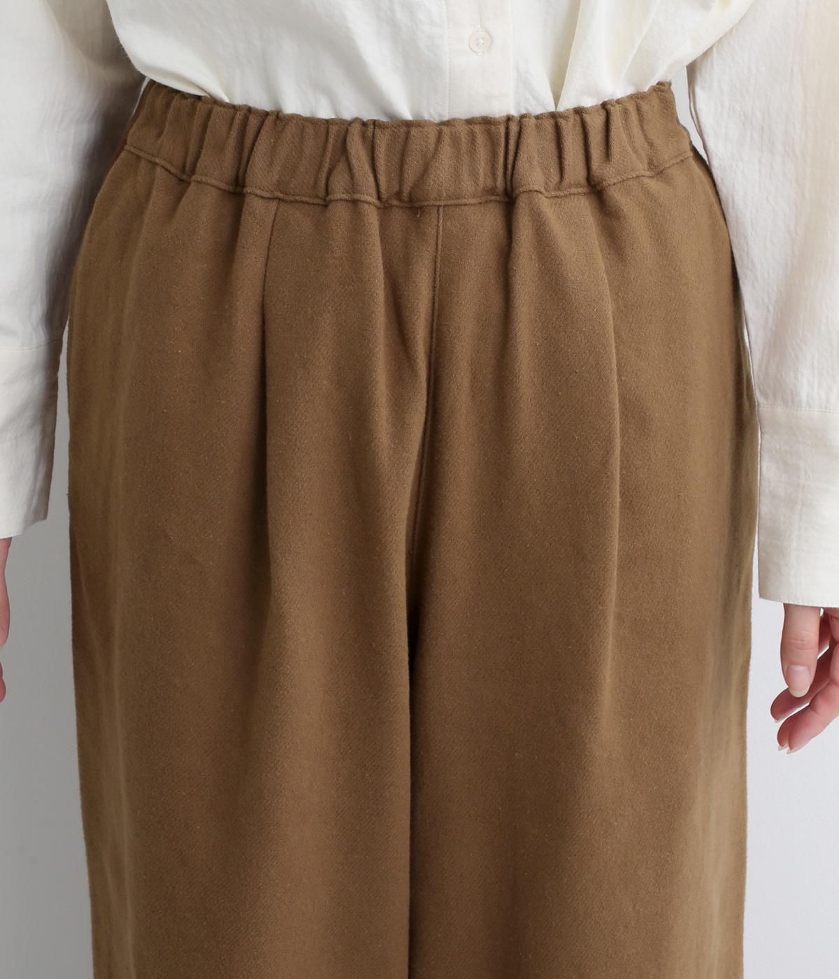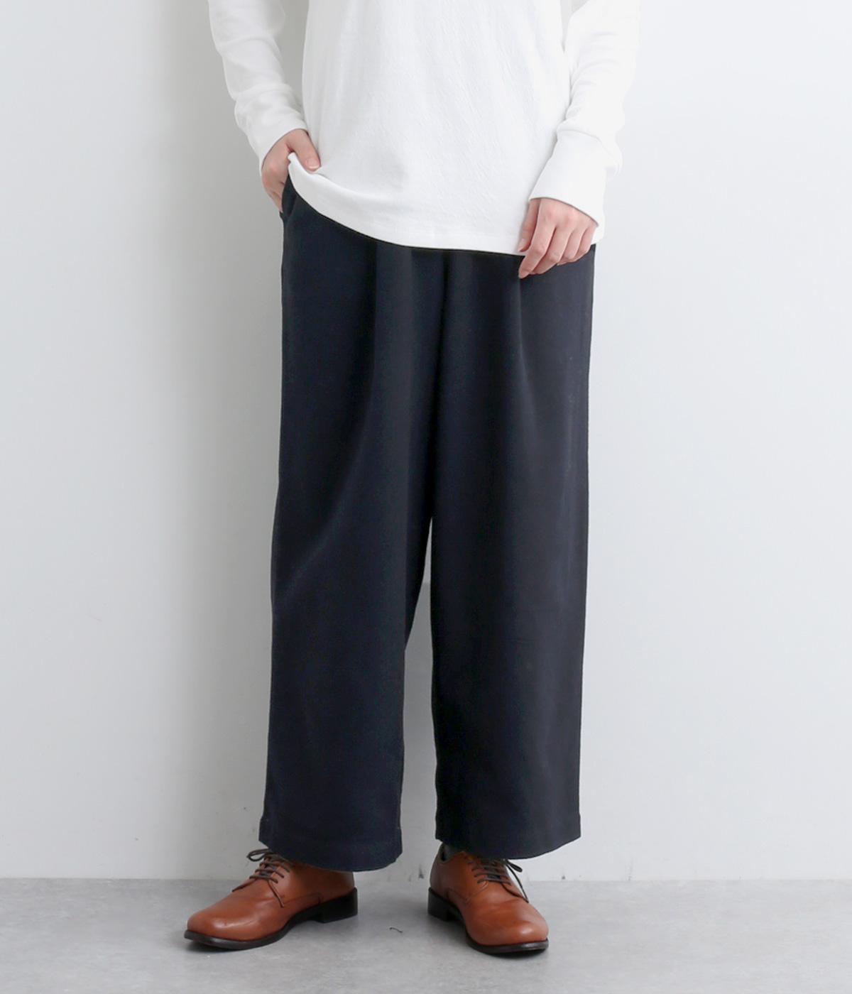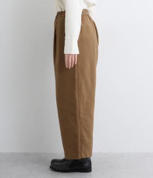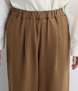 前ウエスト下にタックをほどこして腰まわりにゆとりを持たせたワイドパンツ。裾の広がりをおさえることで、カジュアルさを軽減してすっきりとした印象に仕上げました。ウエストは総ゴム仕様で、フィット感を高める内紐つきです。