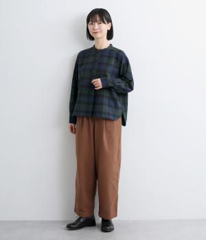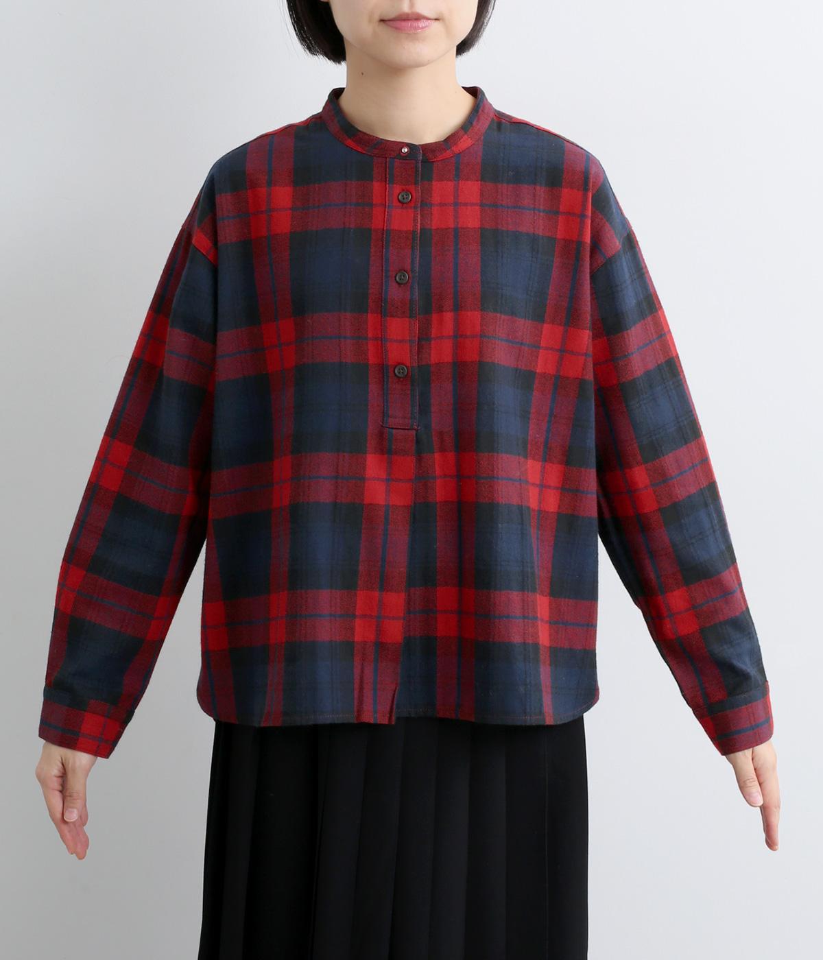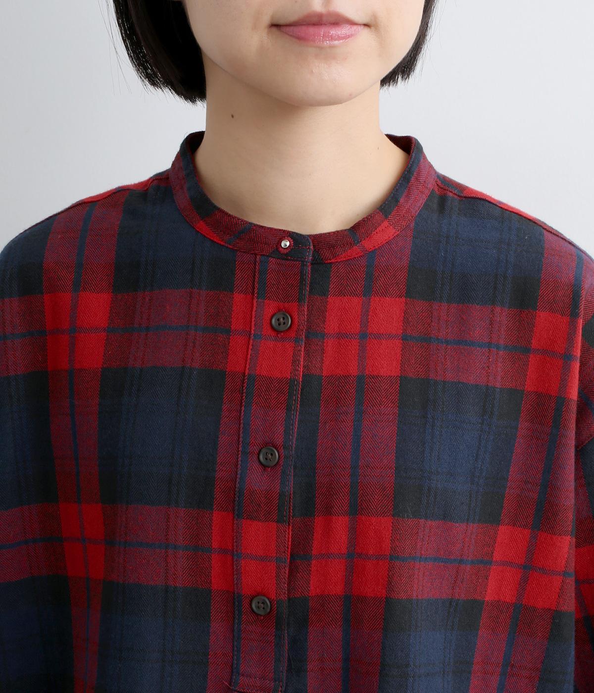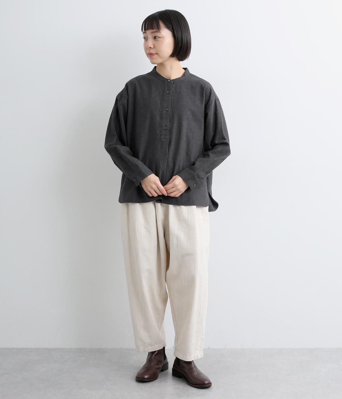 きちんと感ただようバンドカラーとゆったりとしたシルエットが特徴のシャツです。フロントは胸下まで開くヘンリーネック仕様で、一番上のギボシボタンがアクセントに。前後差のある着丈とラウンドヘムが、ボトムスとのバランスを整えてくれます。