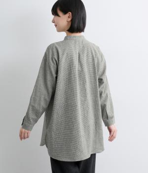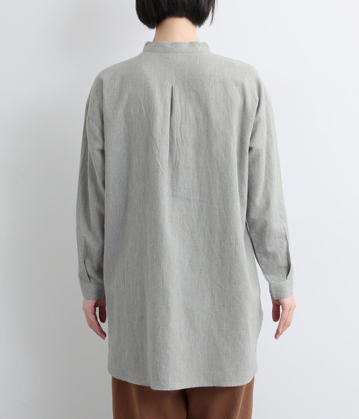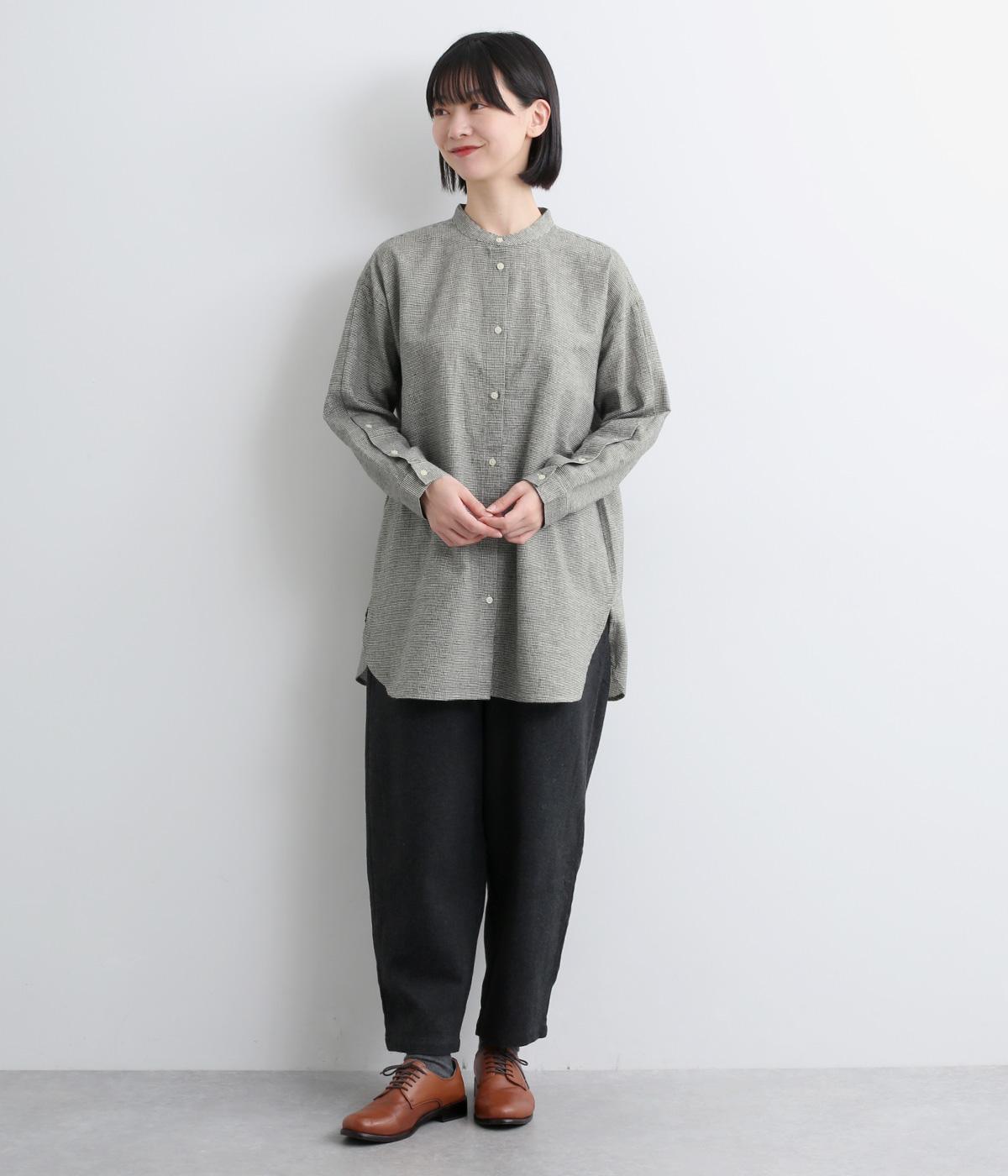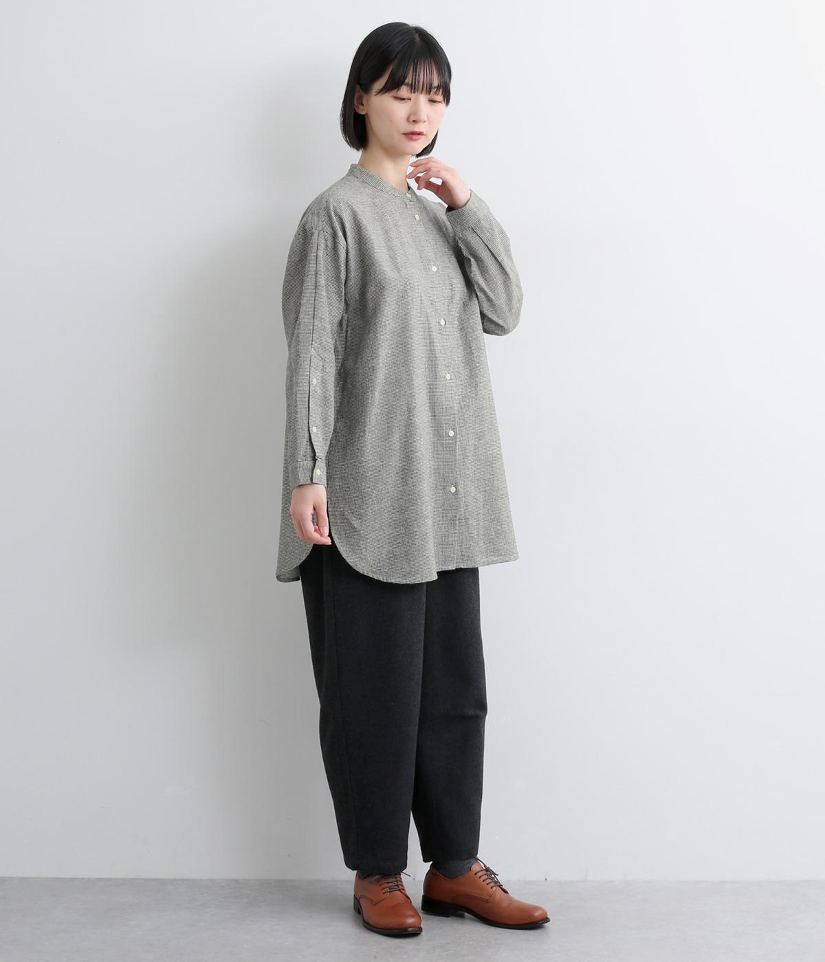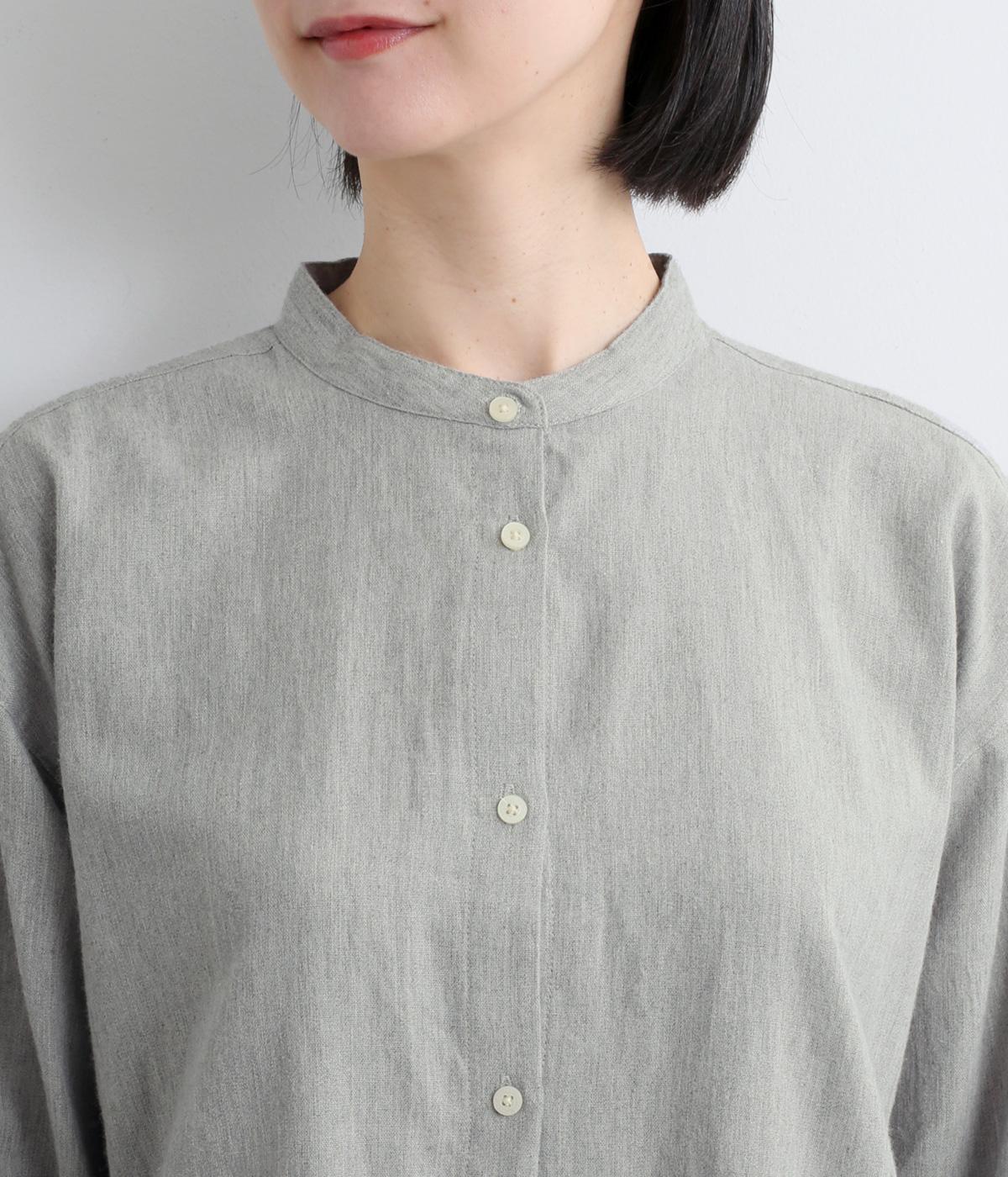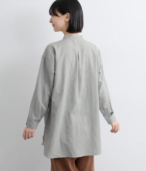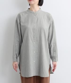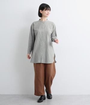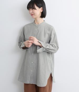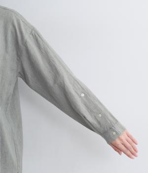 天然繊維ならではのナチュラルな風合いが映えるシンプルなシャツ。大きく開くボタン仕様の袖口が特徴です。襟元はバンドカラーできちんとした印象に。大きく曲線を描くヘムラインが横姿に抜け感をうみ、ロング丈ながらも間延びして見えないのが◎です。