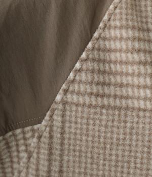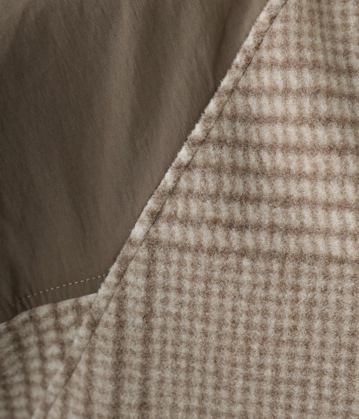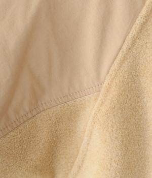 つい表面を撫でたくなるようなふっくらとしたやわらかな起毛感が魅力のポリエステルレーヨン生地をメインに使用。ほどよいハリ感のあるさらりとしたコットン混の布帛生地をドッキングしました。