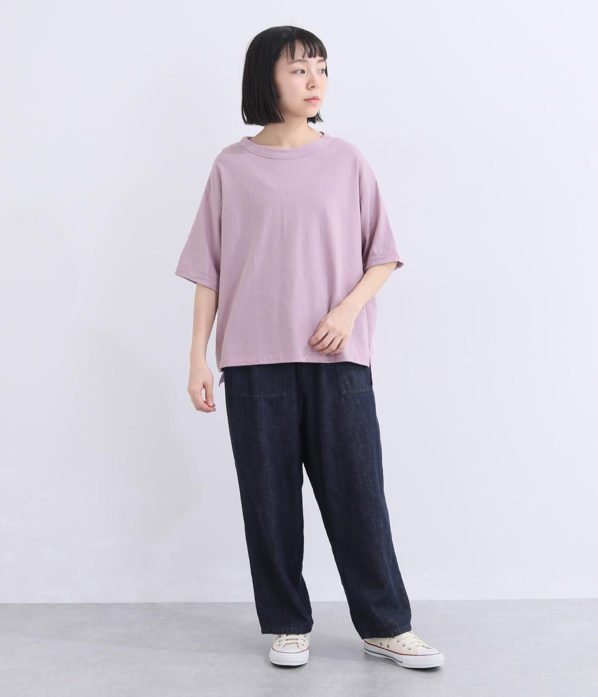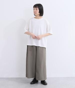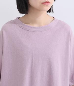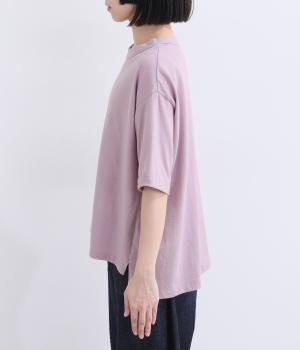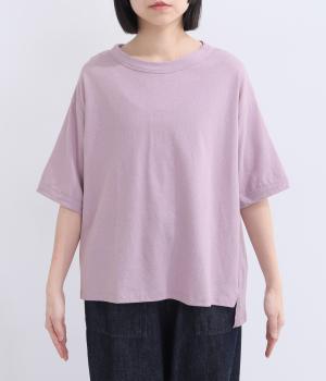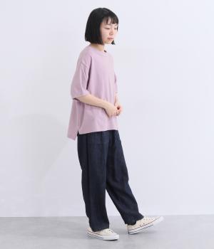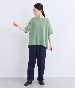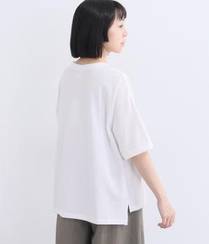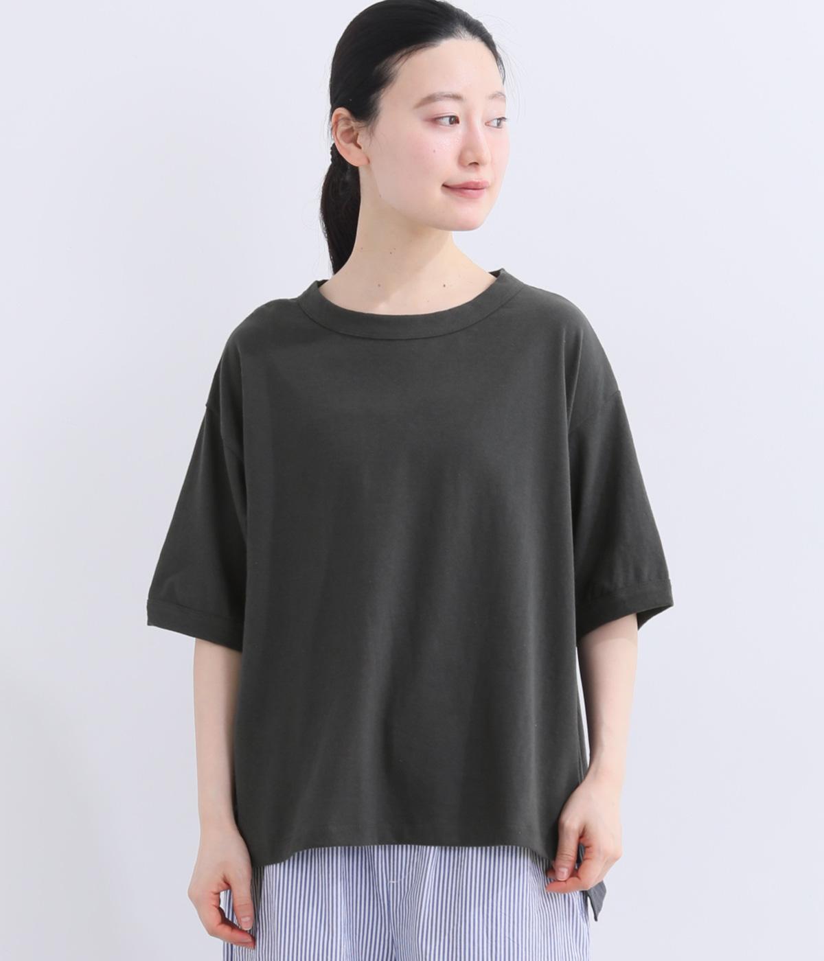 表情のある生地の風合いを生かしたシンプルなTシャツです。気になる二の腕をしっかりカバーする5分袖や、ゆったりとしたシルエットで安心感のある着心地。さりげなく前後差のある裾がさりげなくニュアンスを添えています。