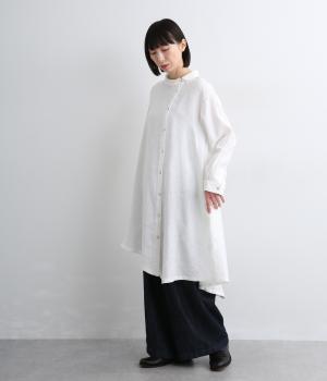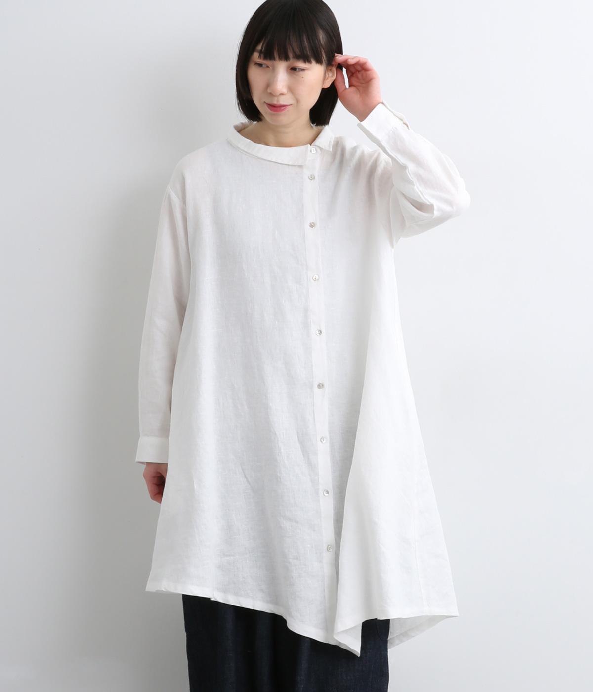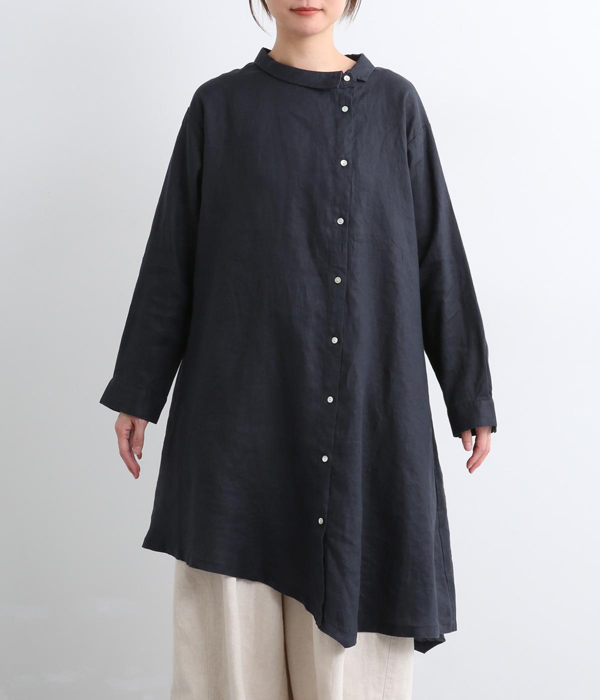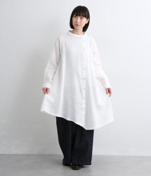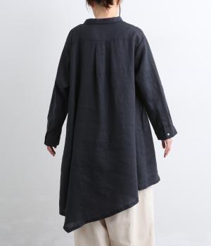 前中心をずらしたアシンメトリーなシルエットが目を惹くチュニックシャツ。フレアなシルエットにゆれる裾が動きを与えて着映え力もアップ。ガウンのように羽織ったり袖口をまくったりと、ラフに着こなしても素敵です。