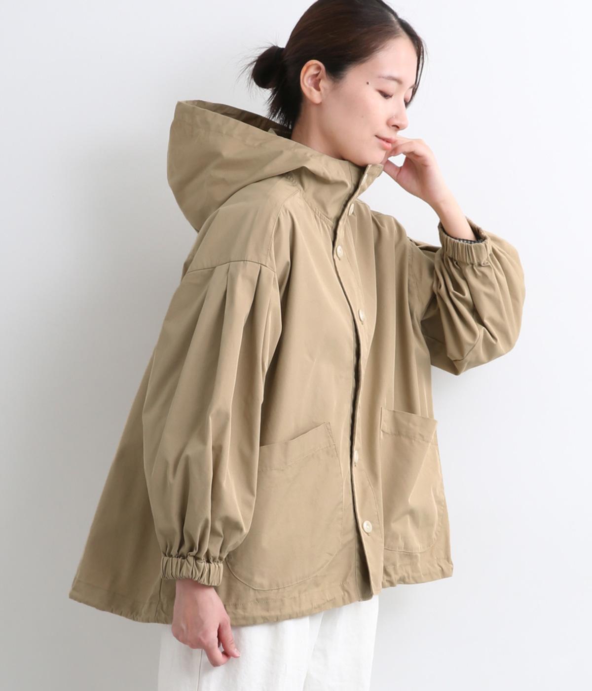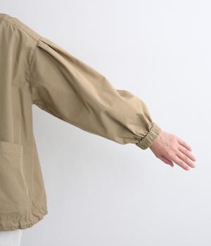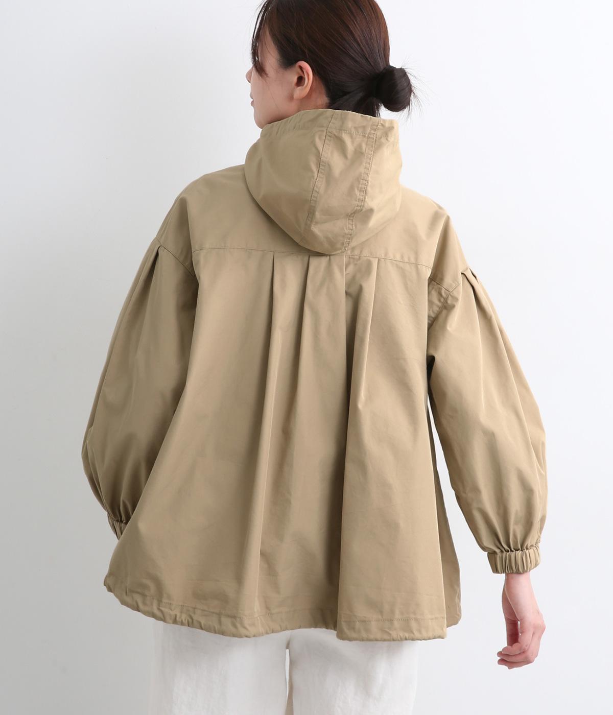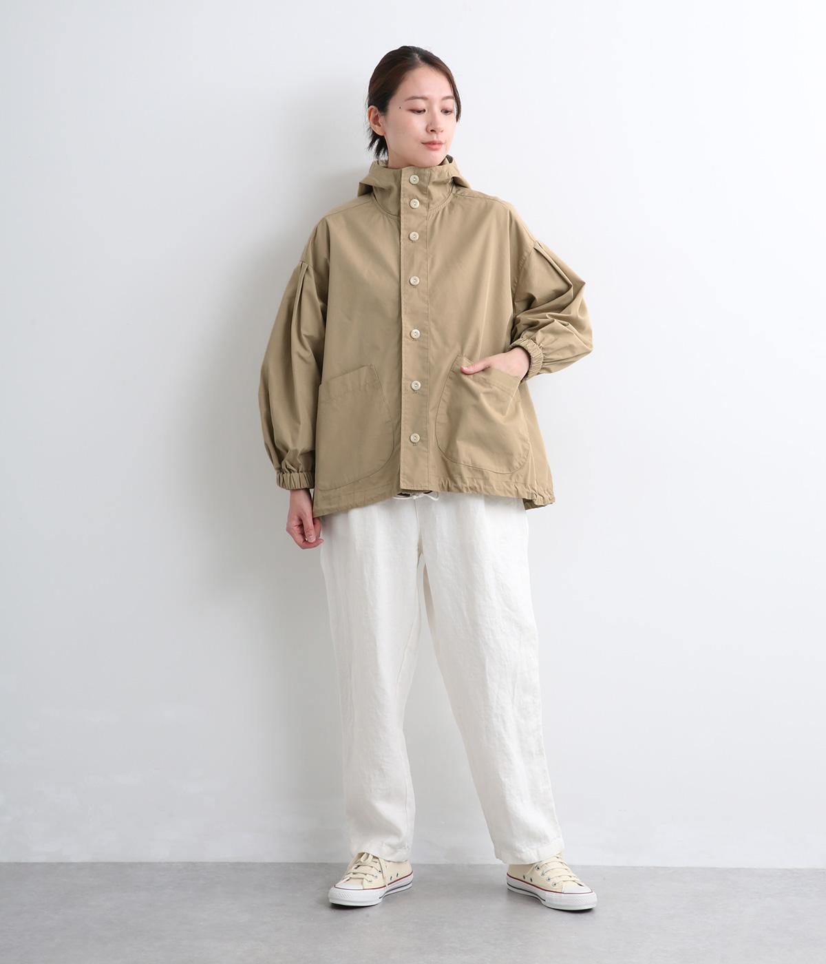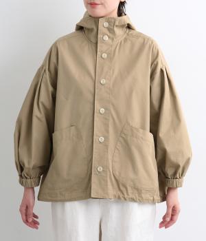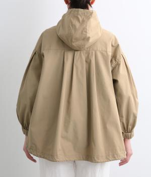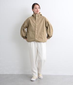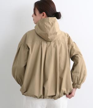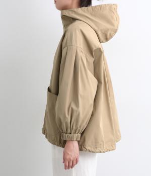 カジュアルテイストなフードつきブルゾンにふっくらとしたタックスリーブをあわせて女性らしい要素を追加。ゆったりしたシルエットは裾のコードでアレンジがたのしめ、ハリのある素材が立体的にみせます。袖口ゴムでたくし上げもイージー。