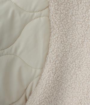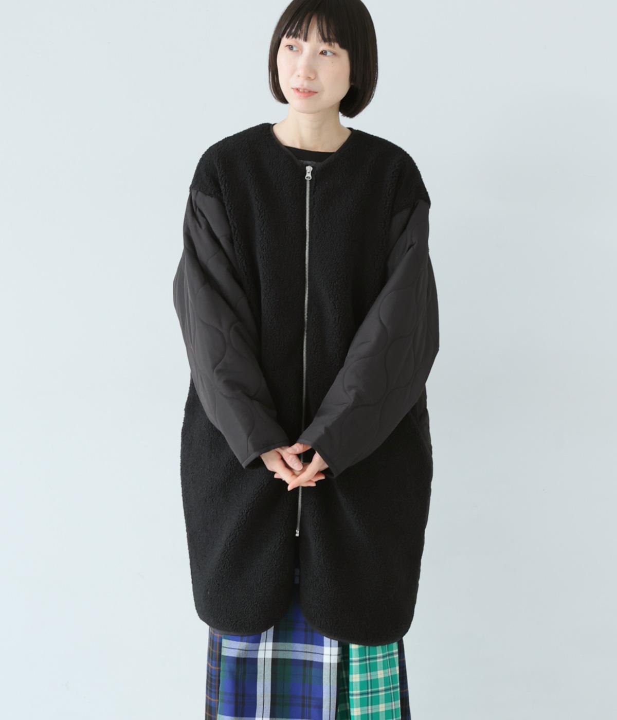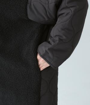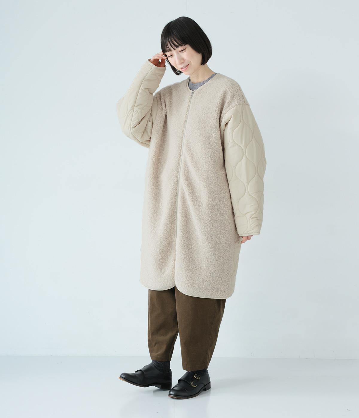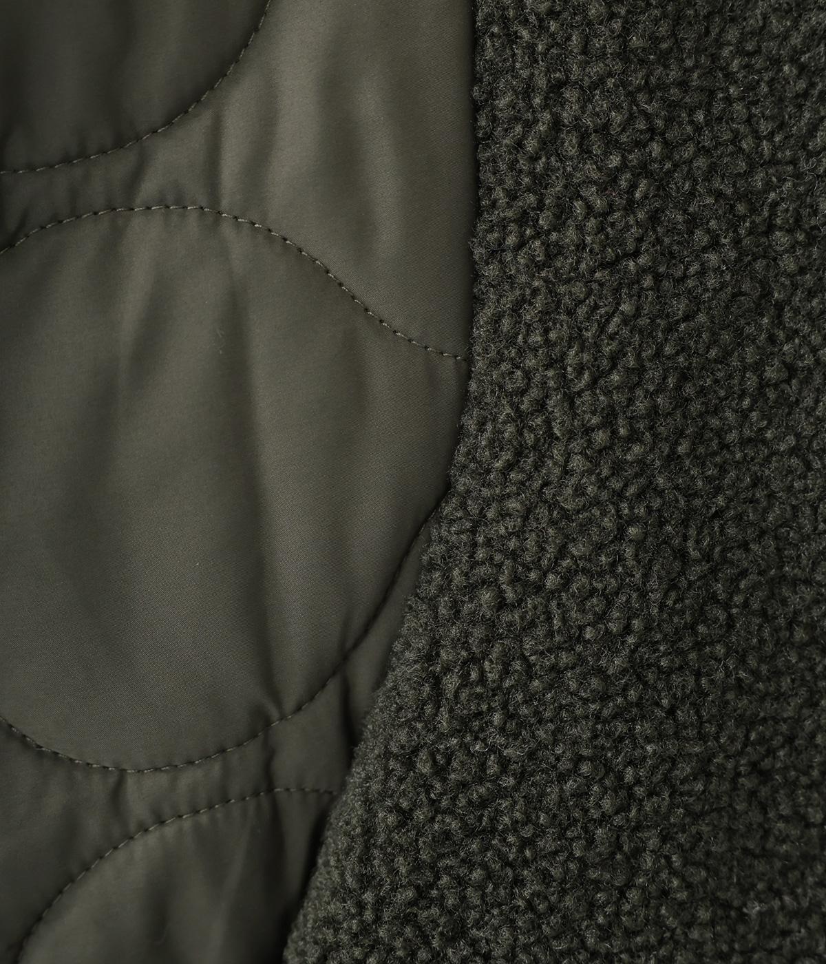 身頃にボア生地を使って、見た目も着心地もあたたかく仕上げた一枚。袖はひょうたん柄のキルティング生地で、すっきりとした印象に仕上げています。軽くて保温性のある中綿素材で、ストレスフリーに過ごすことができます。