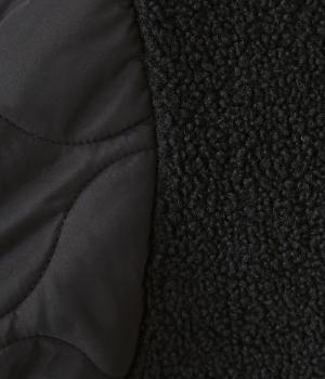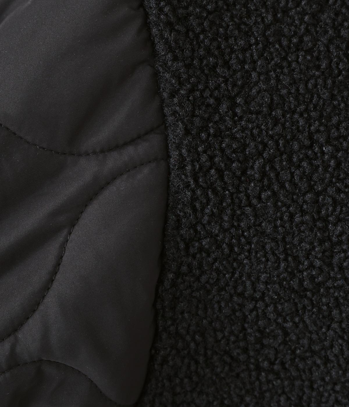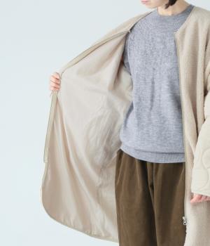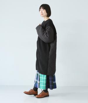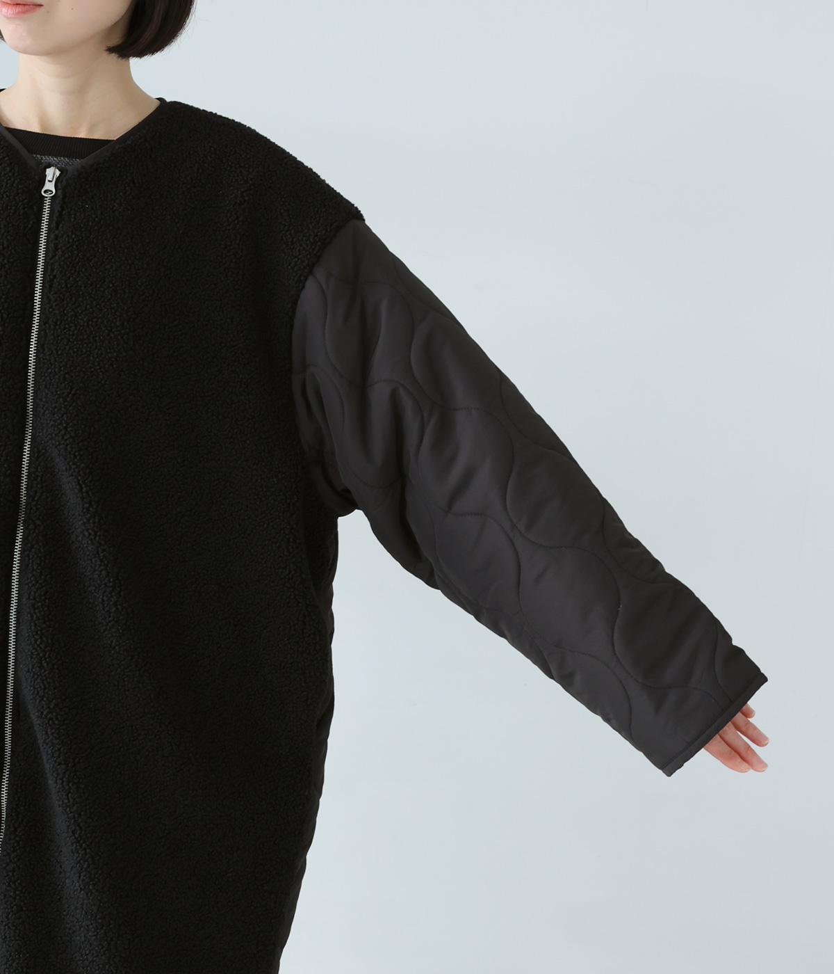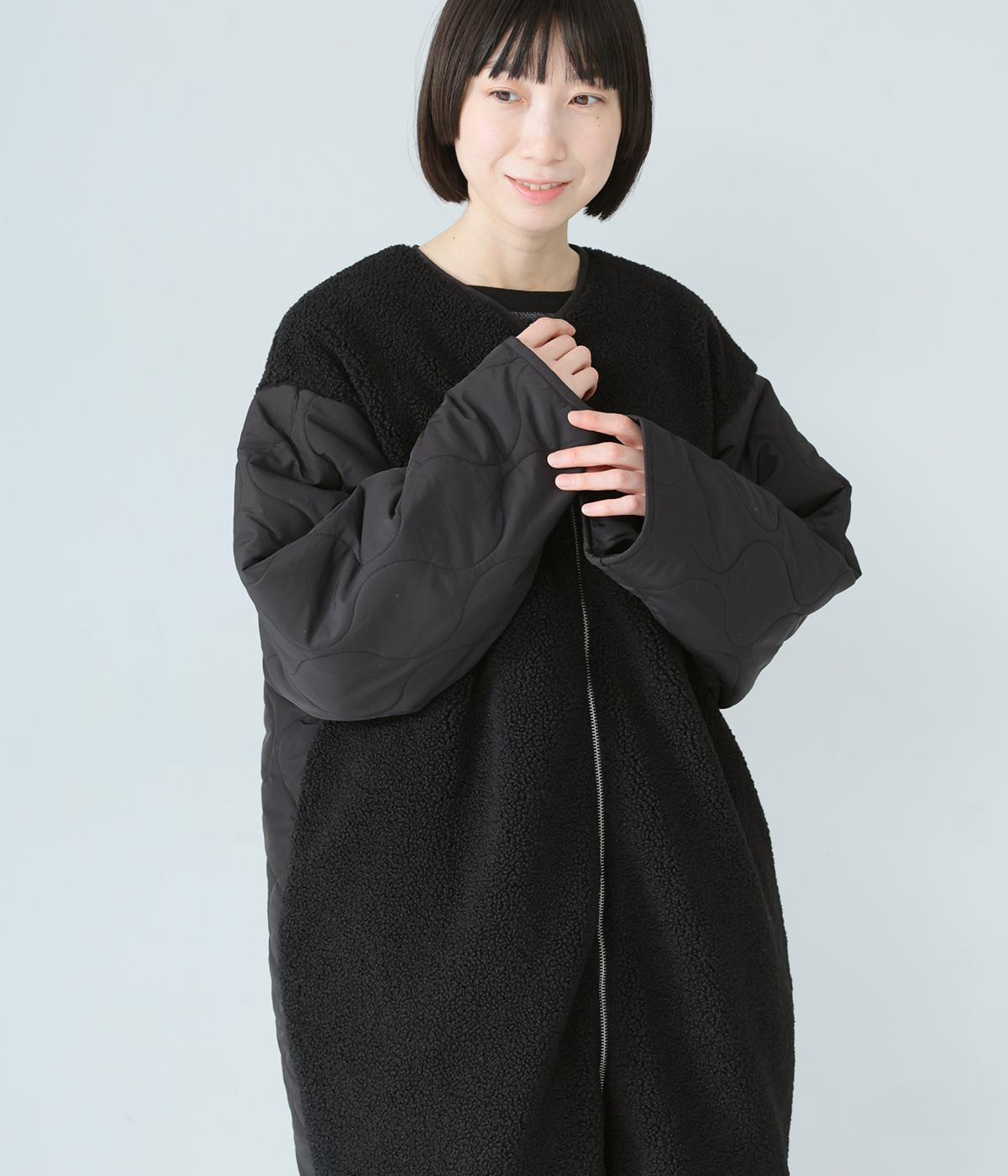 身頃にボア生地を使って、見た目も着心地もあたたかく仕上げた一枚。袖はひょうたん柄のキルティング生地で、すっきりとした印象に仕上げています。軽くて保温性のある中綿素材で、ストレスフリーに過ごすことができます。