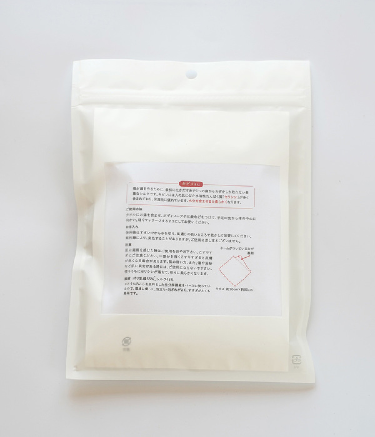 水溶性のたんぱく質を豊富に含むキビソと、トウモロコシなどから取り出したデンプンが原料のポリ乳酸を素材に使用したボディタオルです。保湿成分・セリシンがたっぷり含まれているので、肌を保湿しながらもしっかりと汚れを落としてくれます。大きすぎないサイズで扱いやすいのも嬉しいポイント。自分用として使うのはもちろん、年代や好みを問わないので贈り物にするのもおすすめです。