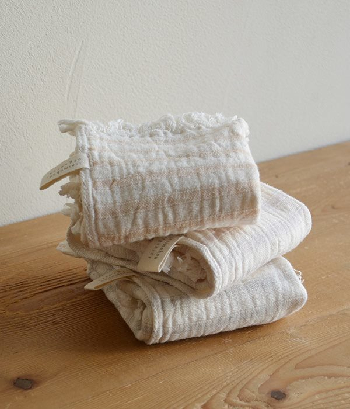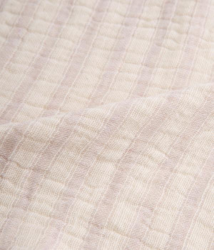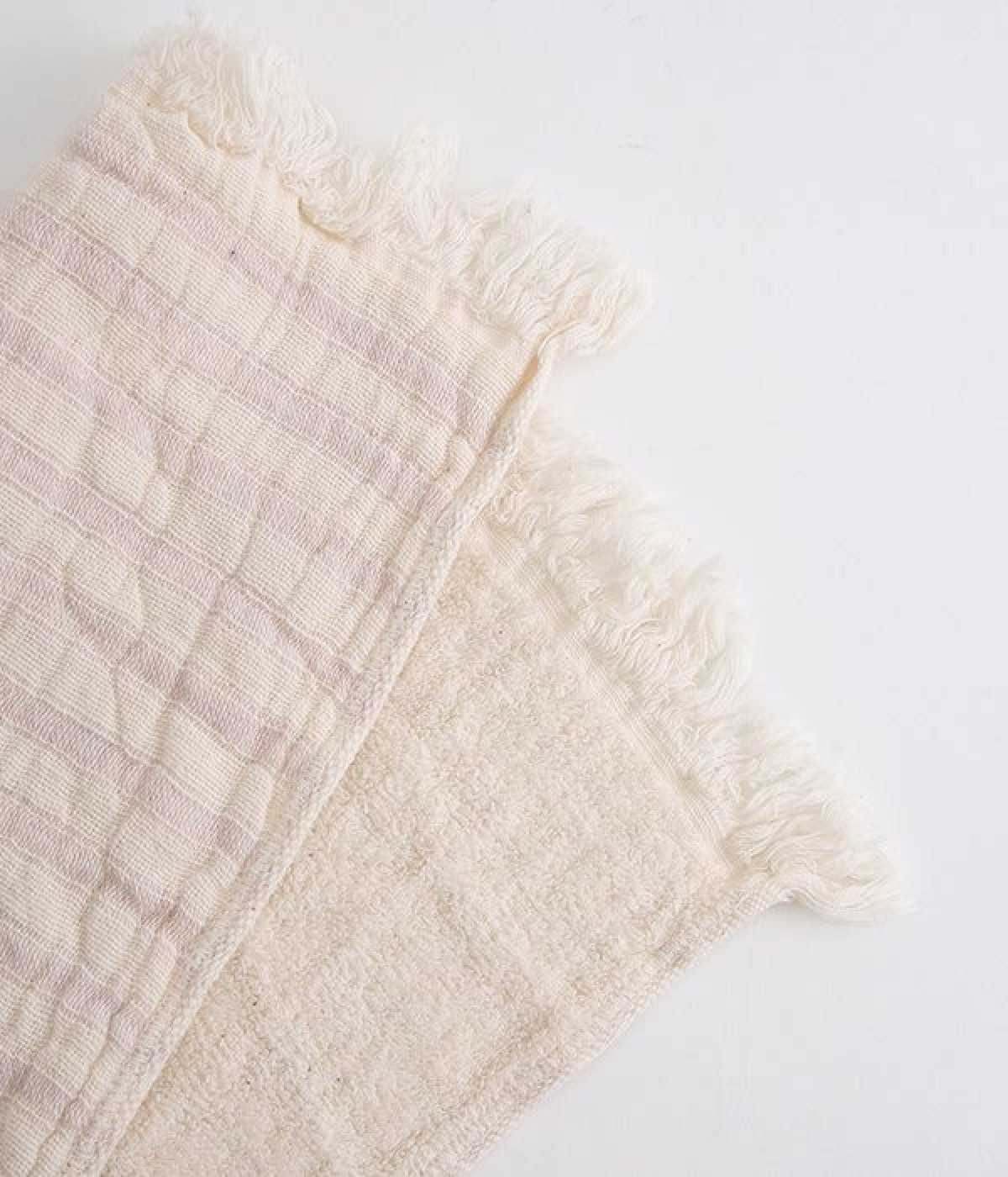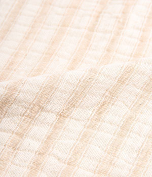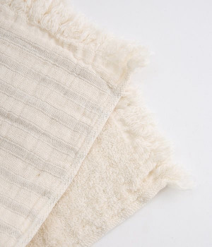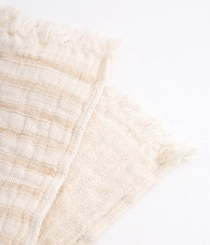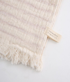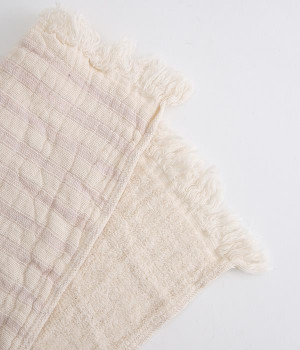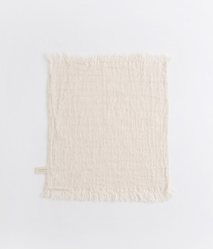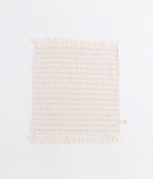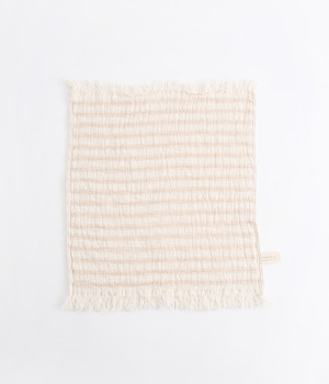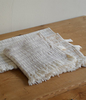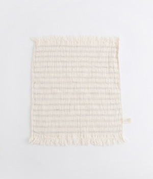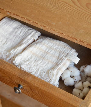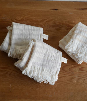 ガーゼとパイルを二重織りにしたオーガニックコットンのウォッシュタオルです。ガーゼ面のボーダー部分には一本の糸に太いところと細いところの差をつけて凹凸出した、手紡ぎ風のブランドオリジナル「スラブ糸」を使用しています。ふっくらしわしわとした風合いが気持ちの良い肌触り。軽量なのにボリュームがあるのもこのスラブ糸の特徴です。