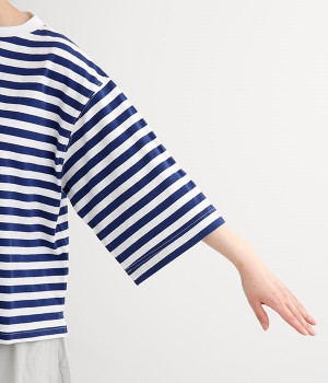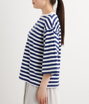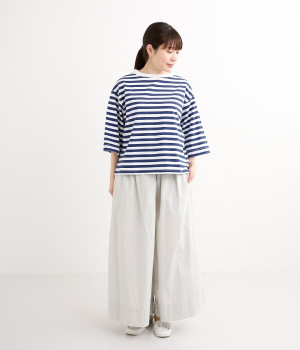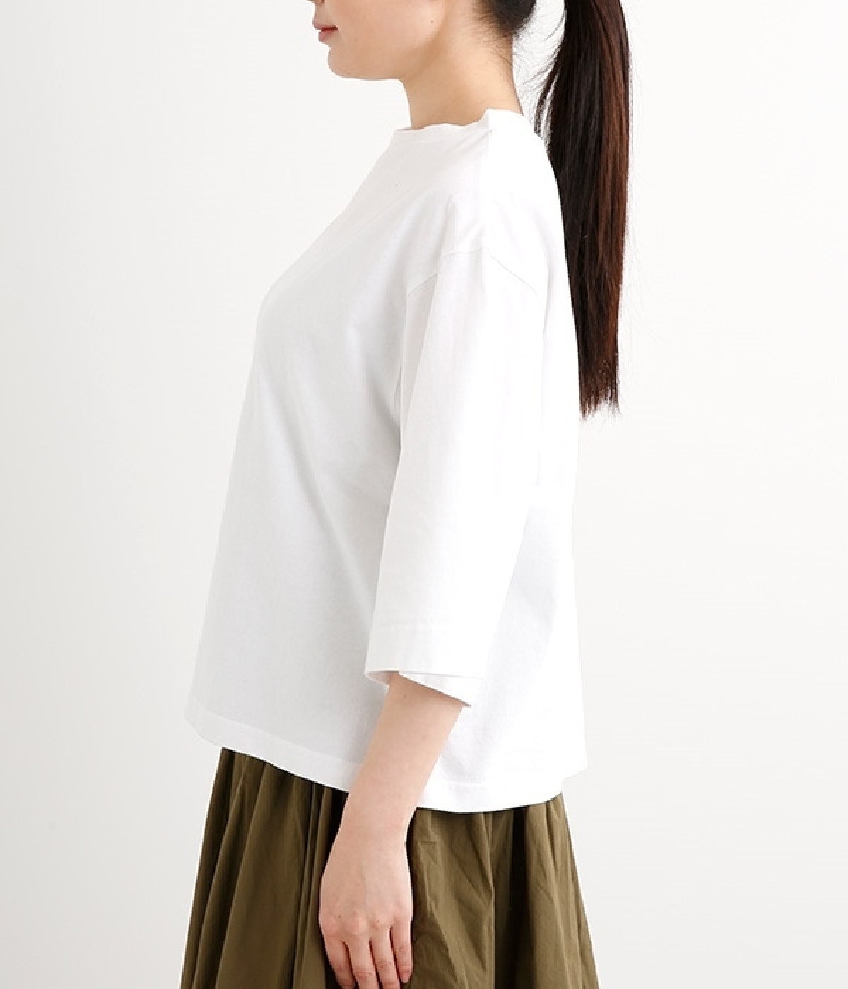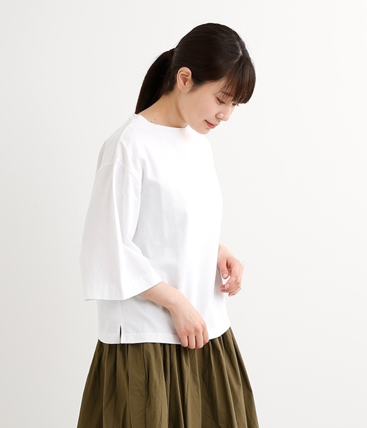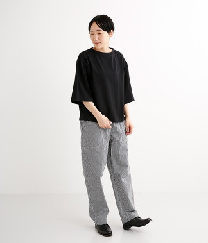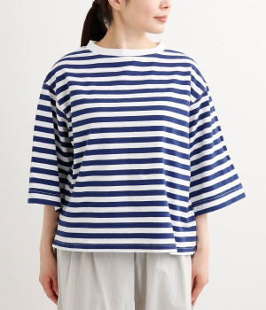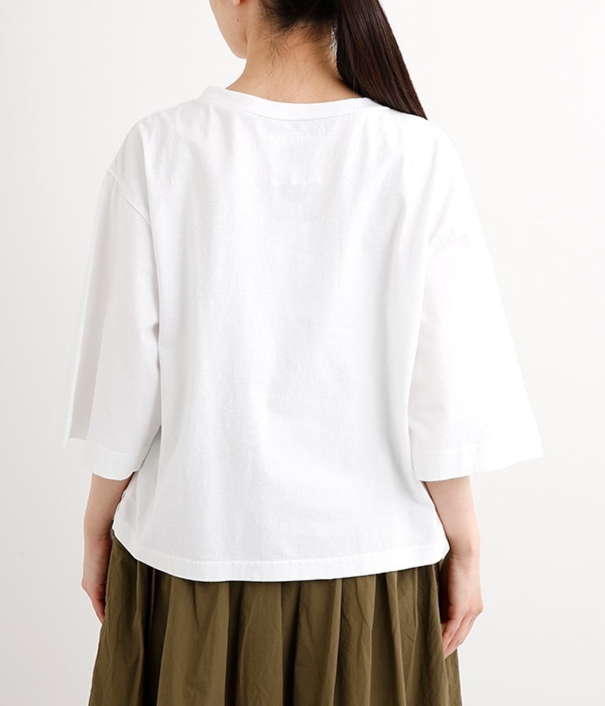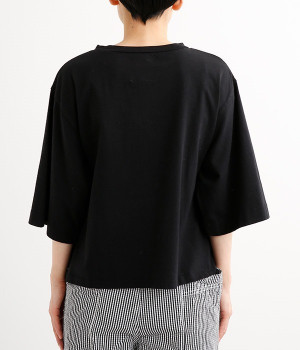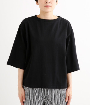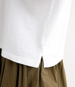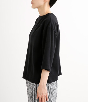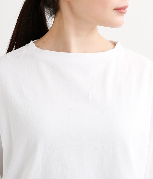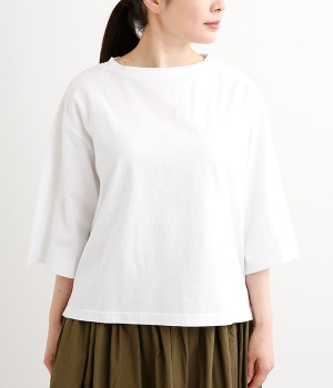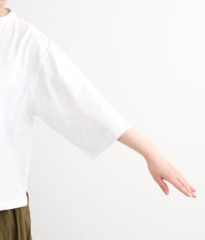ワイドな肩落ちシルエットの袖や、オーバーシルエットがラフな印象を与えるTシャツです。ふっくらと柔らかで伸縮性のあるコットン素材で着心地も抜群。ボリュームがありながら、短めの着丈ややや立ち上がったクルーネックがすっきり見せるポイントに。ワイドパンツやマキシ丈スカートとのリラックスした着こなしもおすすめです。