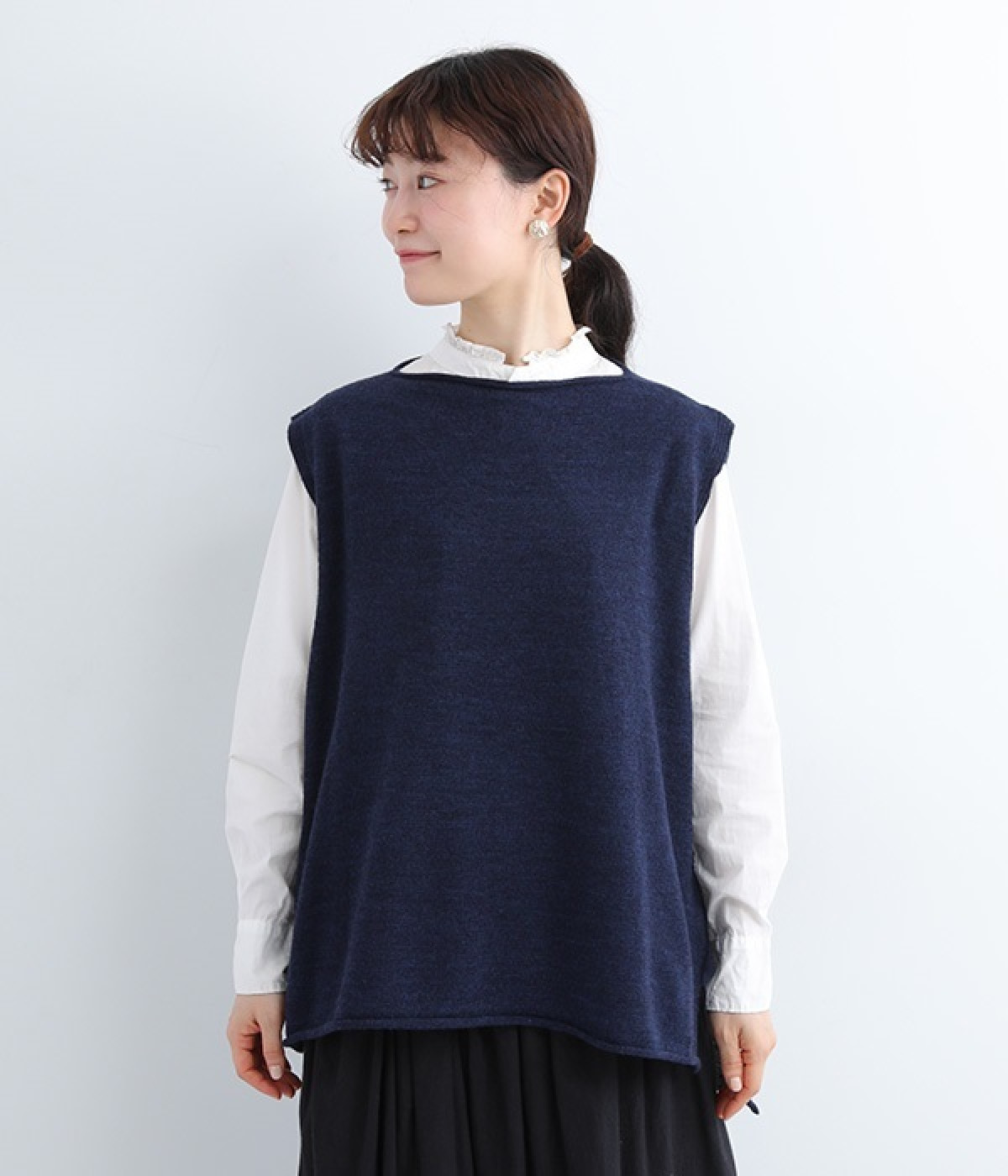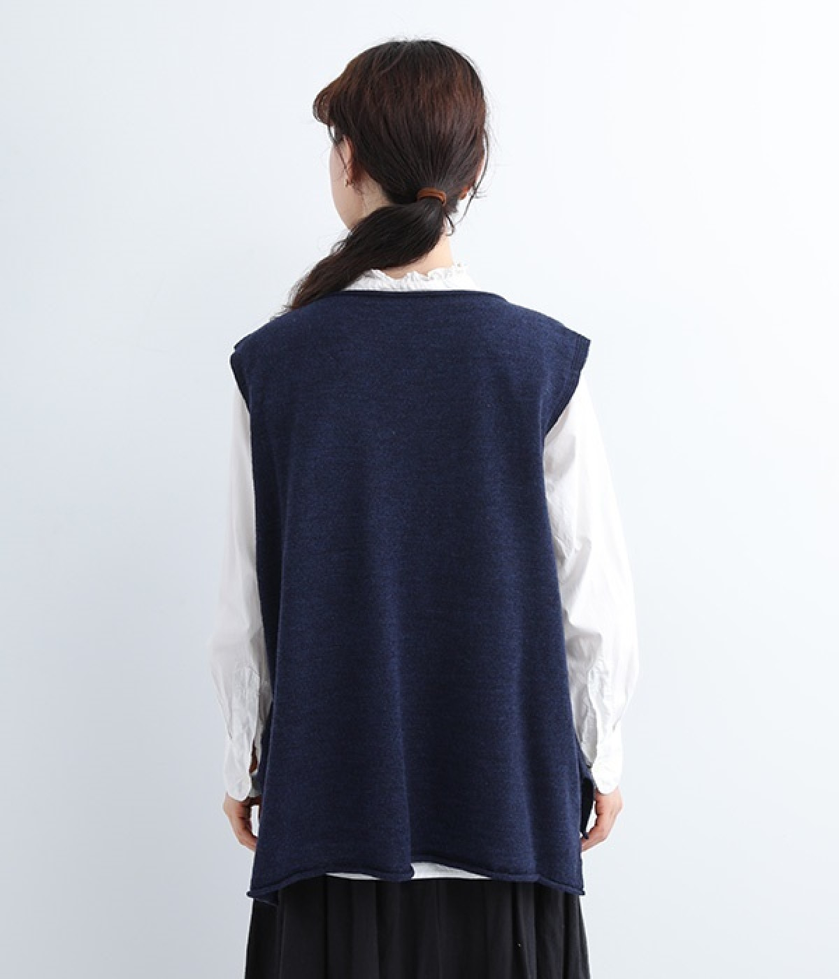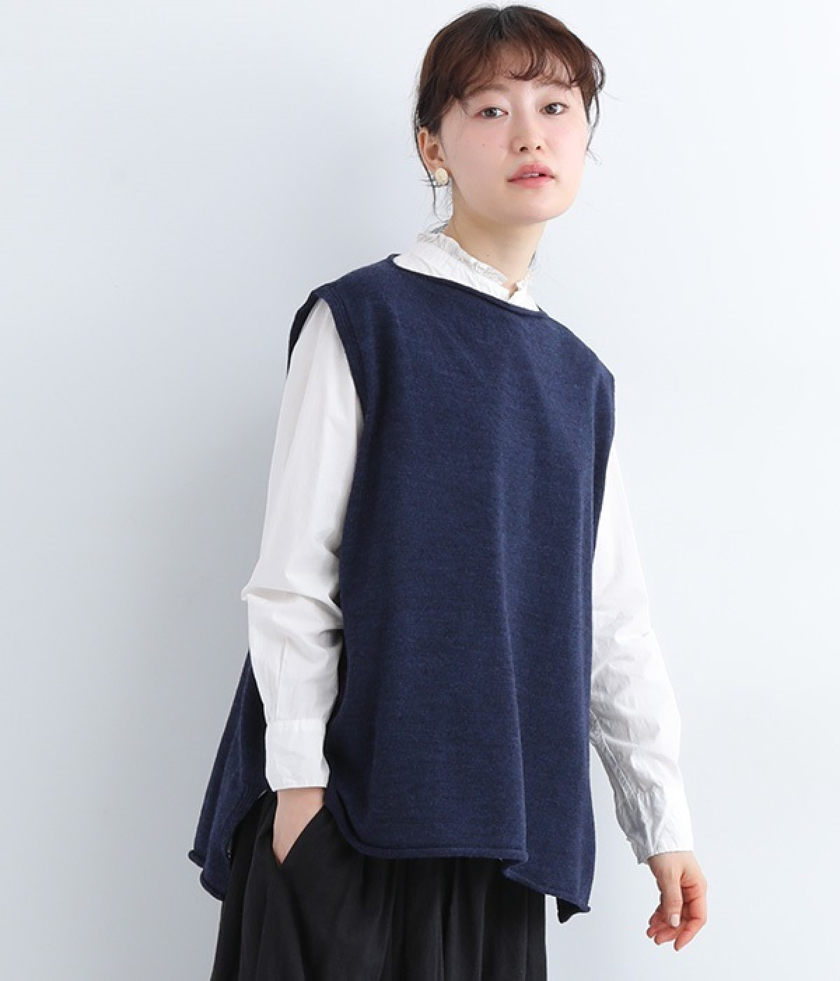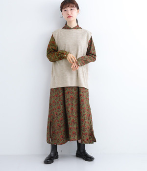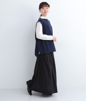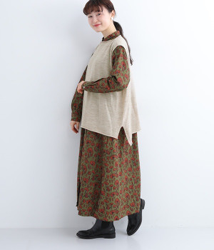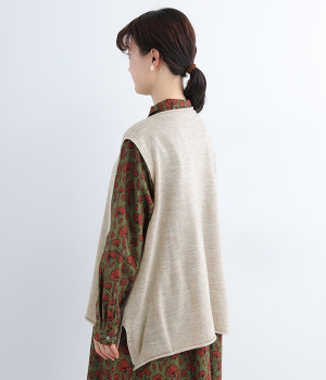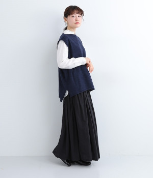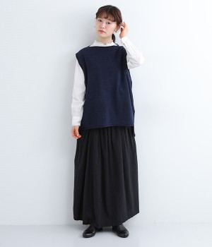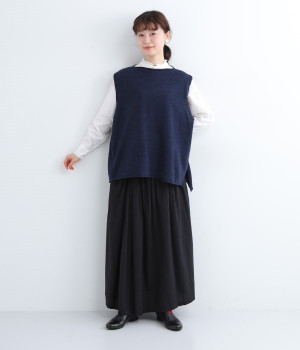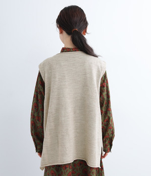 やわらかく繊細なタッチの国産ウールをぜいたくに使用し、丁寧に編み立てたベスト。アームホールとスリット部分はリブ編みを取り入れ、見た目のアクセントと耐久性を両立させました。ネックと裾まわりはカールさせてちょっぴりカジュアルな細工も◎。着ている感覚がないほどに軽量の仕上がりなので、気兼ねなくスタイリングにプラスオンできます。無地同士の装いで奥行き感を出したり、総柄の分量をおさえるのに使ったりと着まわしも多彩です。