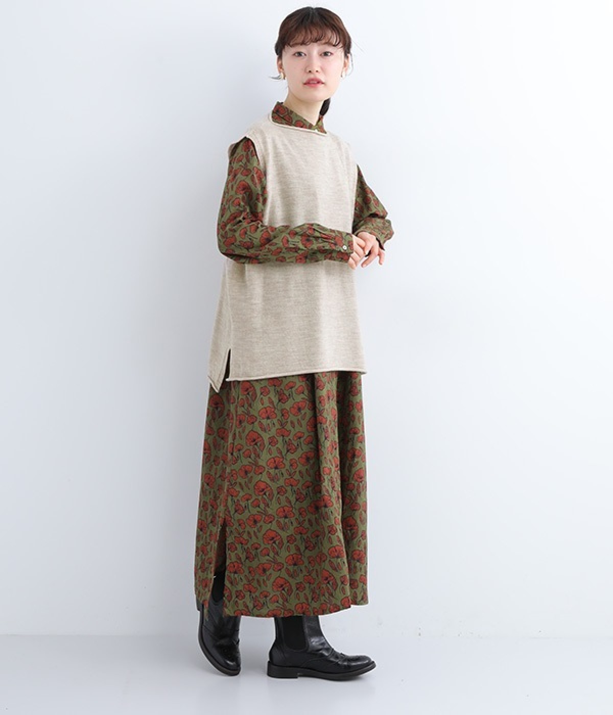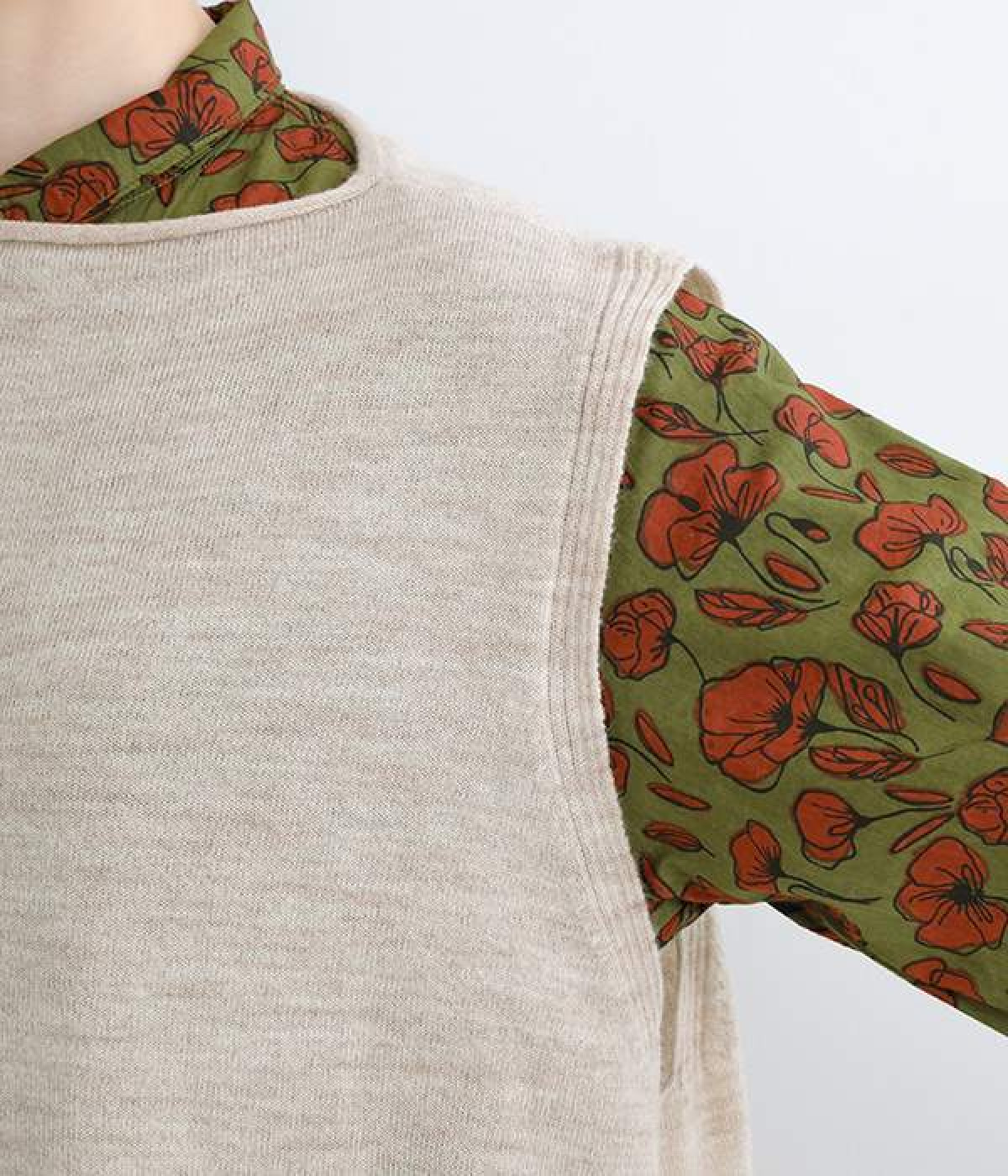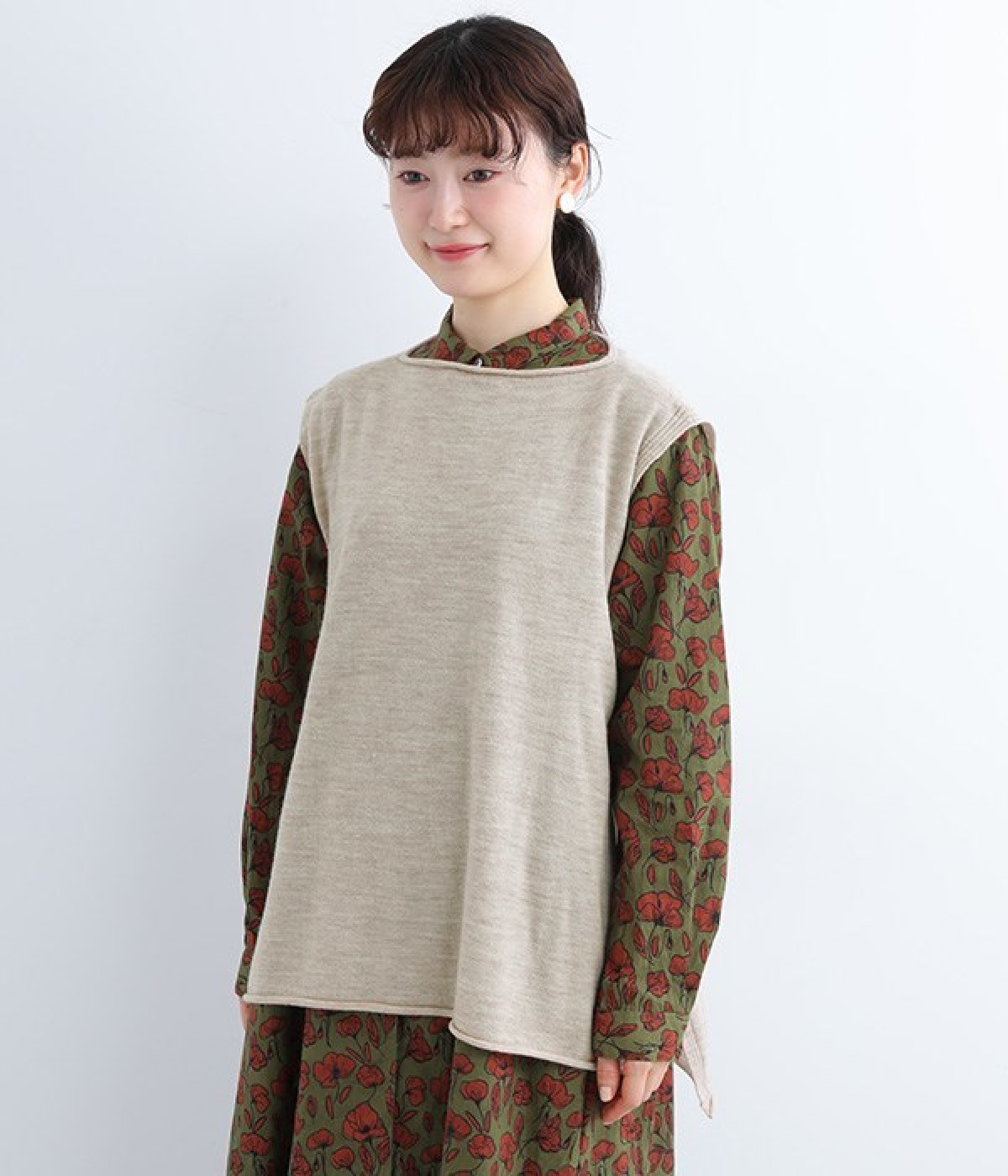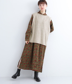 やわらかく繊細なタッチの国産ウールをぜいたくに使用し、丁寧に編み立てたベスト。アームホールとスリット部分はリブ編みを取り入れ、見た目のアクセントと耐久性を両立させました。ネックと裾まわりはカールさせてちょっぴりカジュアルな細工も◎。着ている感覚がないほどに軽量の仕上がりなので、気兼ねなくスタイリングにプラスオンできます。無地同士の装いで奥行き感を出したり、総柄の分量をおさえるのに使ったりと着まわしも多彩です。