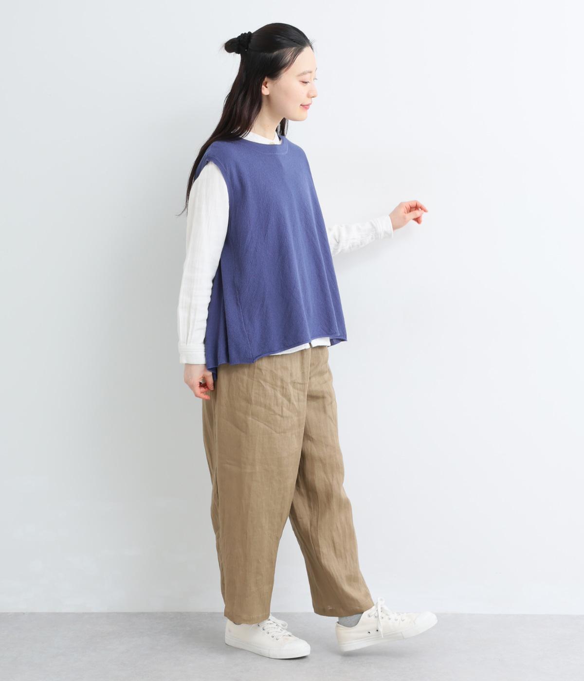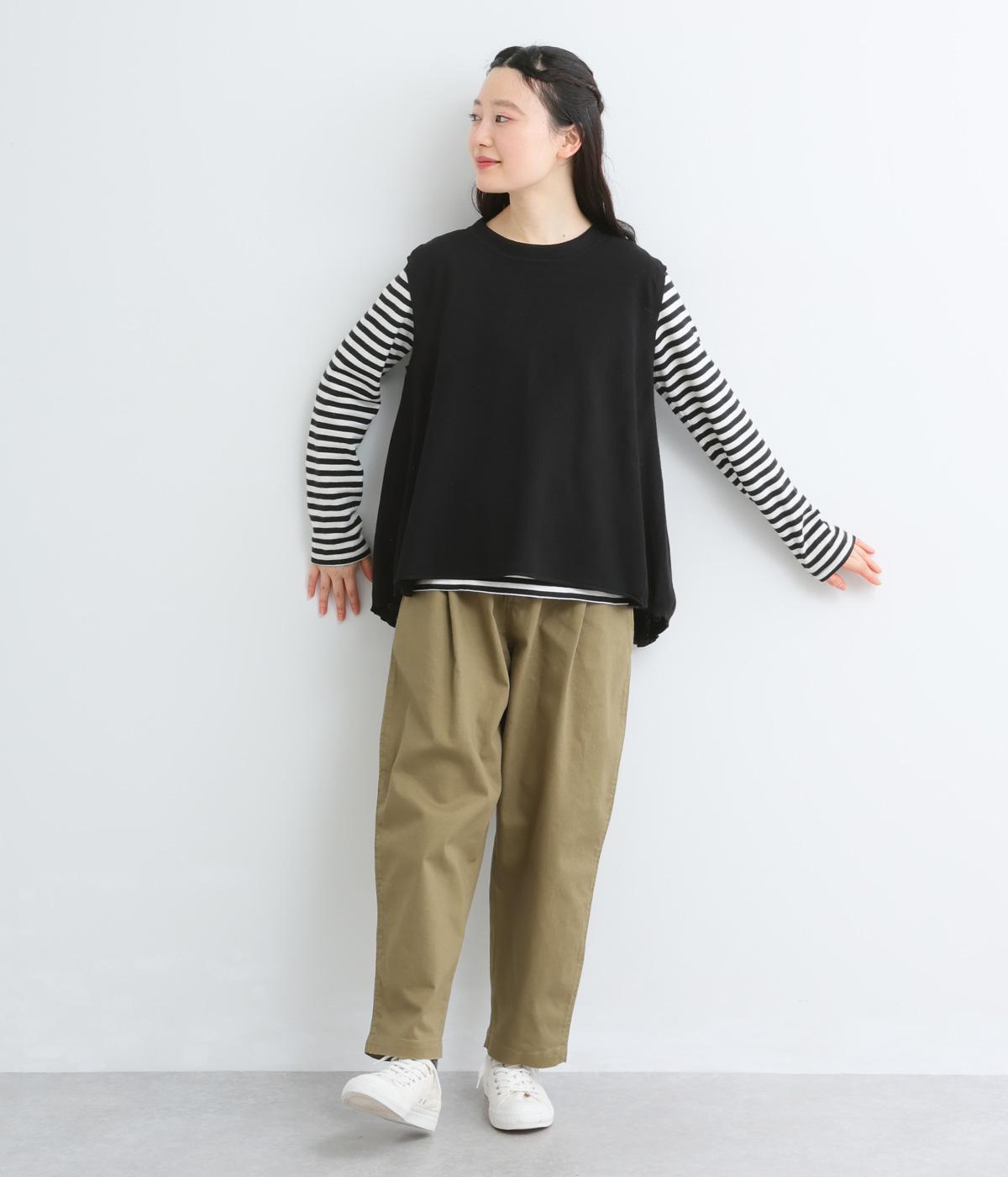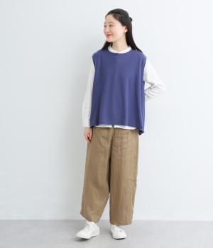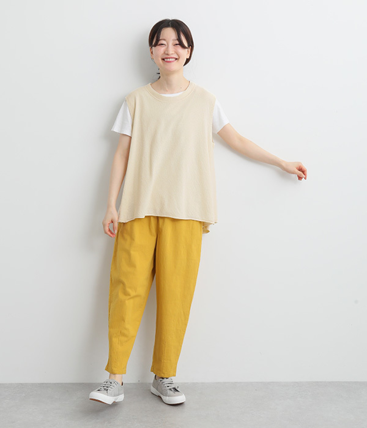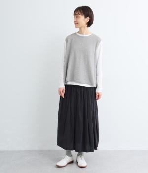 やわらかなコットンの手ざわりが心地よく肌になじみます。伸縮性があり、ふわりと軽やかな素材感です。優しいナチュラルな雰囲気です。