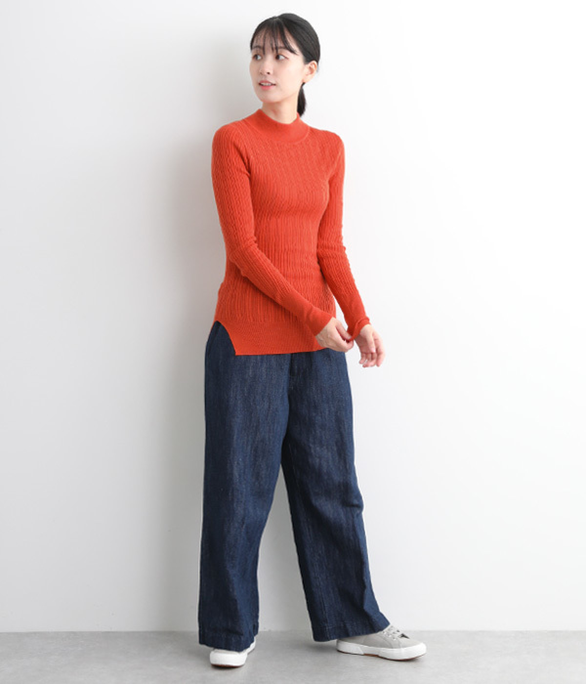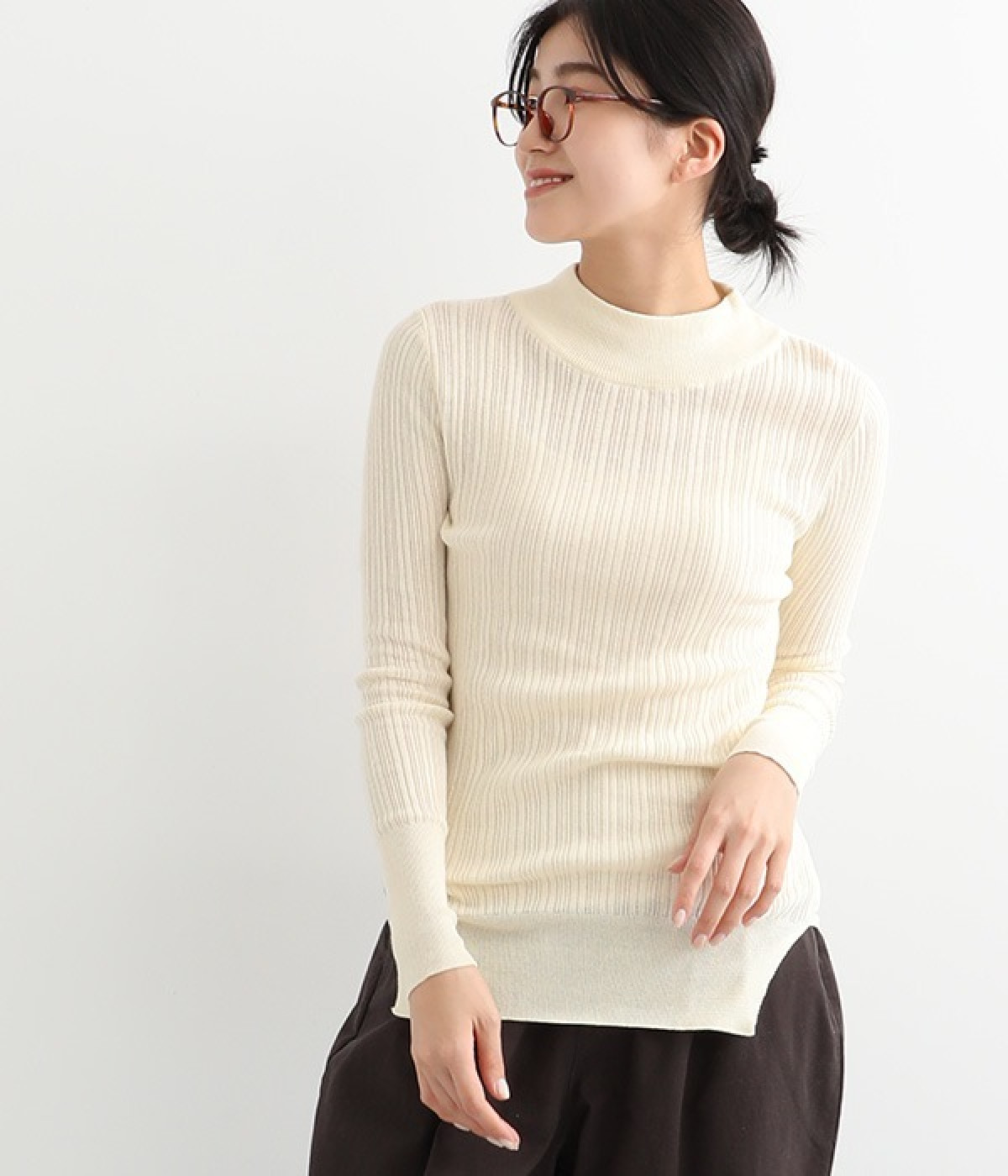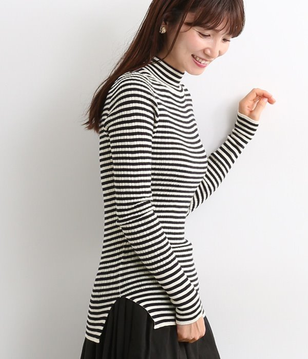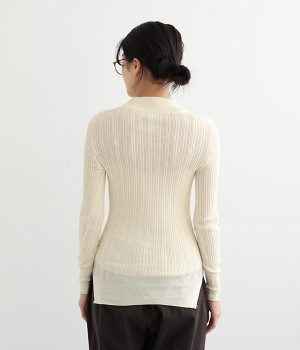 抜群の伸縮性と柔らかな肌触りが魅力の、表情豊かなランダムテレコを使用したモックネックのプルオーバーです。プルオーバーやカーディガンと重ねた際に、襟ぐりからのぞかせたりと配色を楽しむことができます。裾をしっかり入れるとお腹まわりの冷え対策にも◎。
