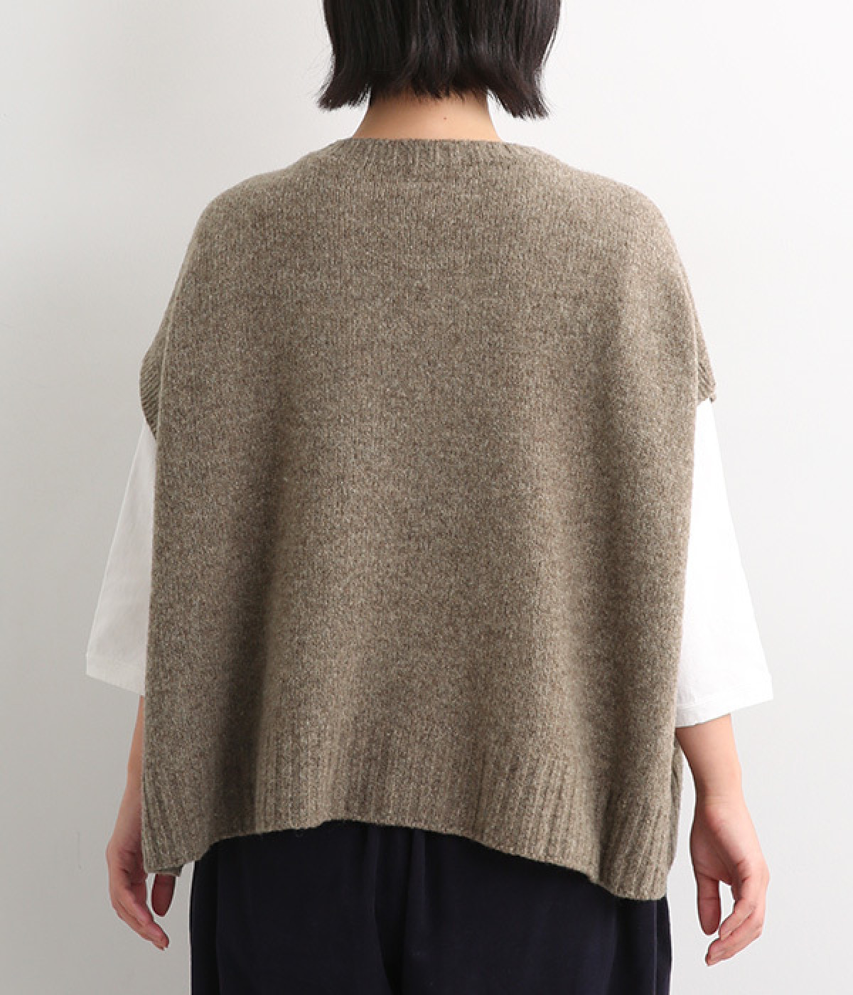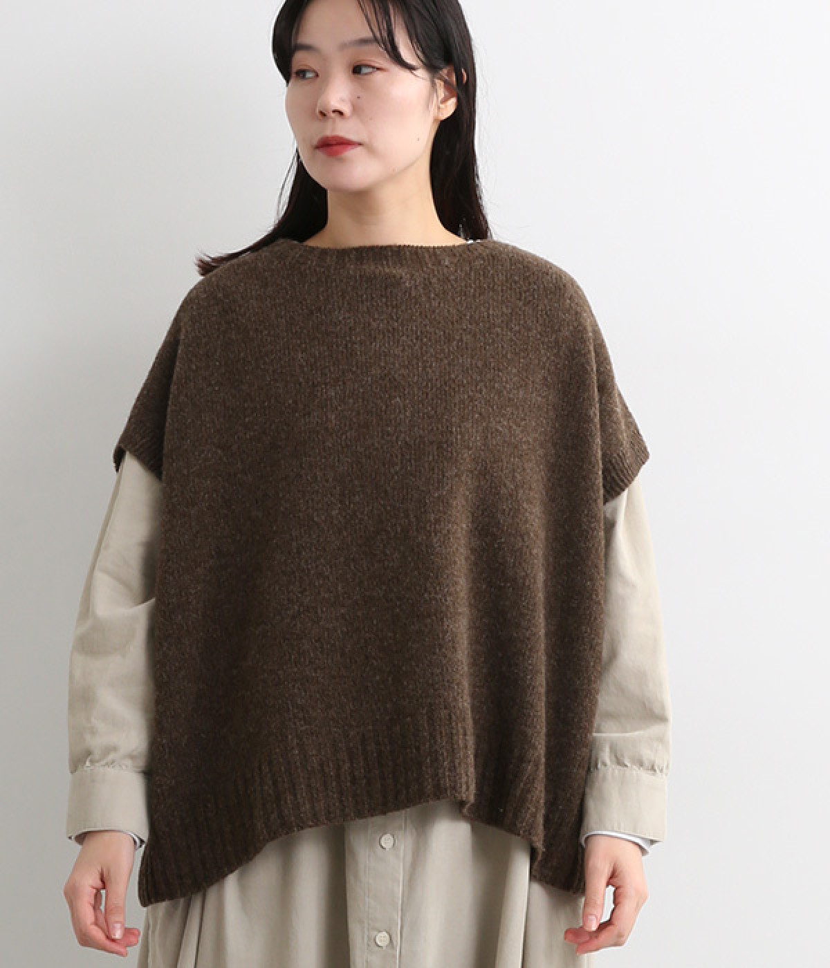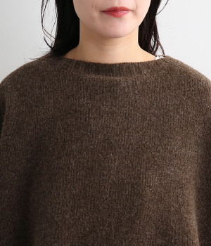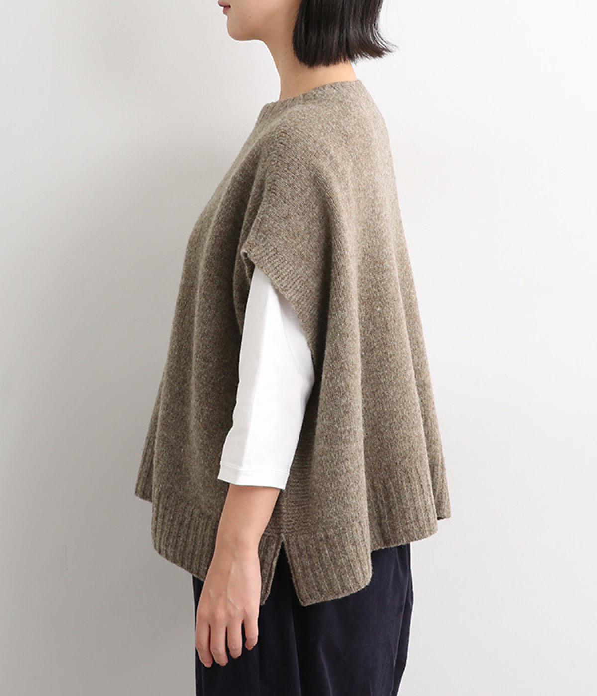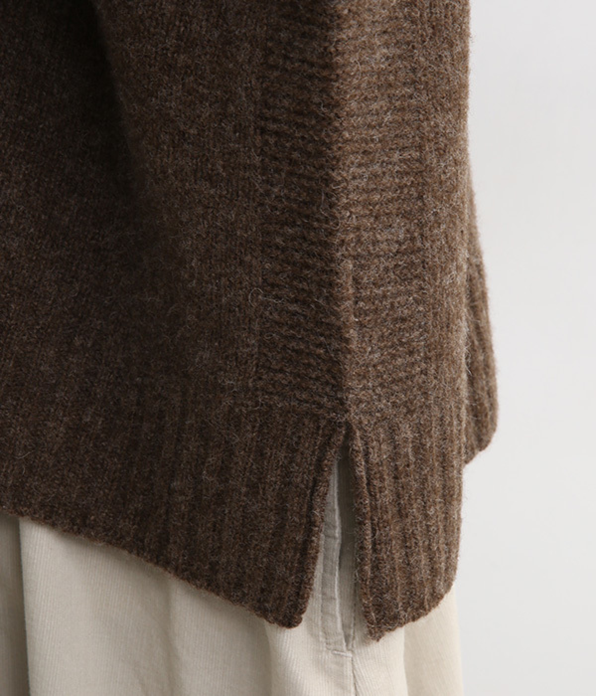 脇のガーター編みや裾のリブ使いが、着こなしにアクセントをプラス