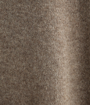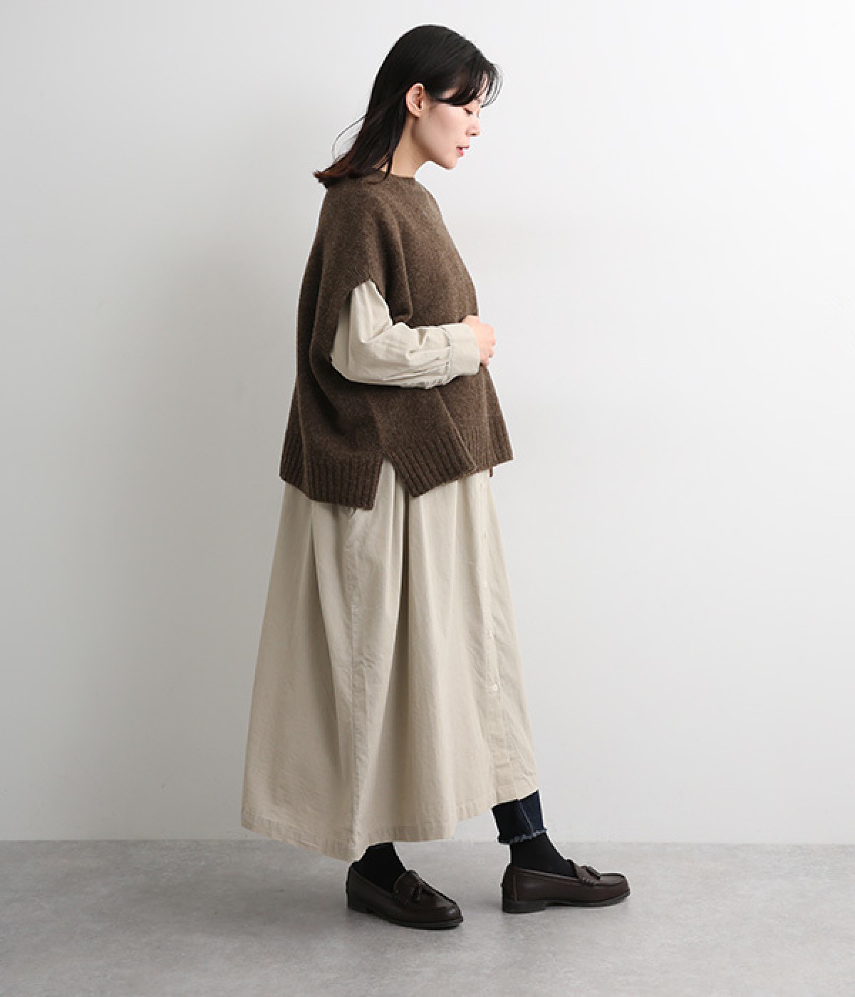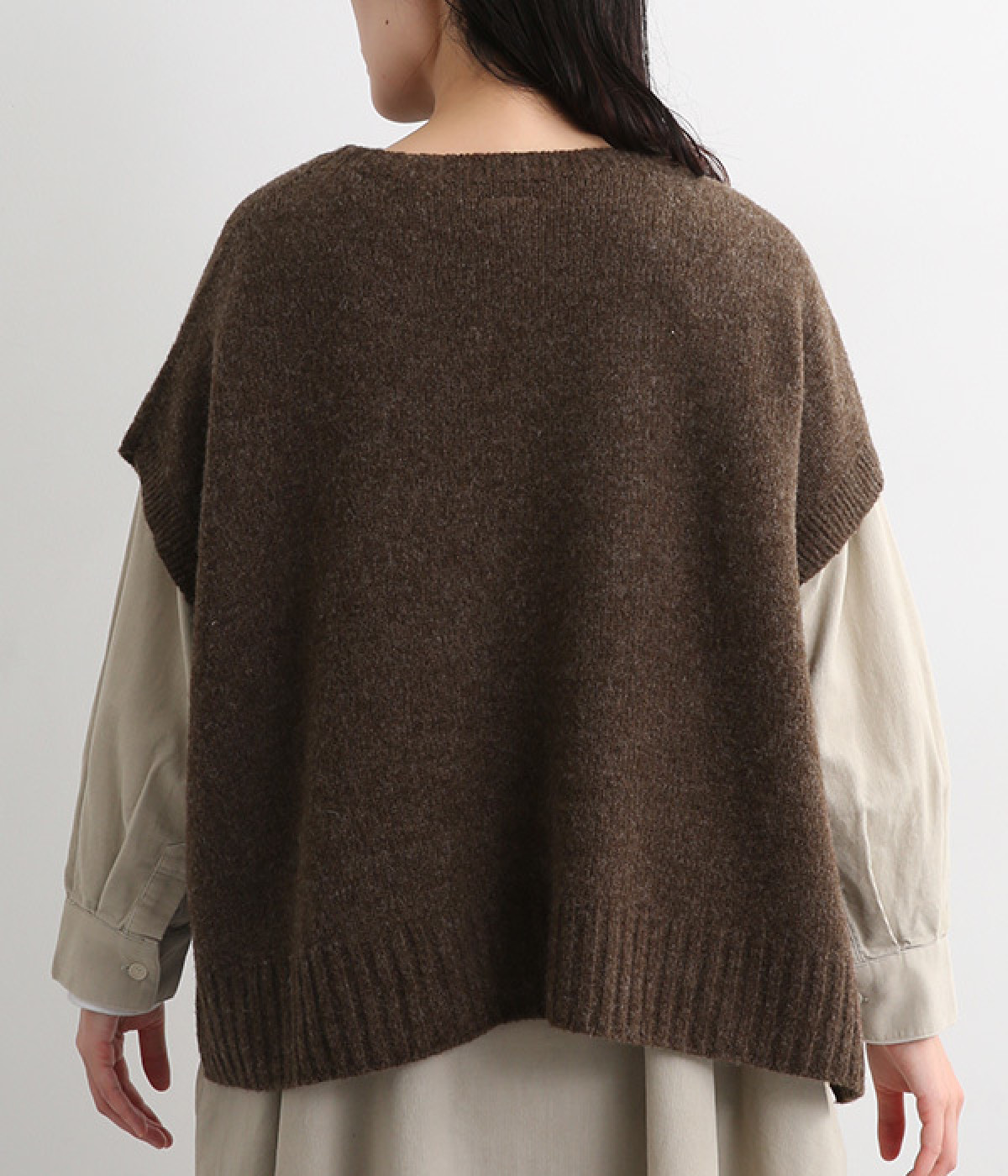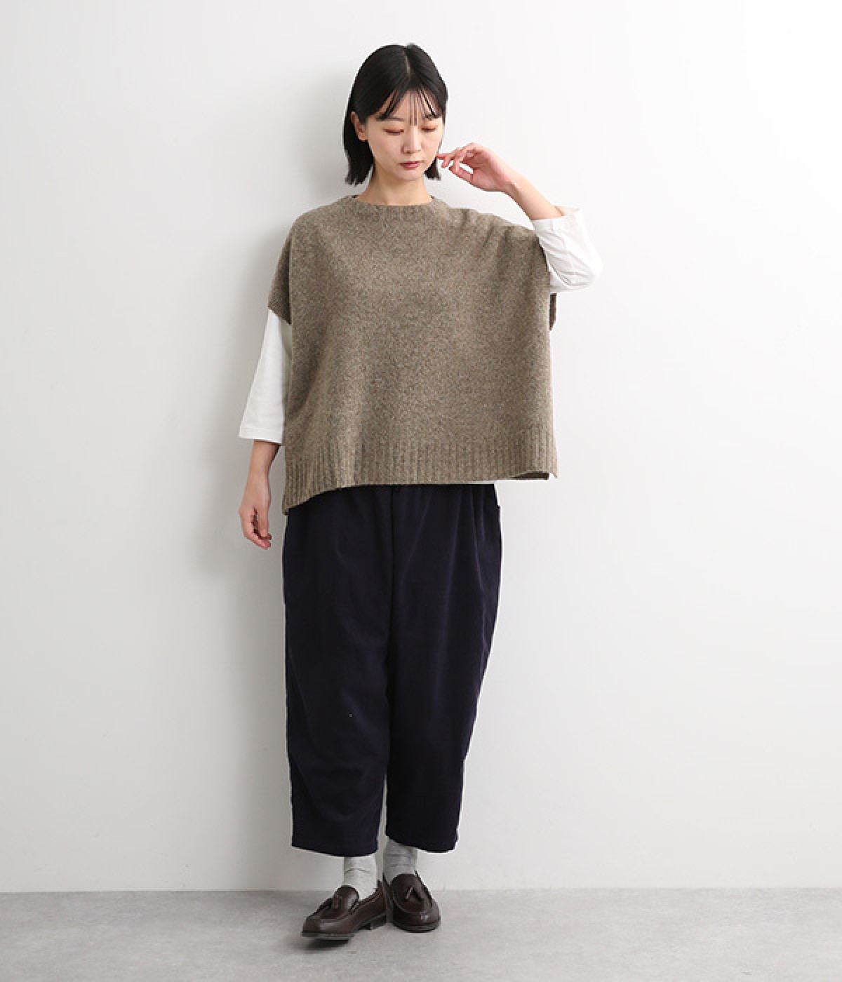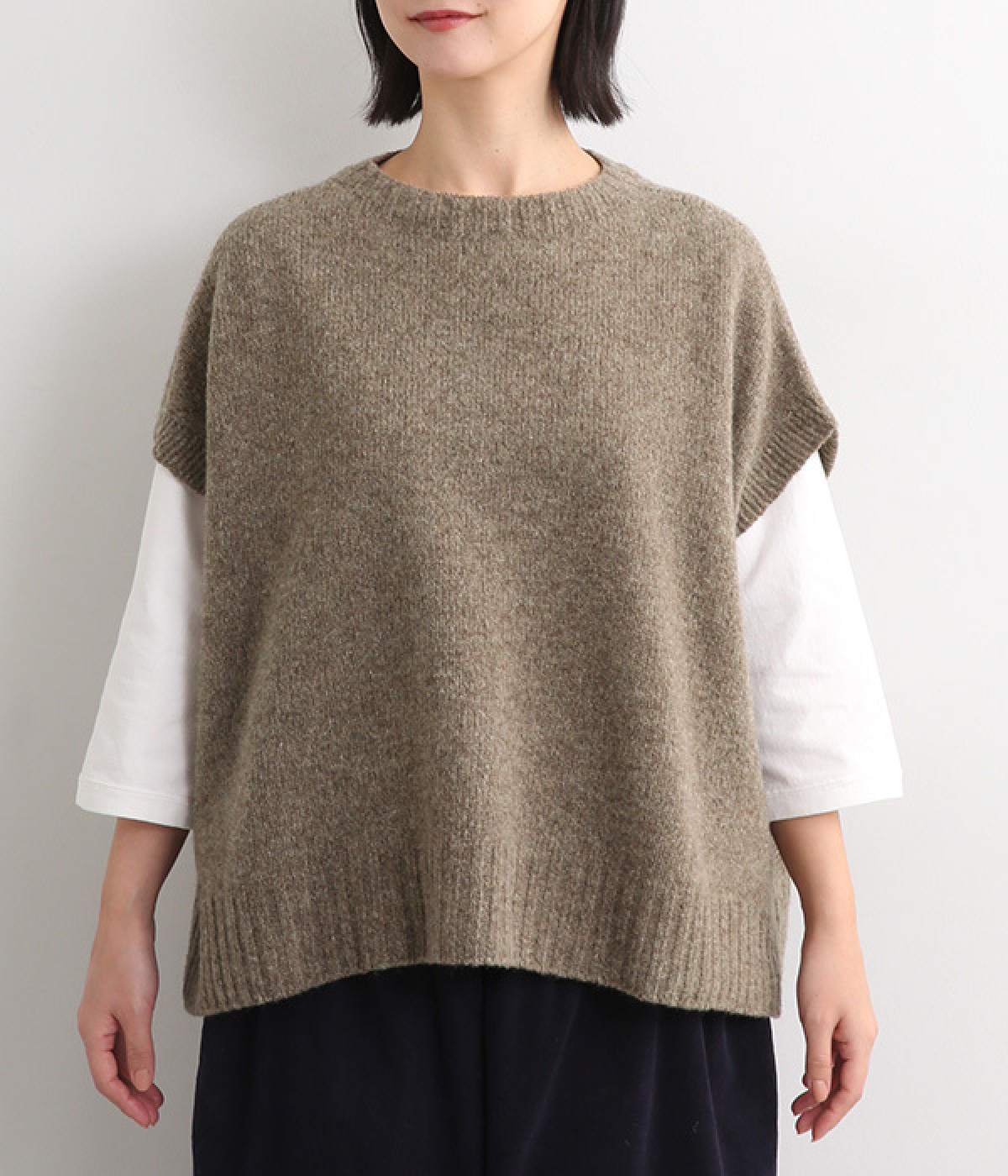 脇のガーター編みや裾のリブ使いが、着こなしにアクセントをプラス