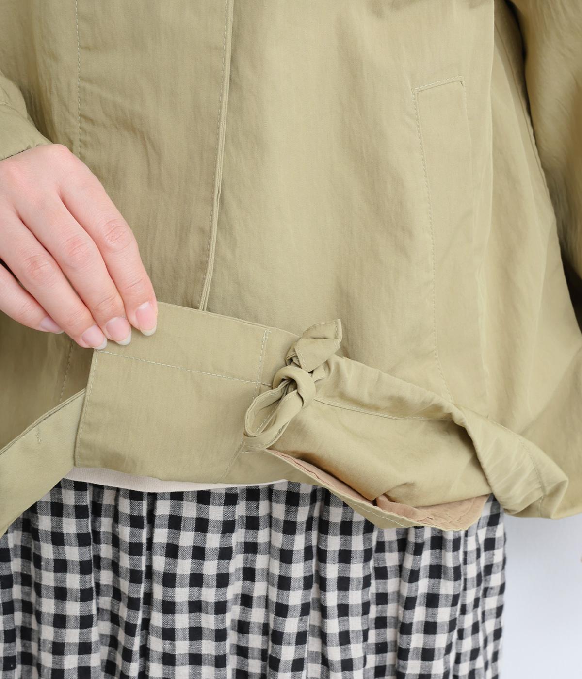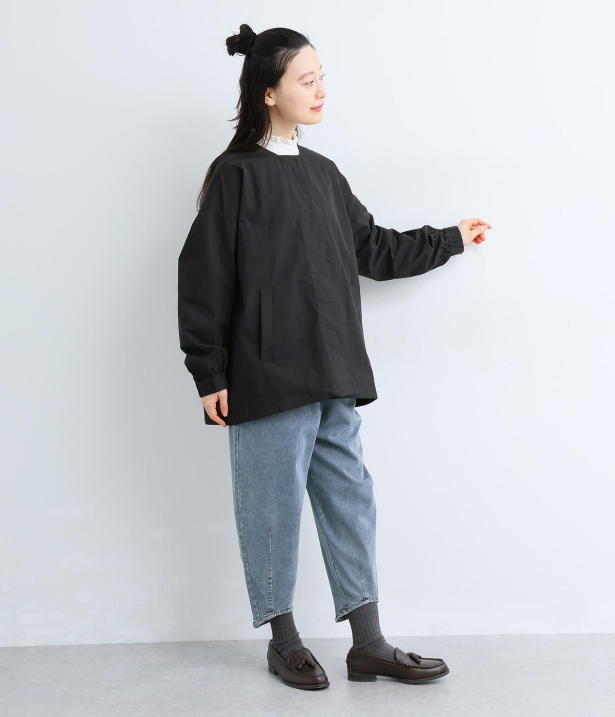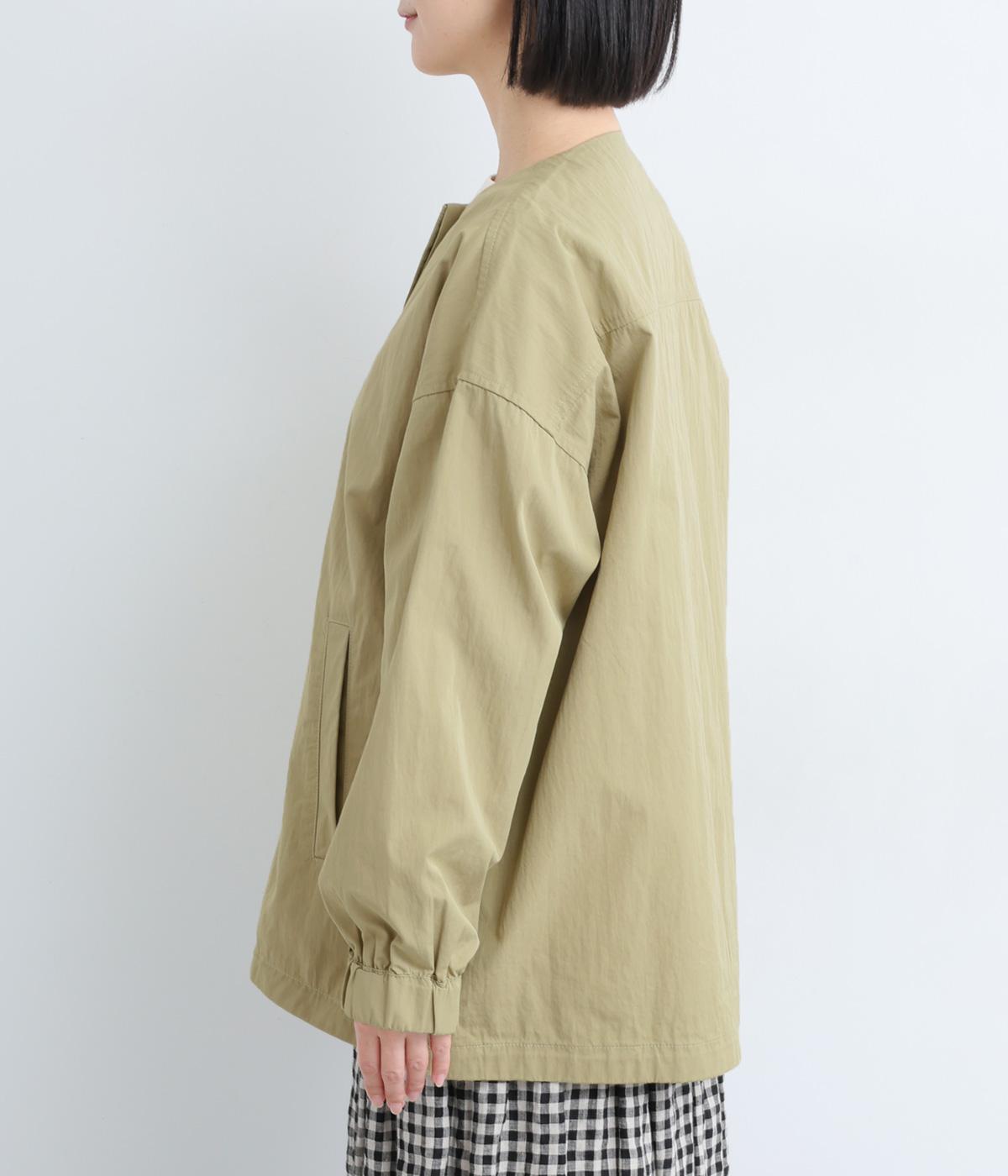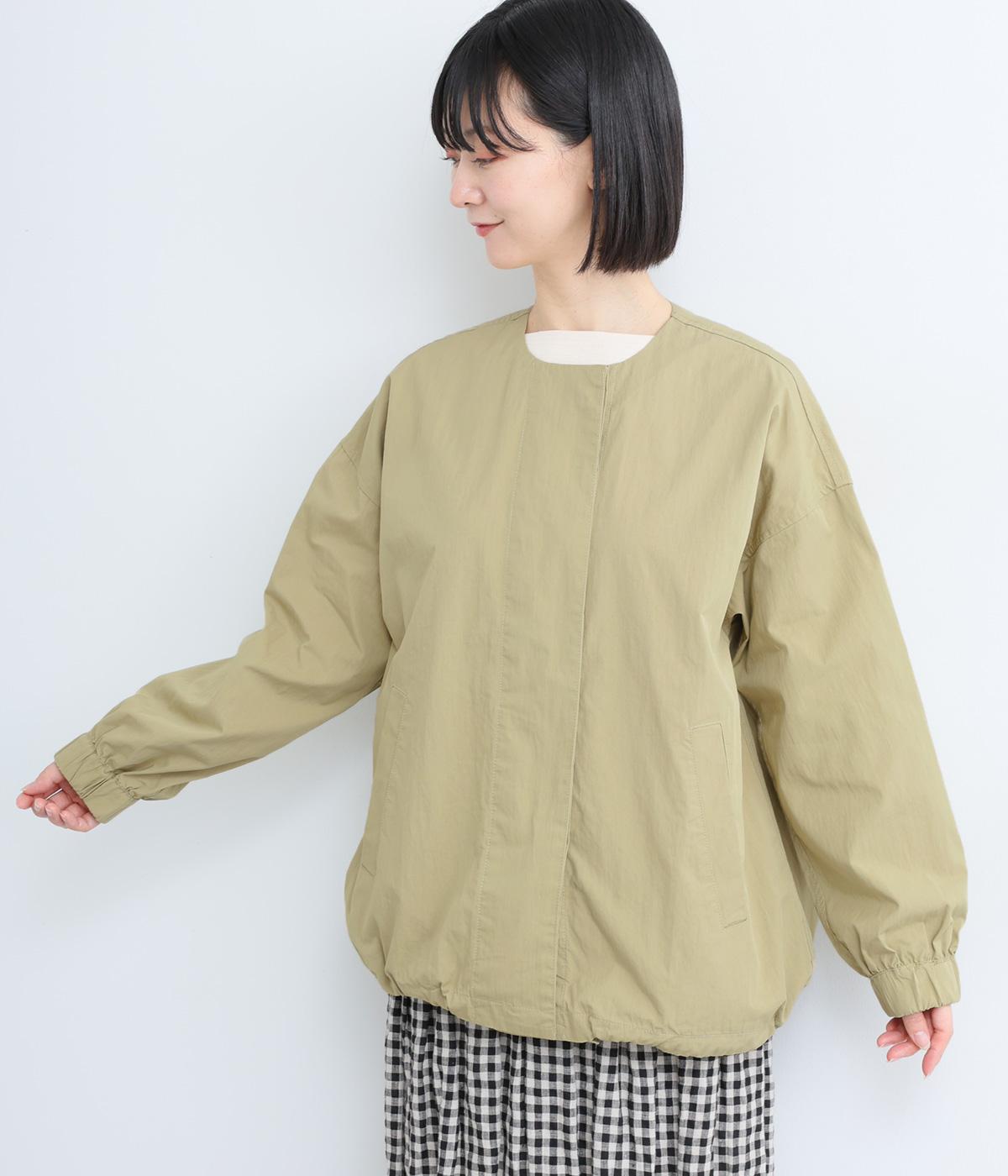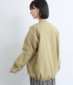 フロントは比翼仕立てですっきりとした印象に仕上げたノーカラーブルゾンです。裾まわりにドローコードを通しているので、絞ることでシルエットの変化が楽しめます。袖口はフィット感のあるゴム入り。