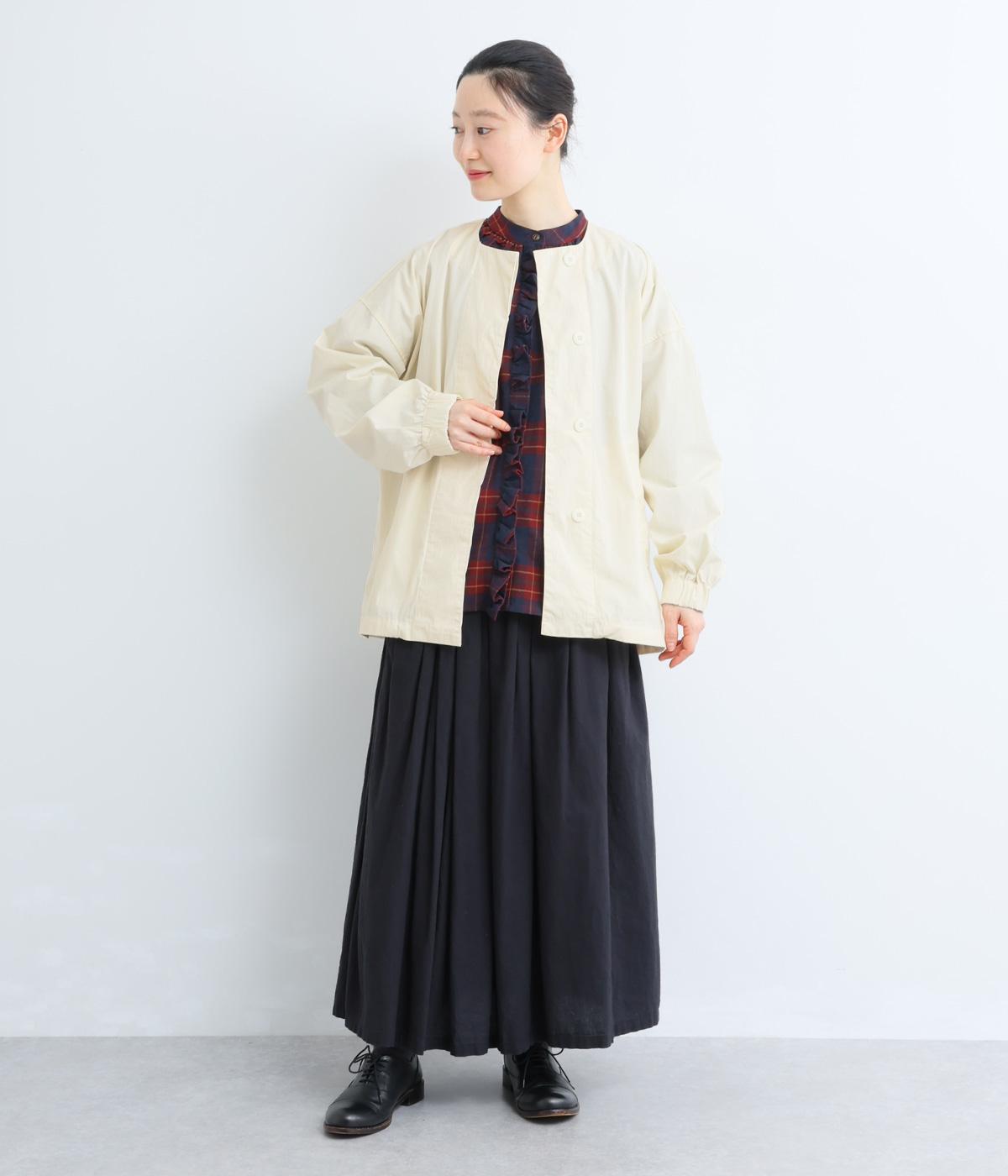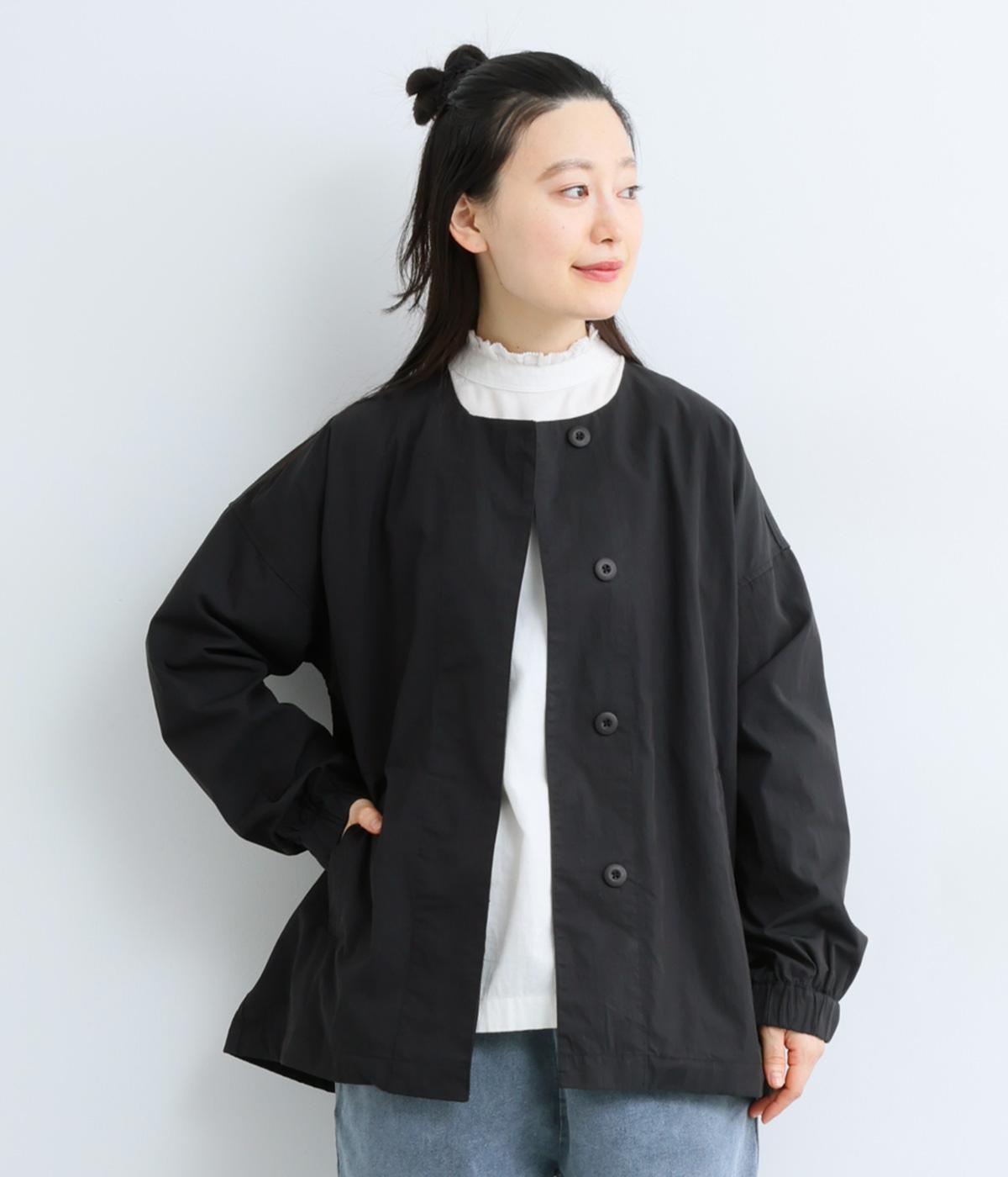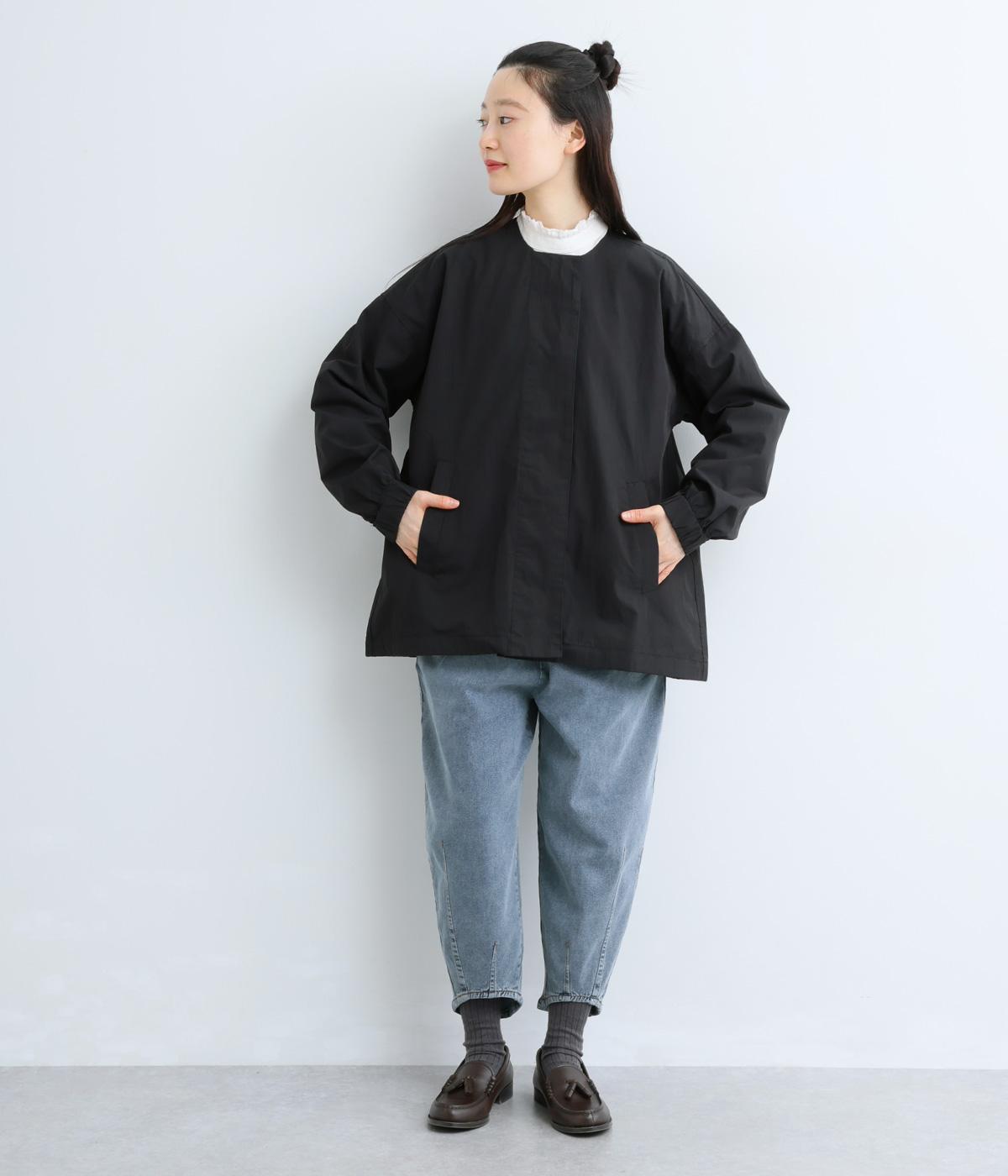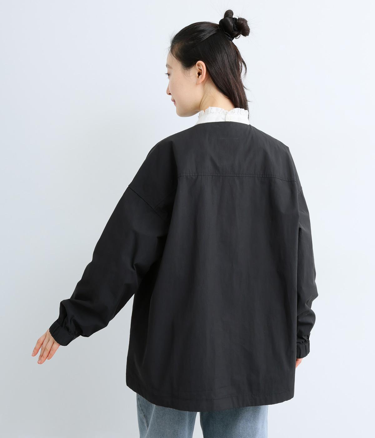 フロントは比翼仕立てですっきりとした印象に仕上げたノーカラーブルゾンです。裾まわりにドローコードを通しているので、絞ることでシルエットの変化が楽しめます。袖口はフィット感のあるゴム入り。