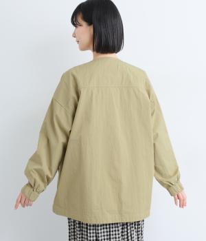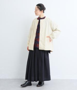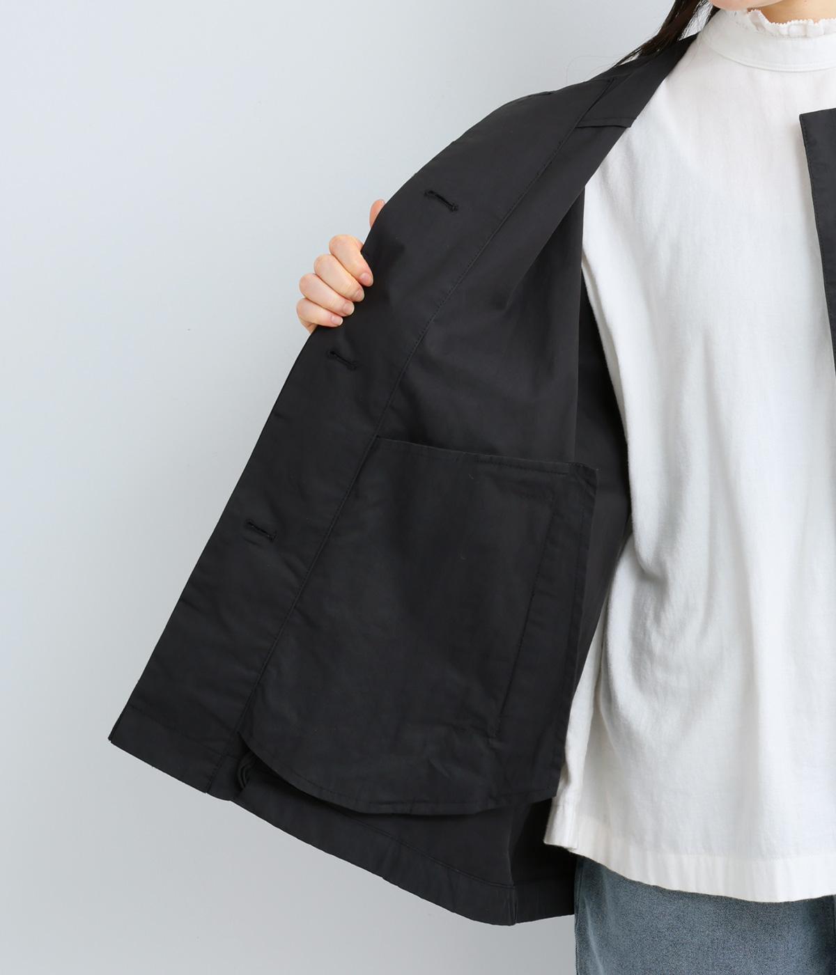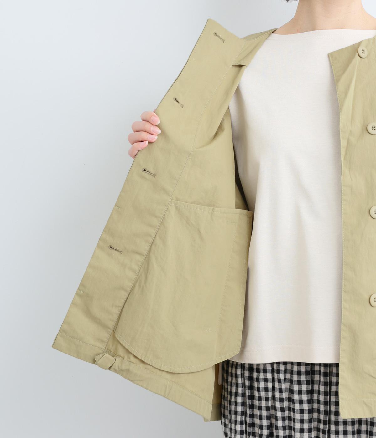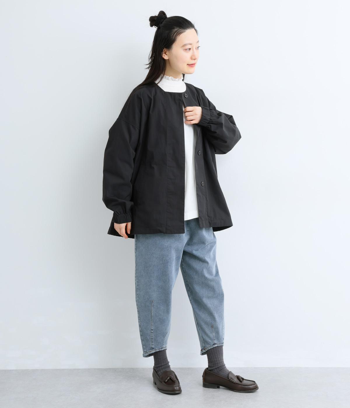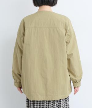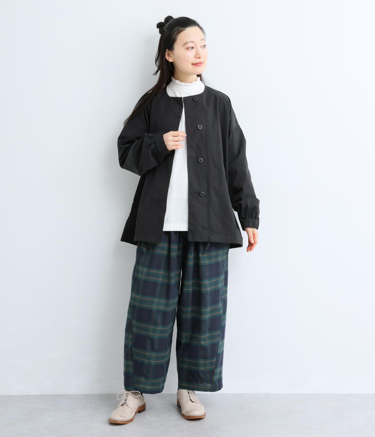 フロントは比翼仕立てですっきりとした印象に仕上げたノーカラーブルゾンです。裾まわりにドローコードを通しているので、絞ることでシルエットの変化が楽しめます。袖口はフィット感のあるゴム入り。