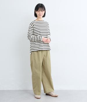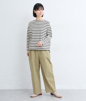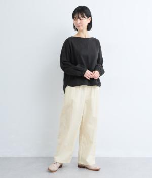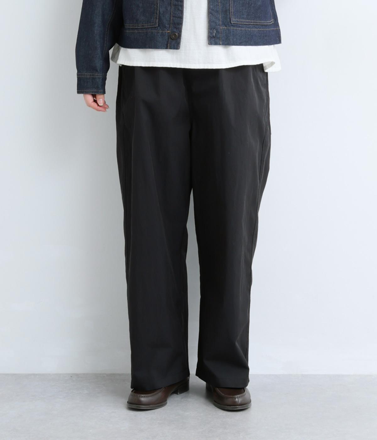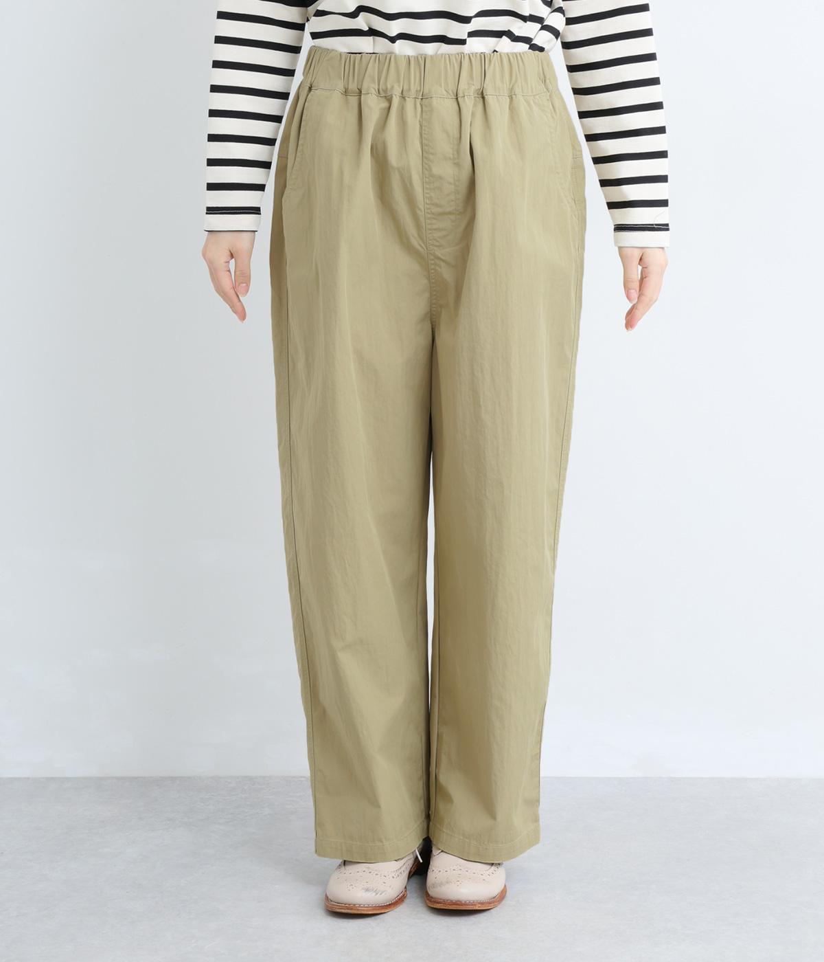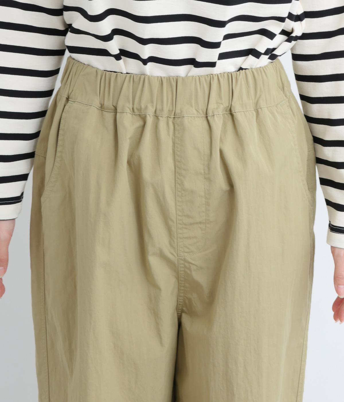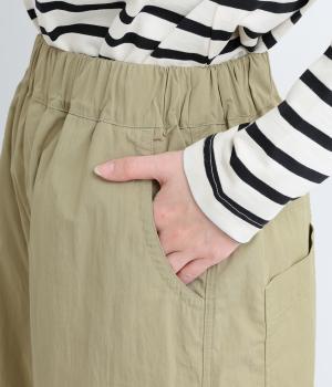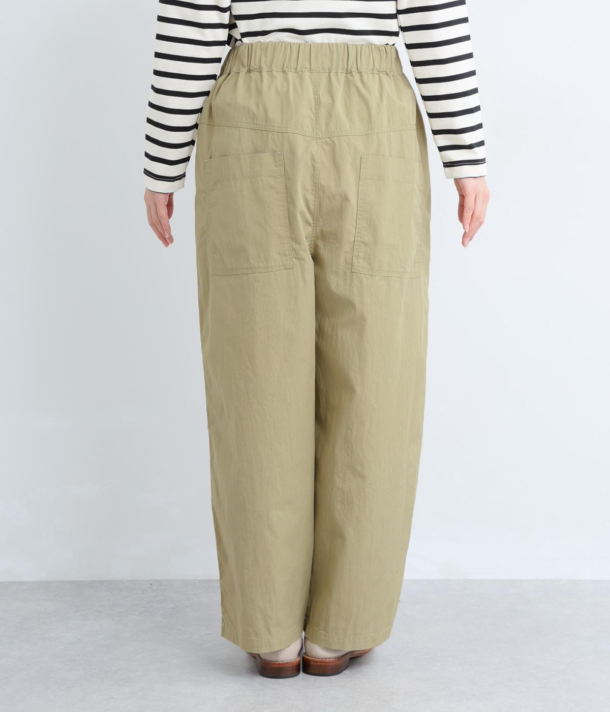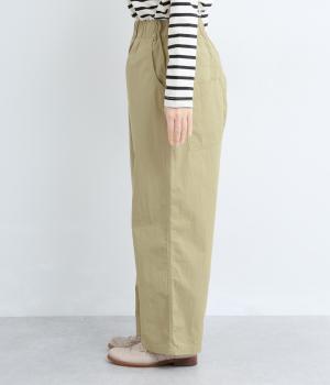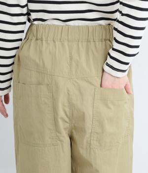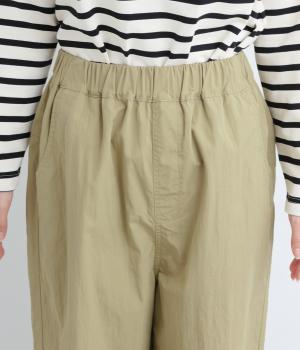 足のラインを拾いにくい、リラクシーなシルエットのパンツです。素材のハリ感によって立体感がうまれ、ルーズになりすぎないのもポイントに。ウエストはお腹まわりにフィットする総ゴム仕様で、内側の紐によって調節もできます。