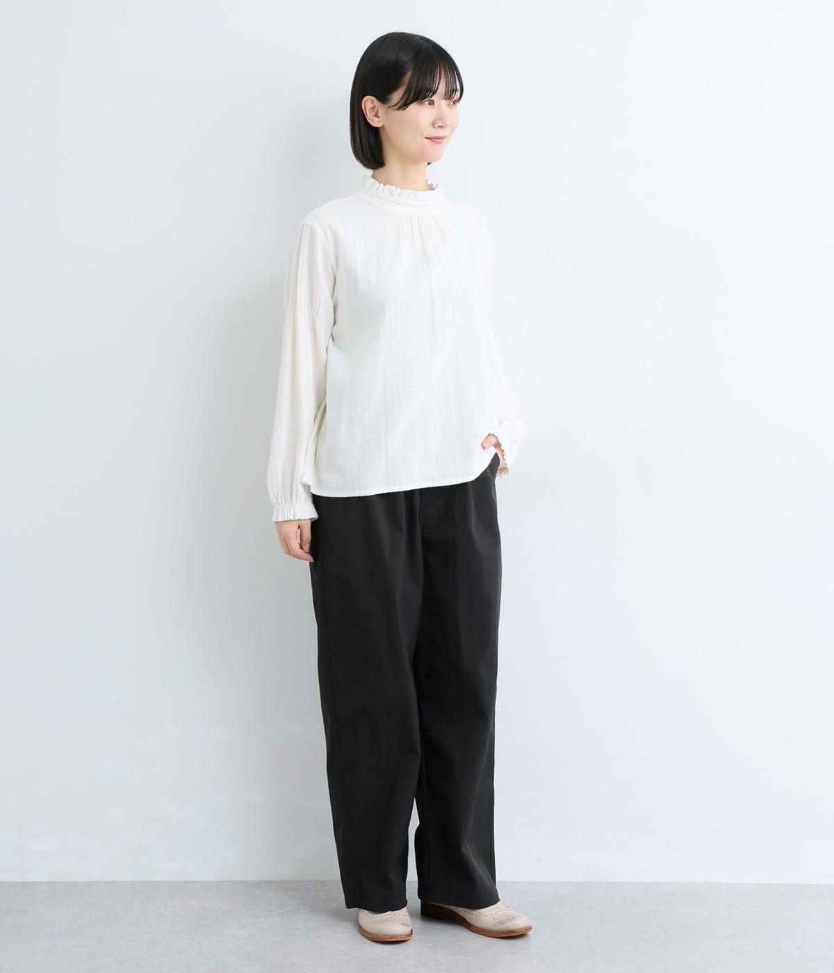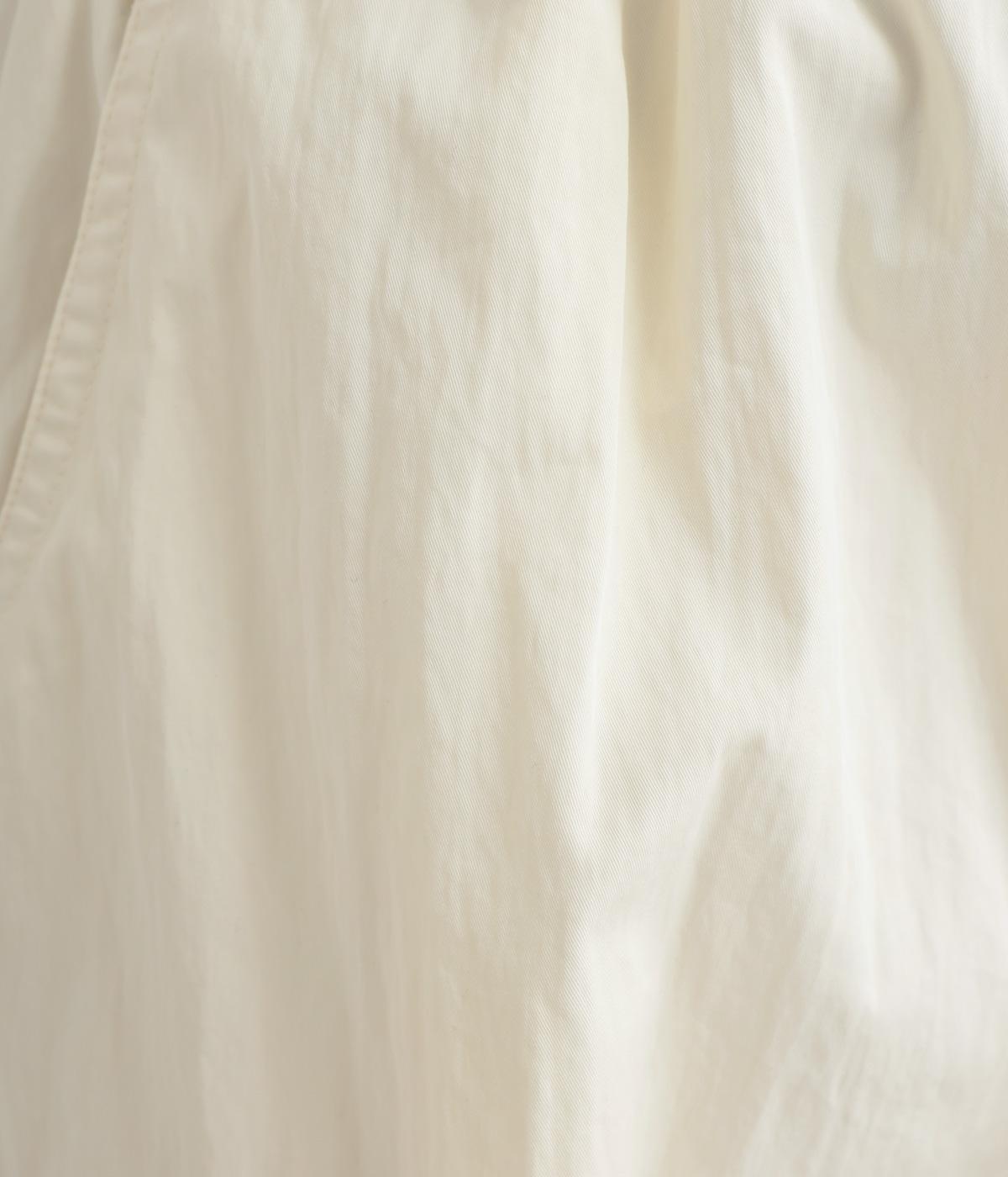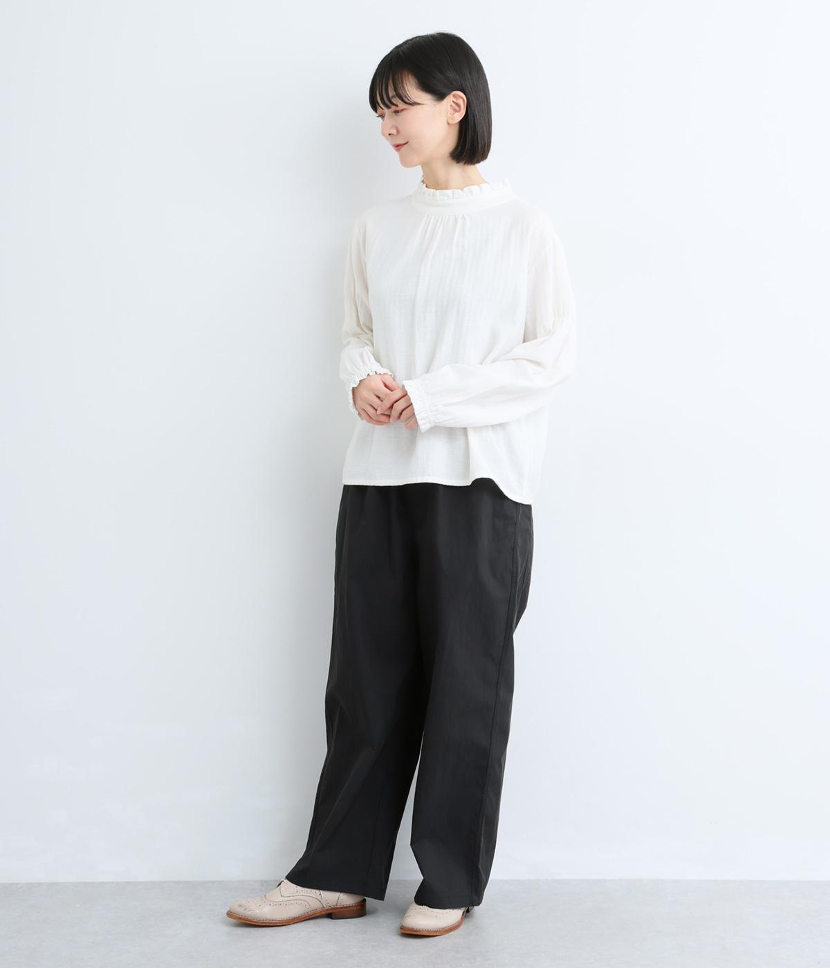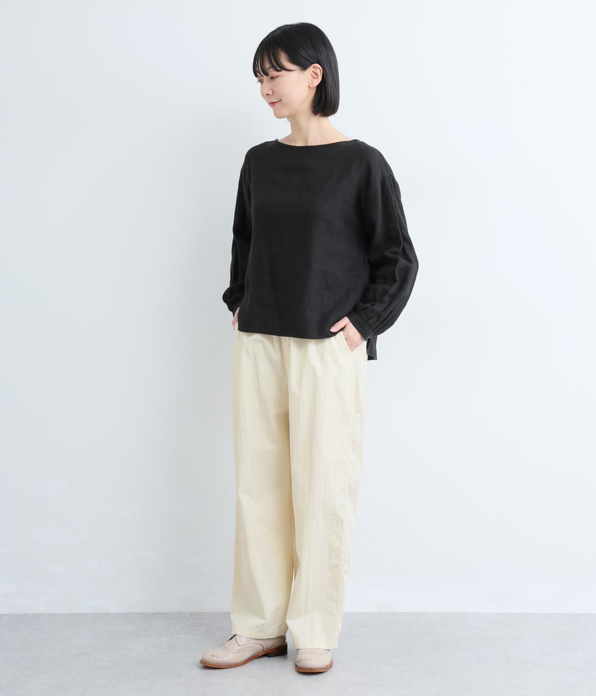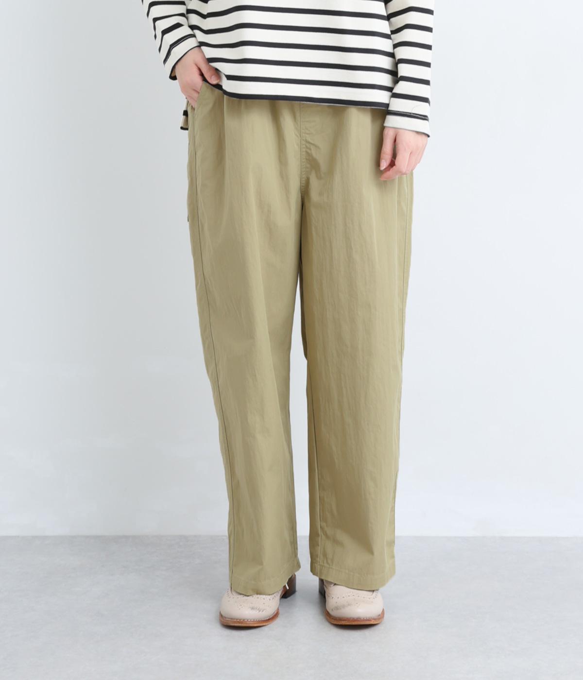 足のラインを拾いにくい、リラクシーなシルエットのパンツです。素材のハリ感によって立体感がうまれ、ルーズになりすぎないのもポイントに。ウエストはお腹まわりにフィットする総ゴム仕様で、内側の紐によって調節もできます。