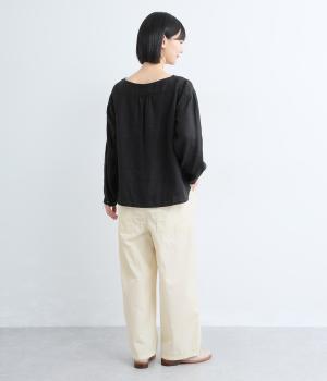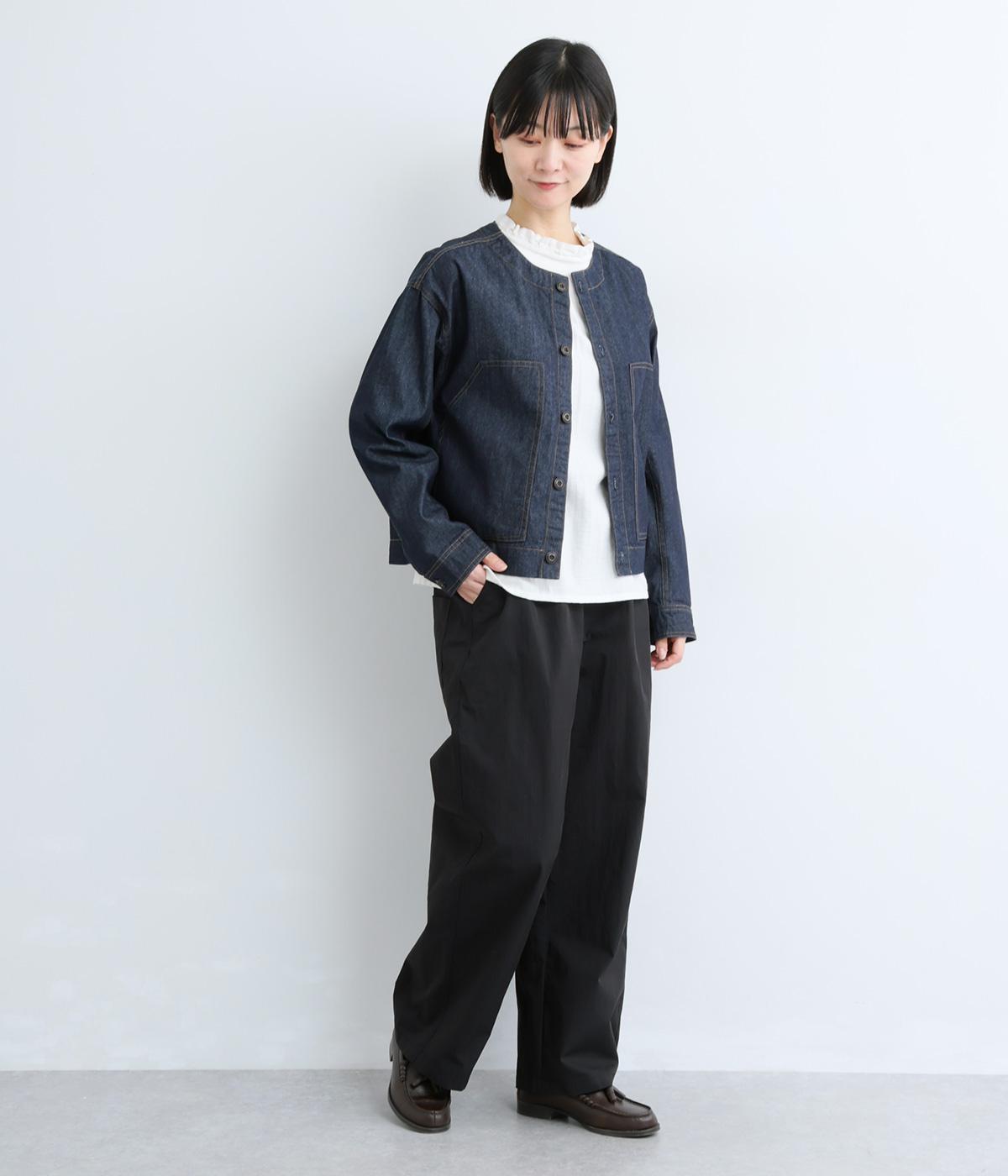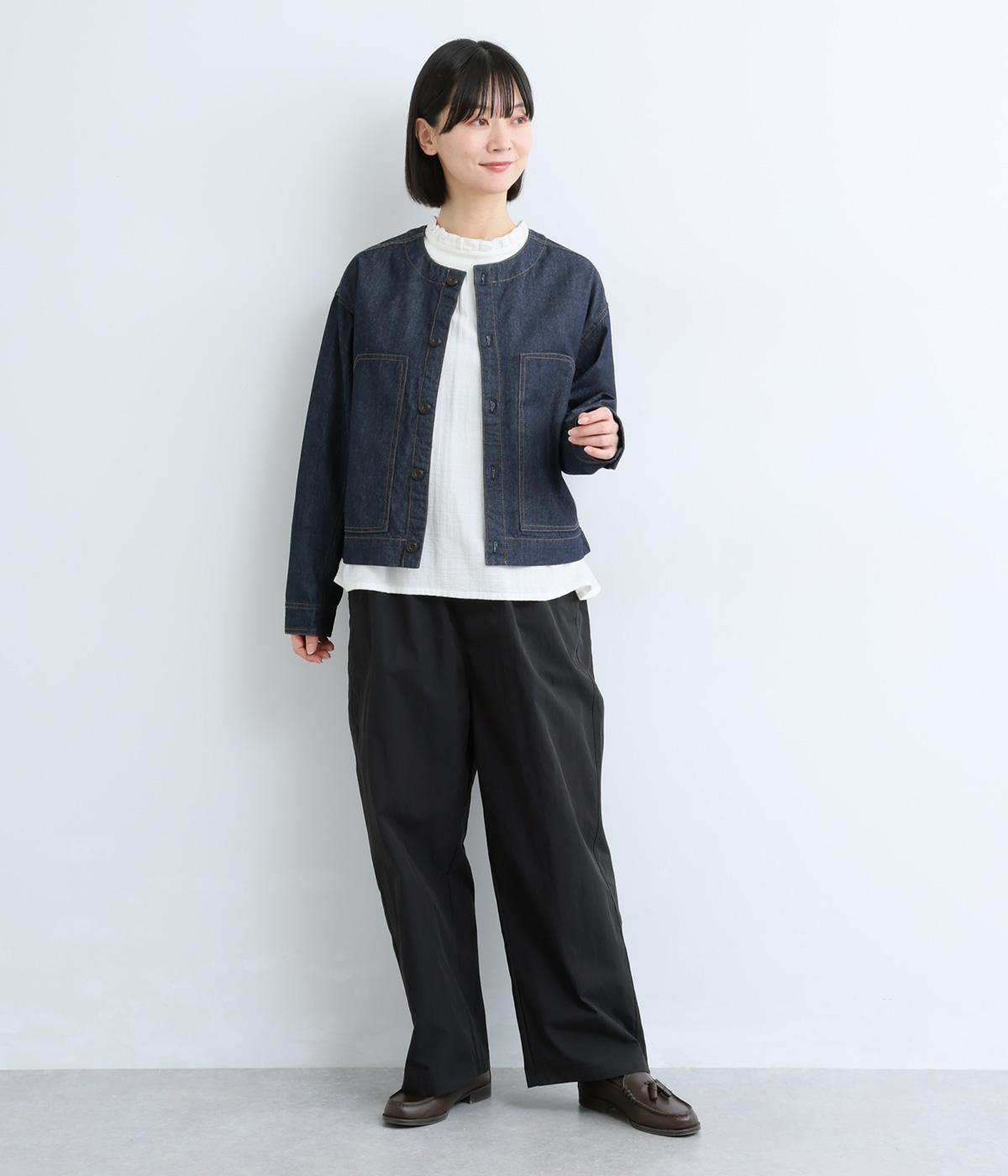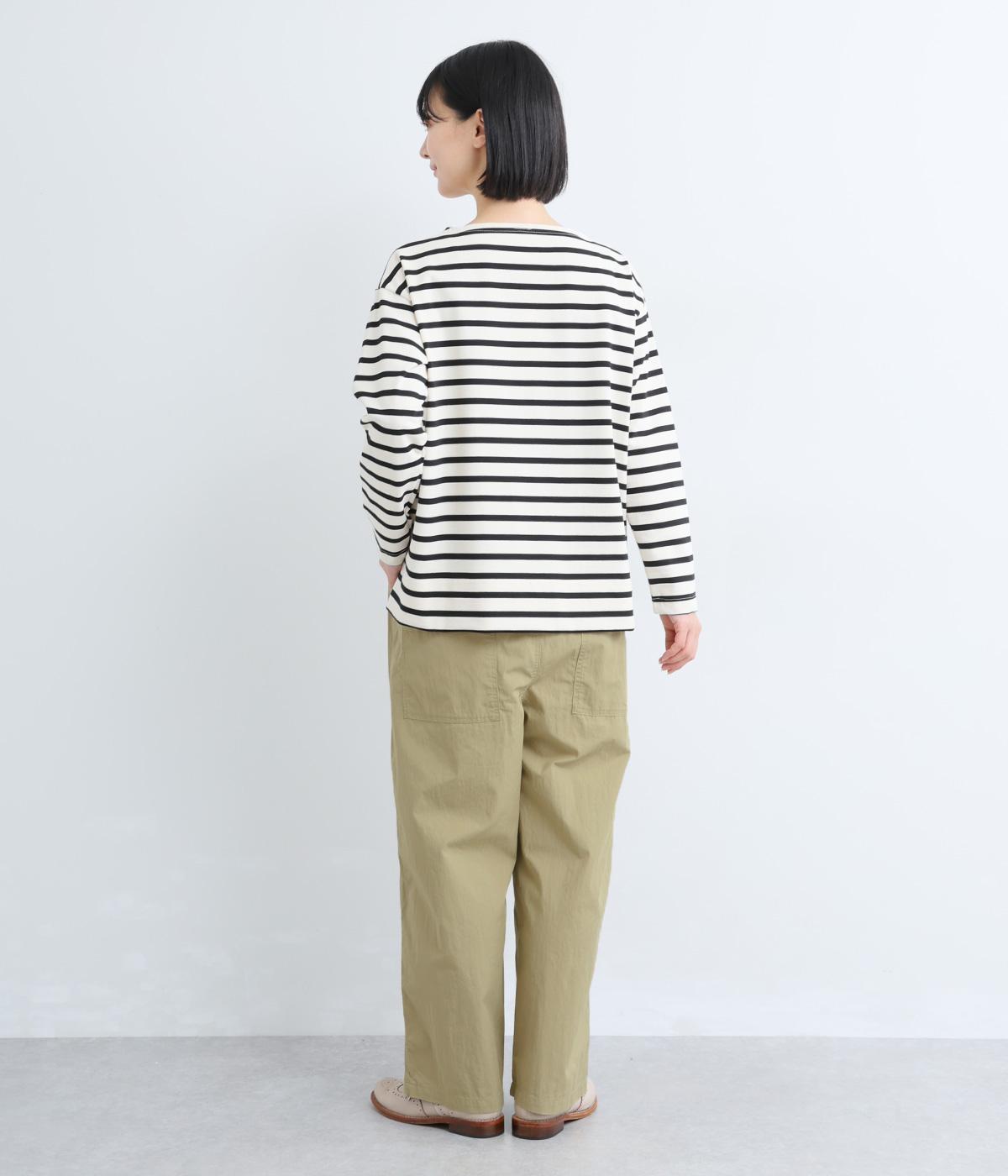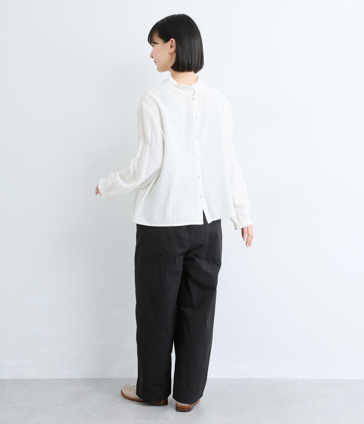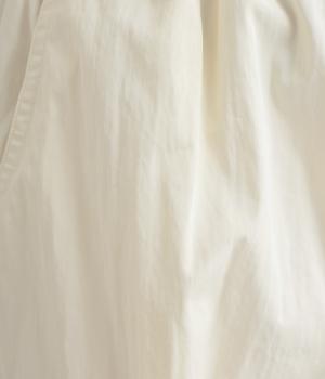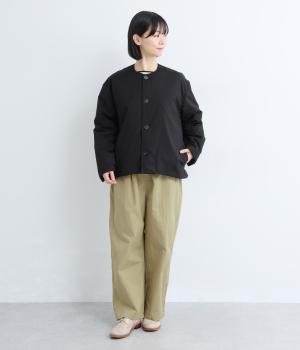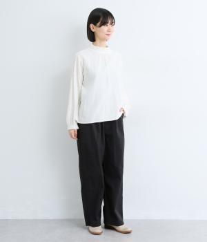 足のラインを拾いにくい、リラクシーなシルエットのパンツです。素材のハリ感によって立体感がうまれ、ルーズになりすぎないのもポイントに。ウエストはお腹まわりにフィットする総ゴム仕様で、内側の紐によって調節もできます。