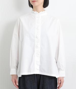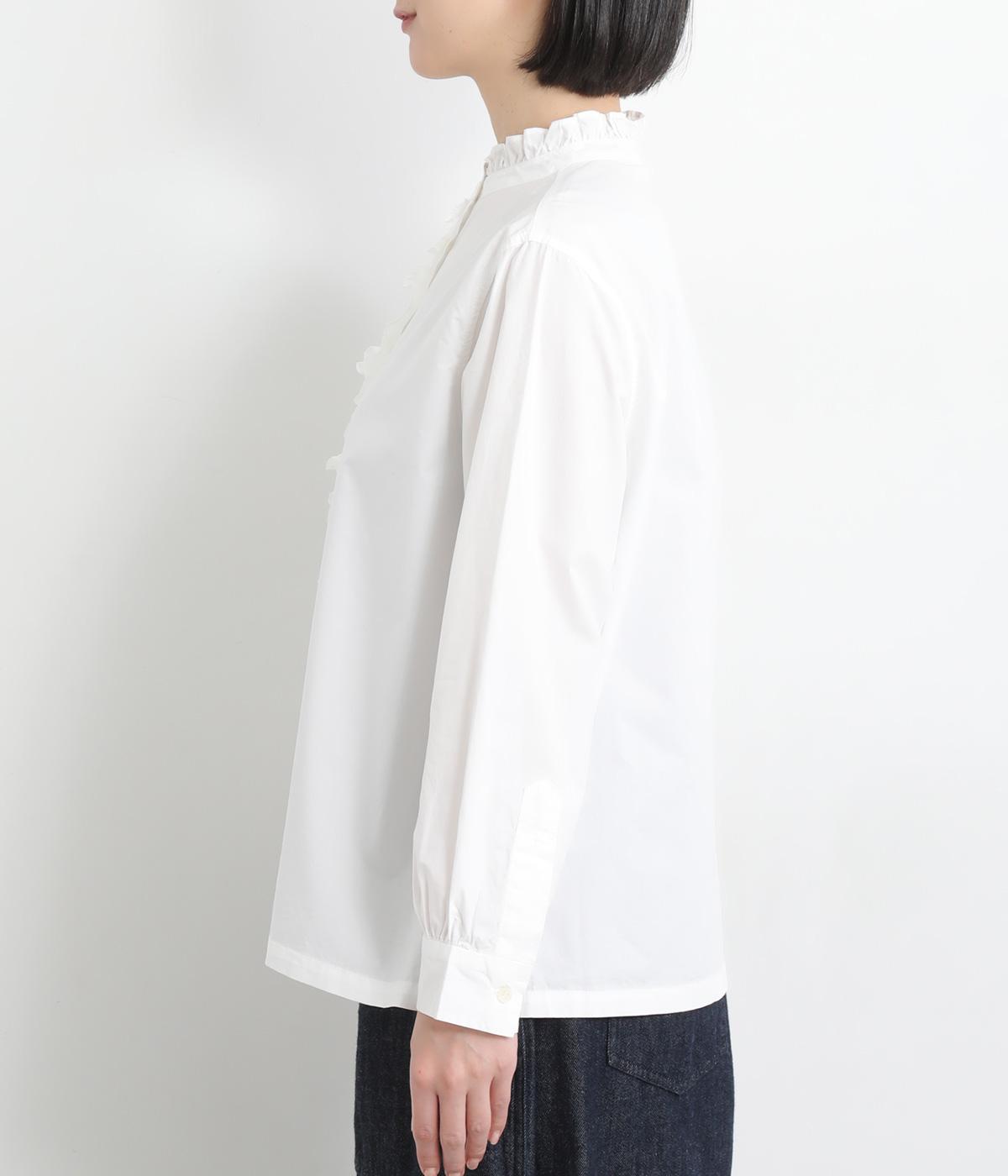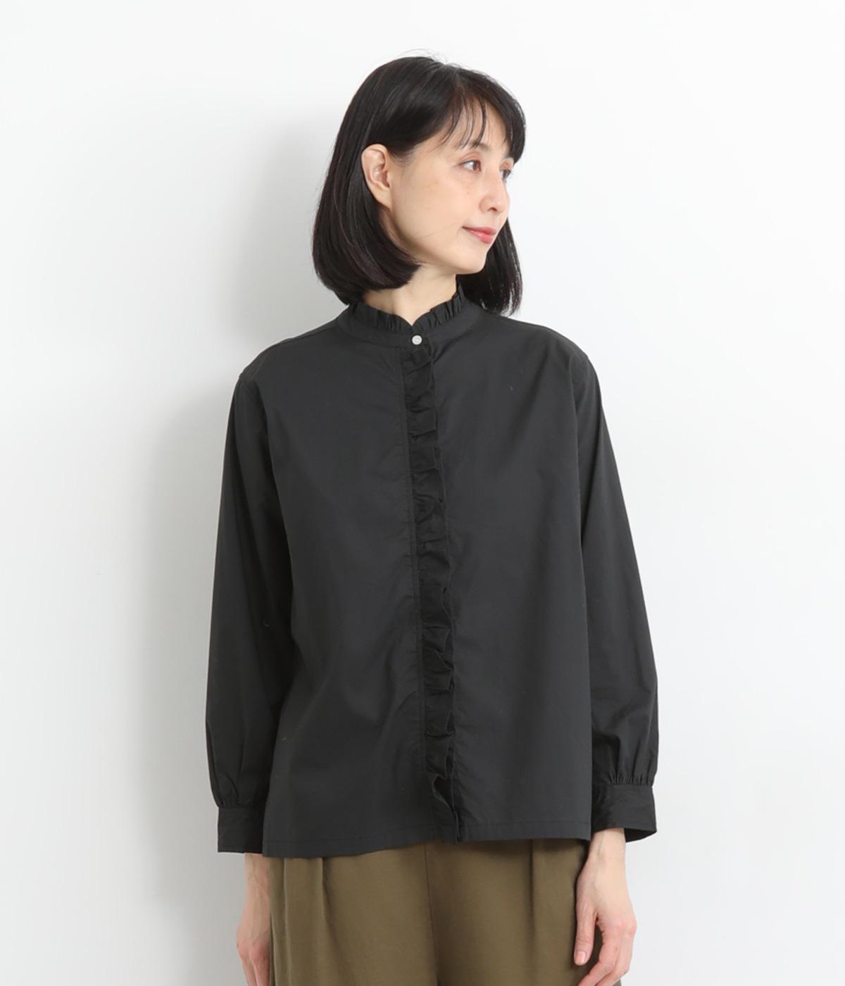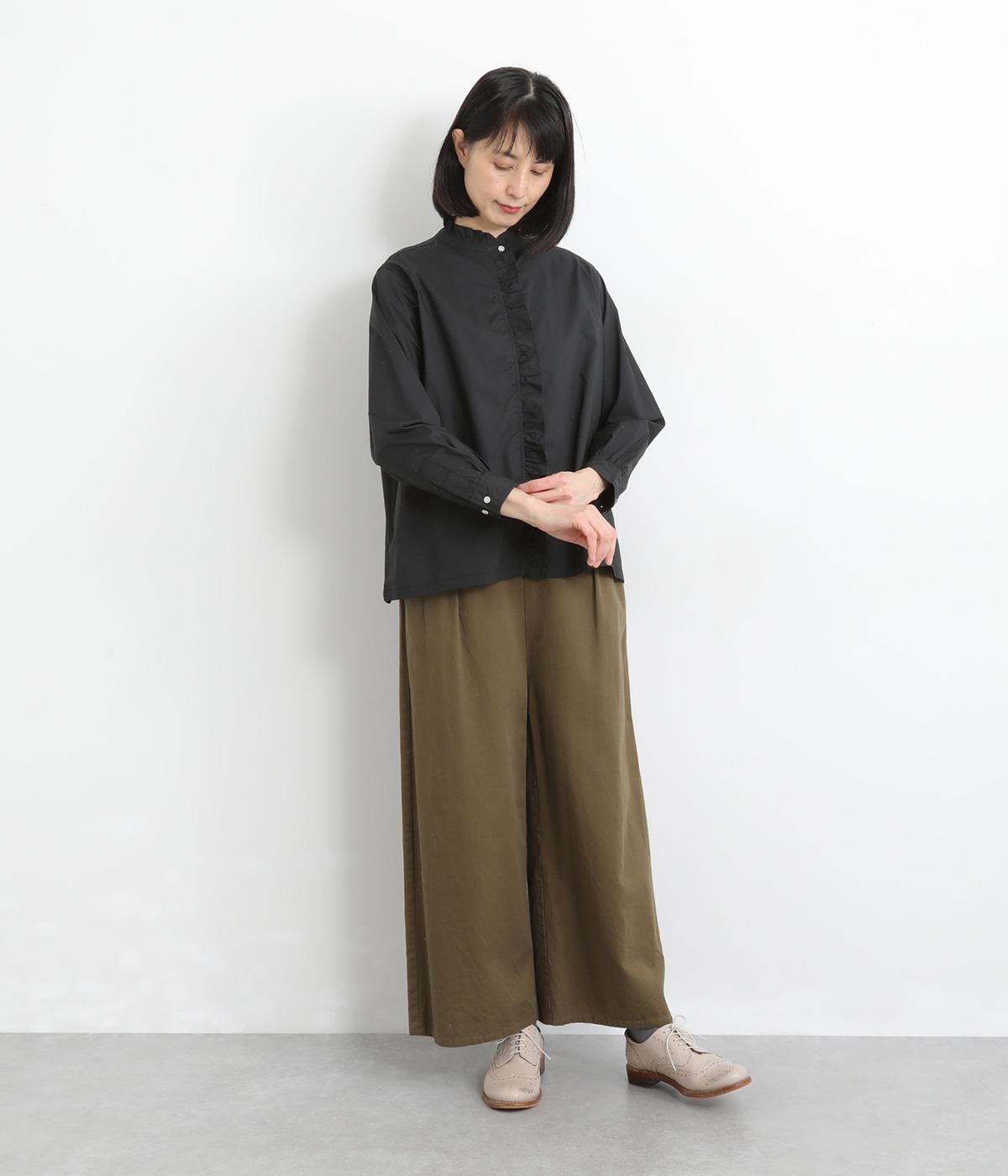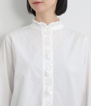 フリルをあしらった比翼デザインが、装いに華やぎを添えるブラウスです。首元もフリルカラーで仕上げ、顔まわりに立体感をプラス。袖口は丸みが出すぎないひかえめなギャザーを施し、上品なシルエットに落とし込んでいます。きれいめにもカジュアルにも合わせやすい、万能な一枚です。