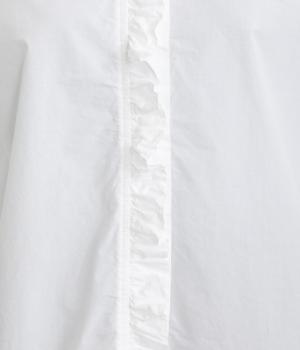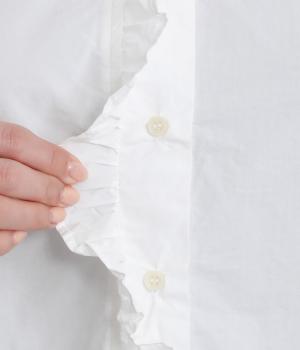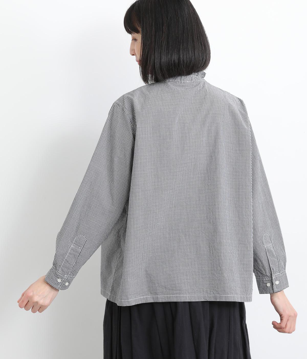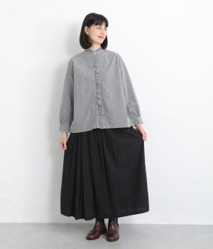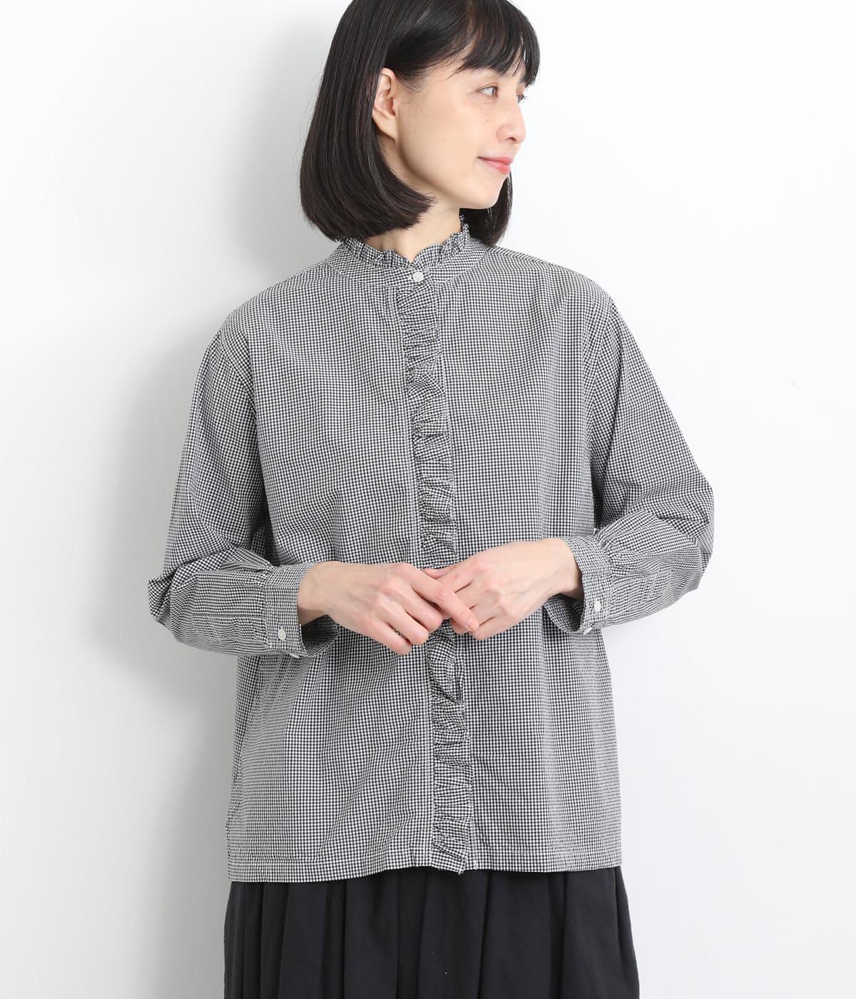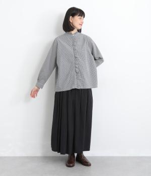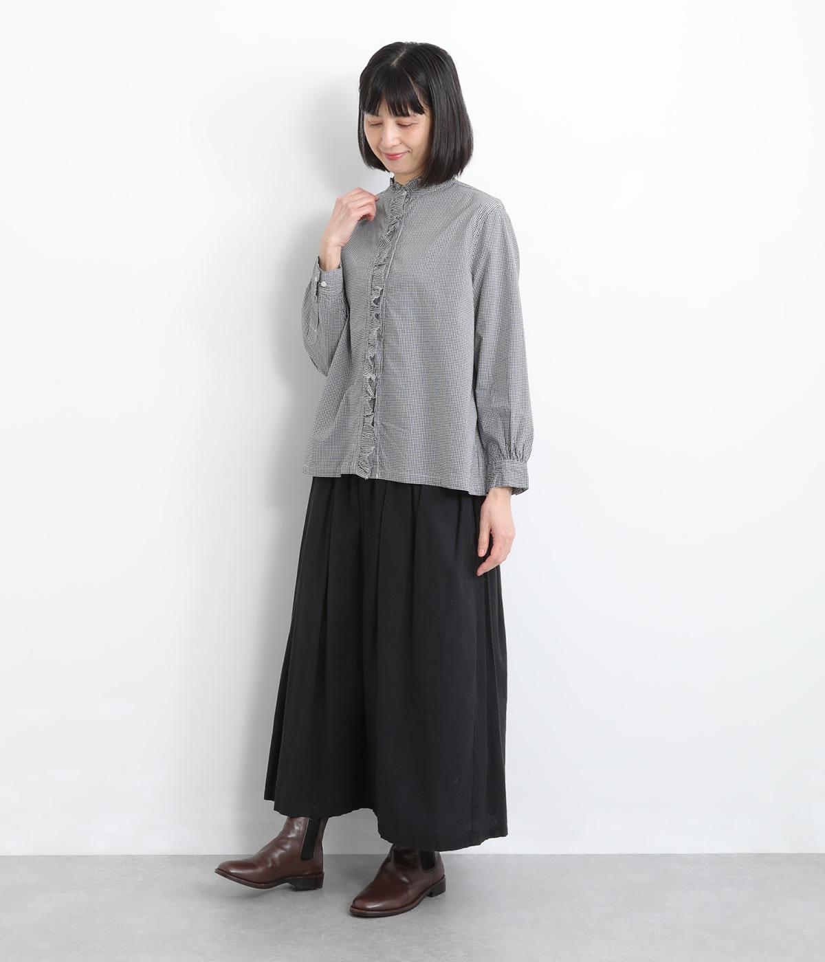 フリルをあしらった比翼デザインが、装いに華やぎを添えるブラウスです。首元もフリルカラーで仕上げ、顔まわりに立体感をプラス。袖口は丸みが出すぎないひかえめなギャザーを施し、上品なシルエットに落とし込んでいます。きれいめにもカジュアルにも合わせやすい、万能な一枚です。