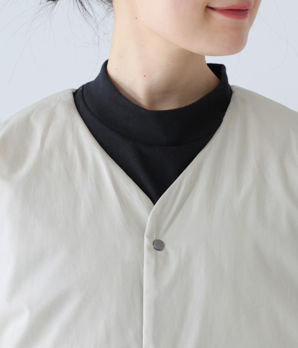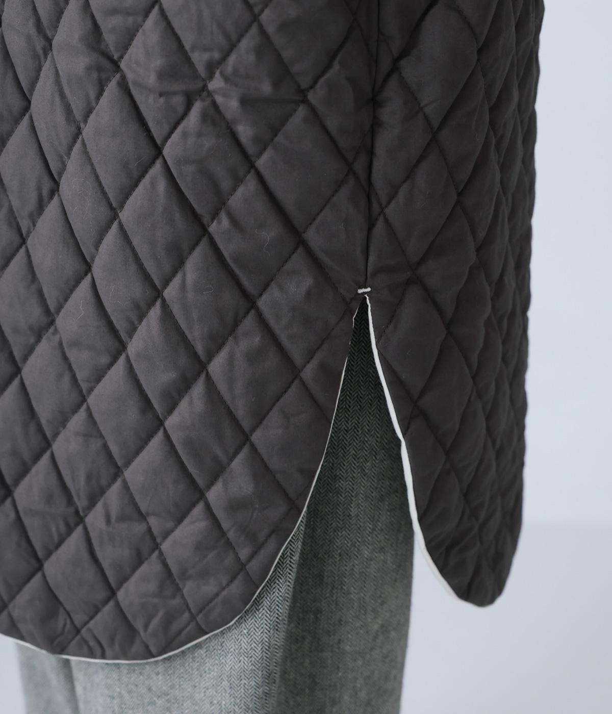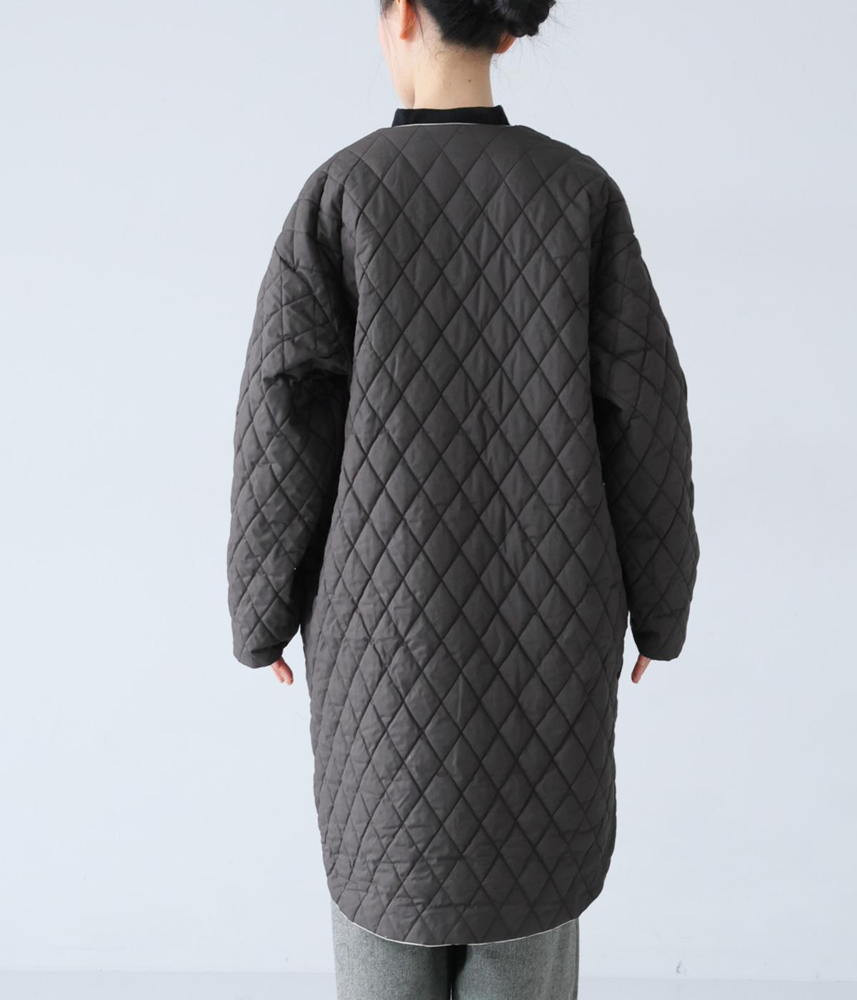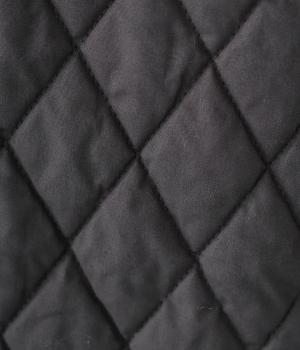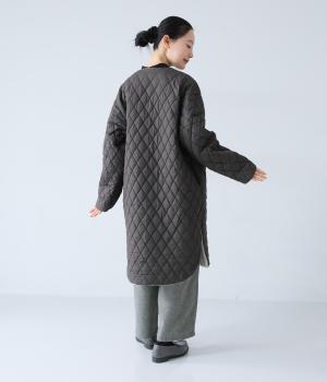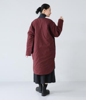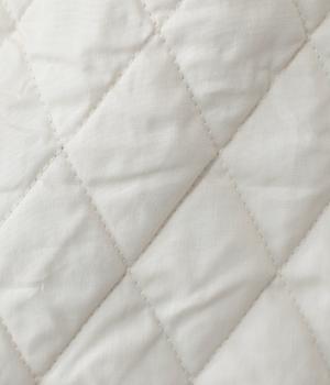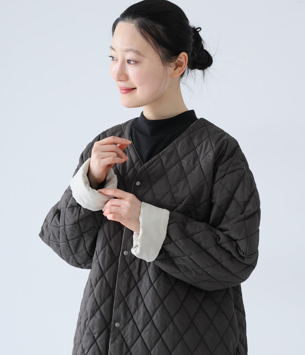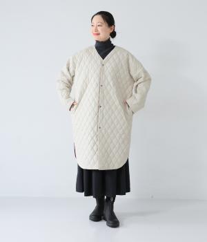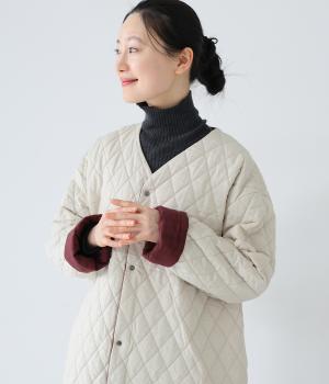 素朴でやわらかな風合いのコットンブロード生地を使用。軽さはそのままに、ふっくらとした中綿入りであたたかさをアップさせています。同じくコットン生地を使った裏側には、細かなダイヤ柄のステッチを施しました。
