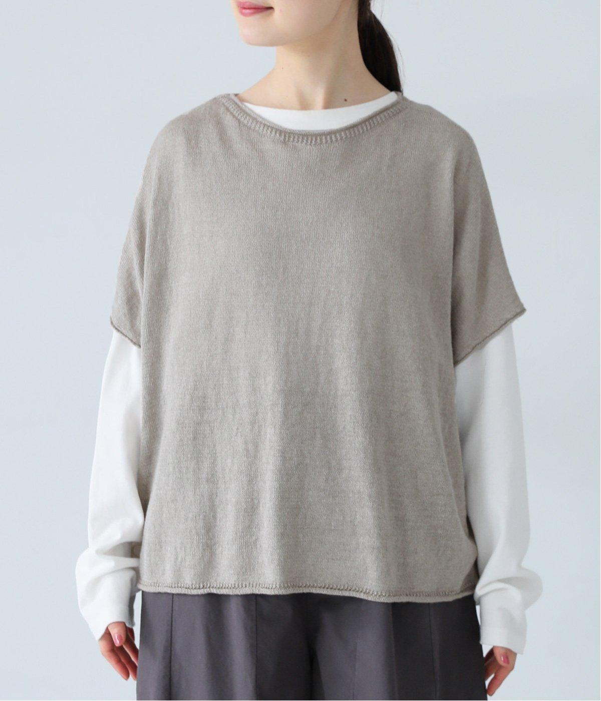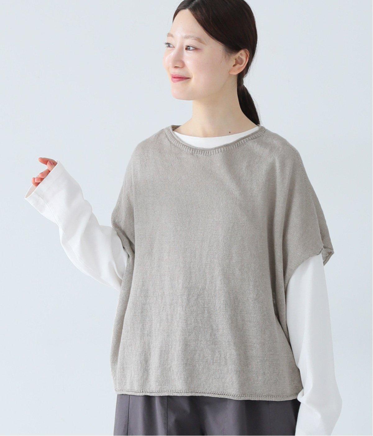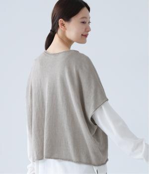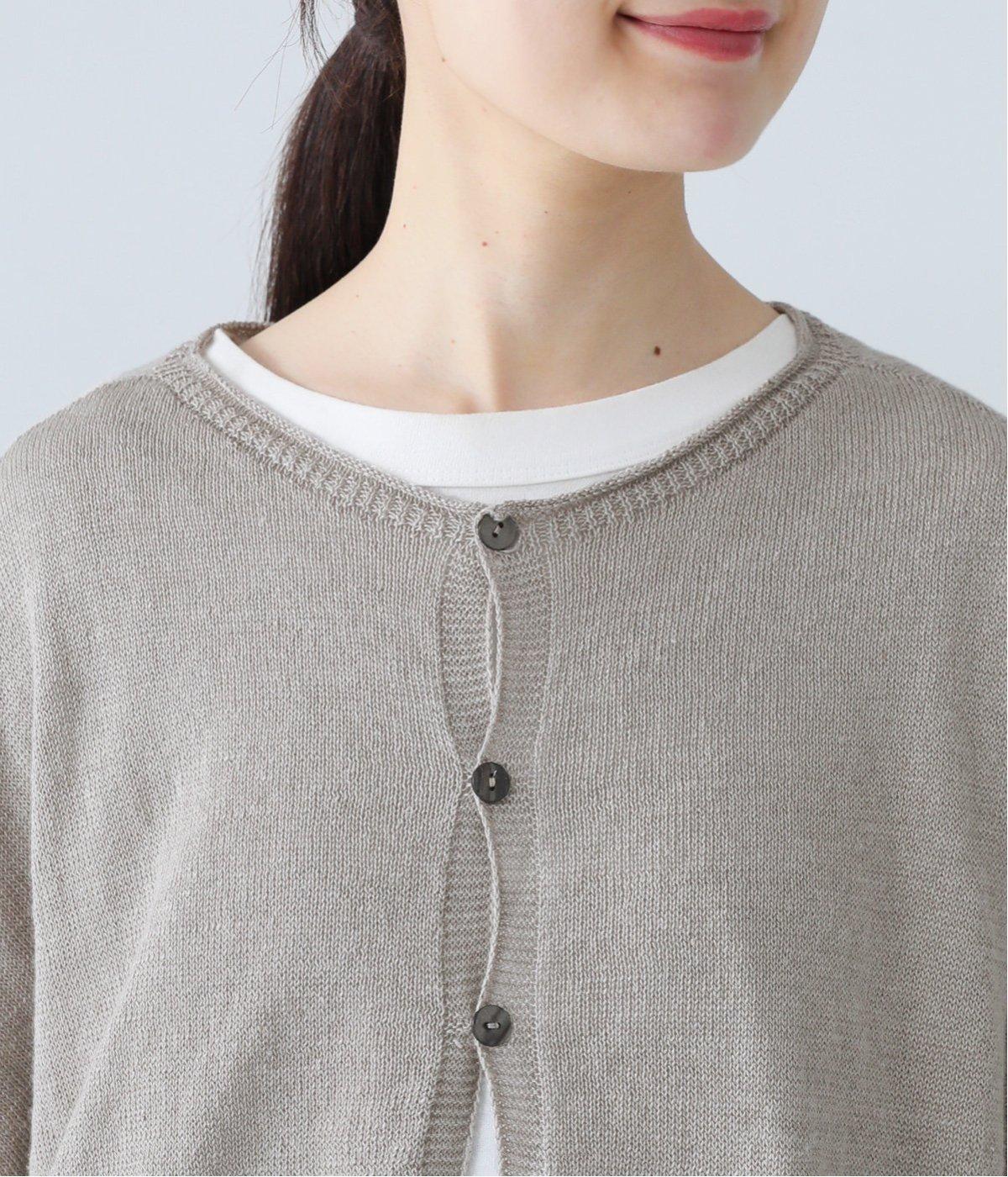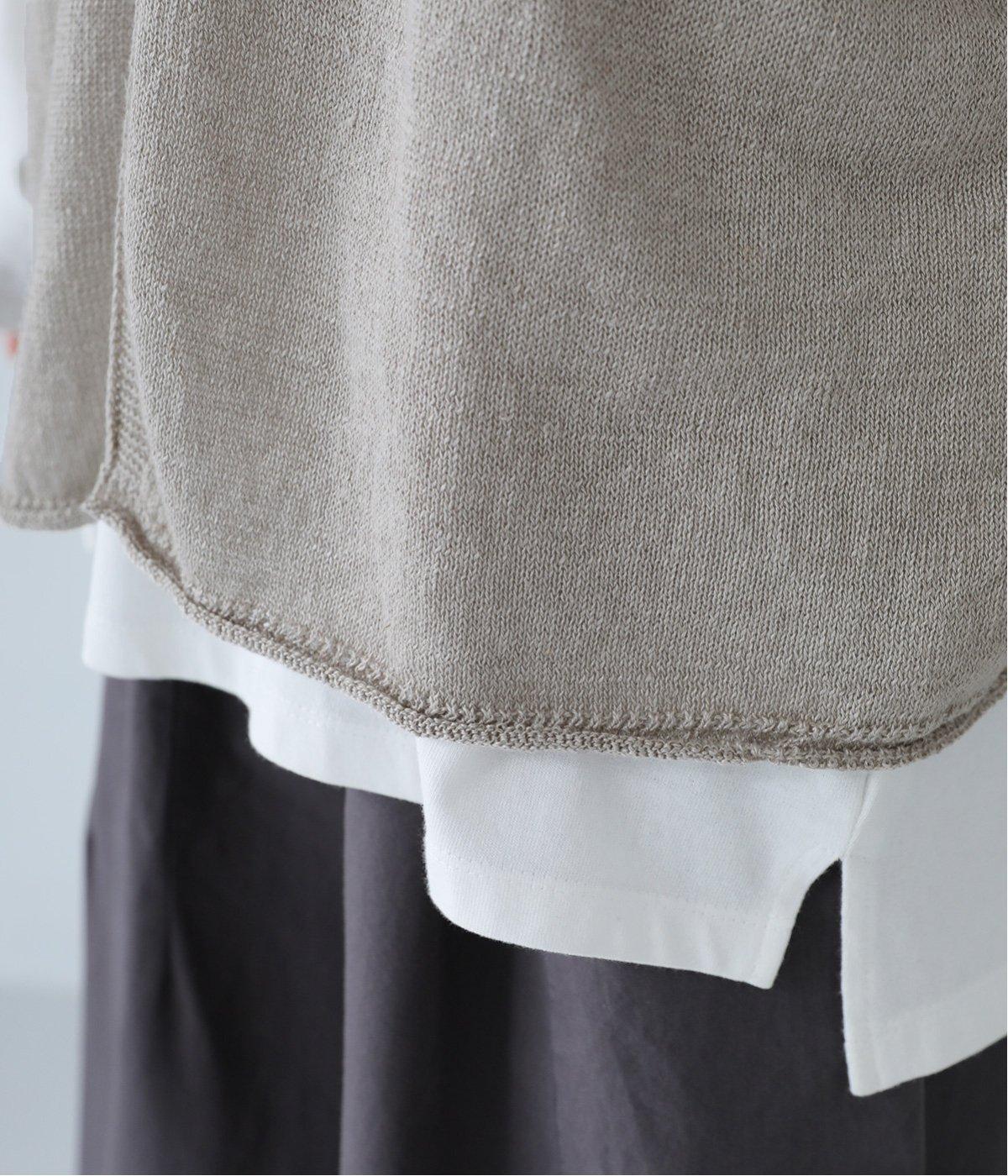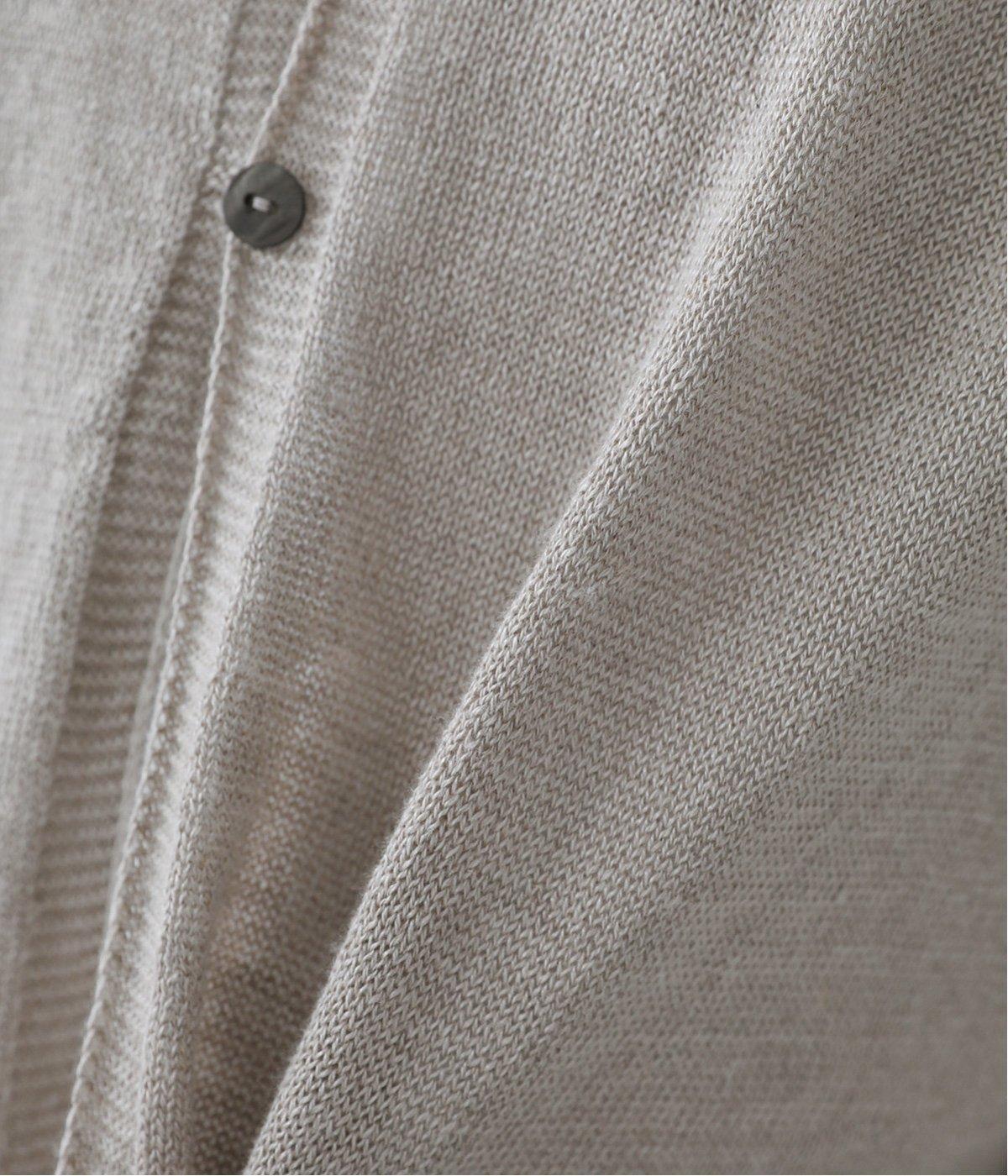 リネンならではのナチュラルな風合いを存分にたのしめるニット生地です。さらさらとした心地よい肌触りと清涼感たっぷりの見た目が特徴。薄手でやや透け感があり、レイヤードスタイルも軽やかに決まります。