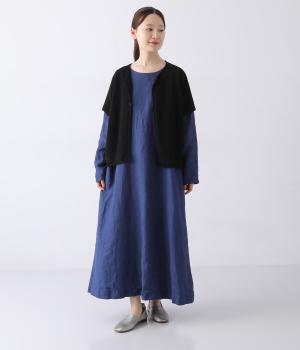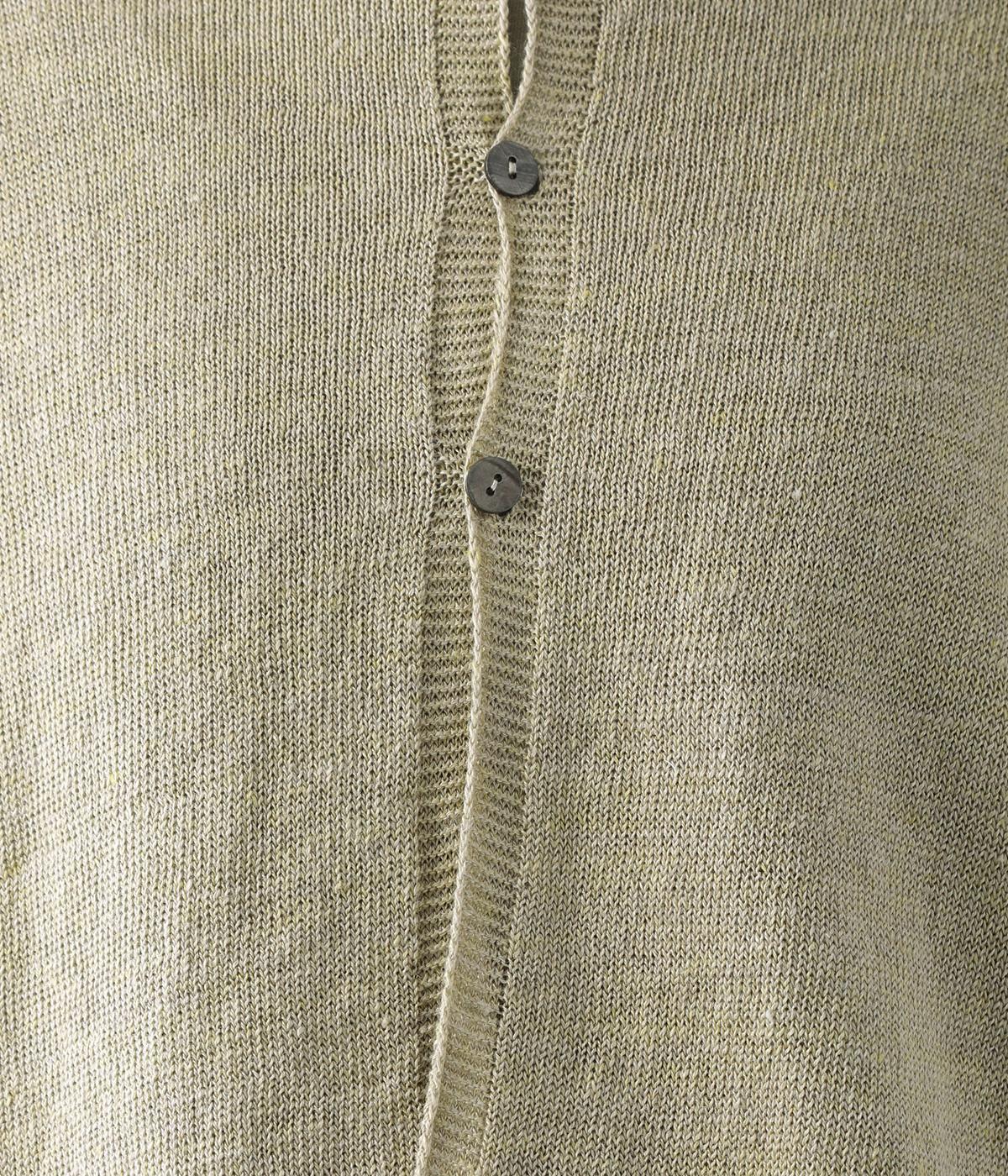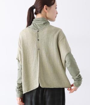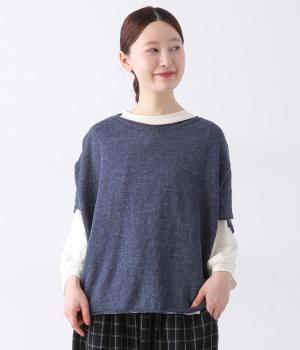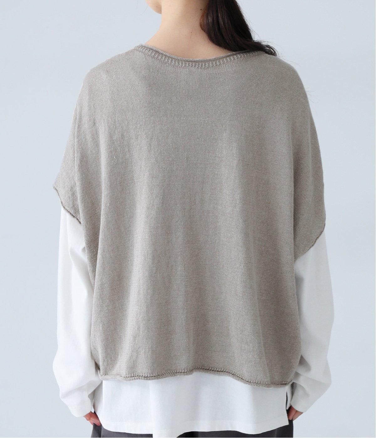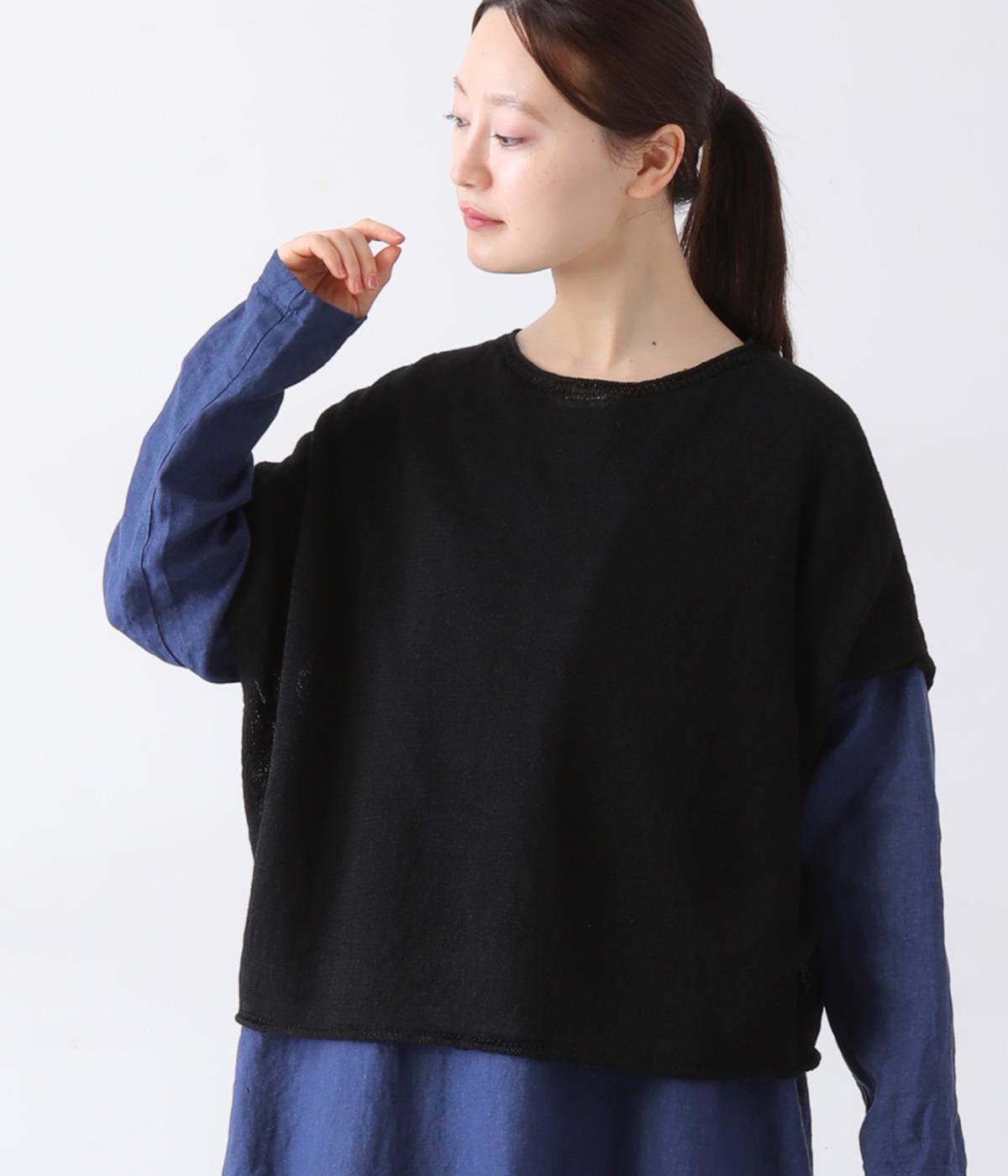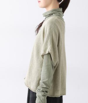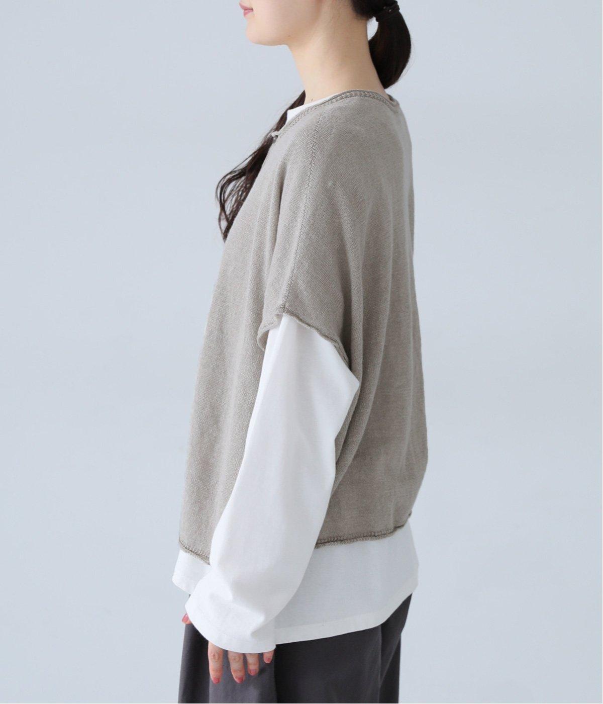リネンならではのナチュラルな風合いを存分にたのしめるニット生地です。さらさらとした心地よい肌触りと清涼感たっぷりの見た目が特徴。薄手でやや透け感があり、レイヤードスタイルも軽やかに決まります。