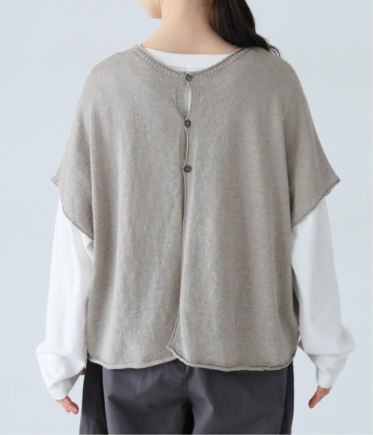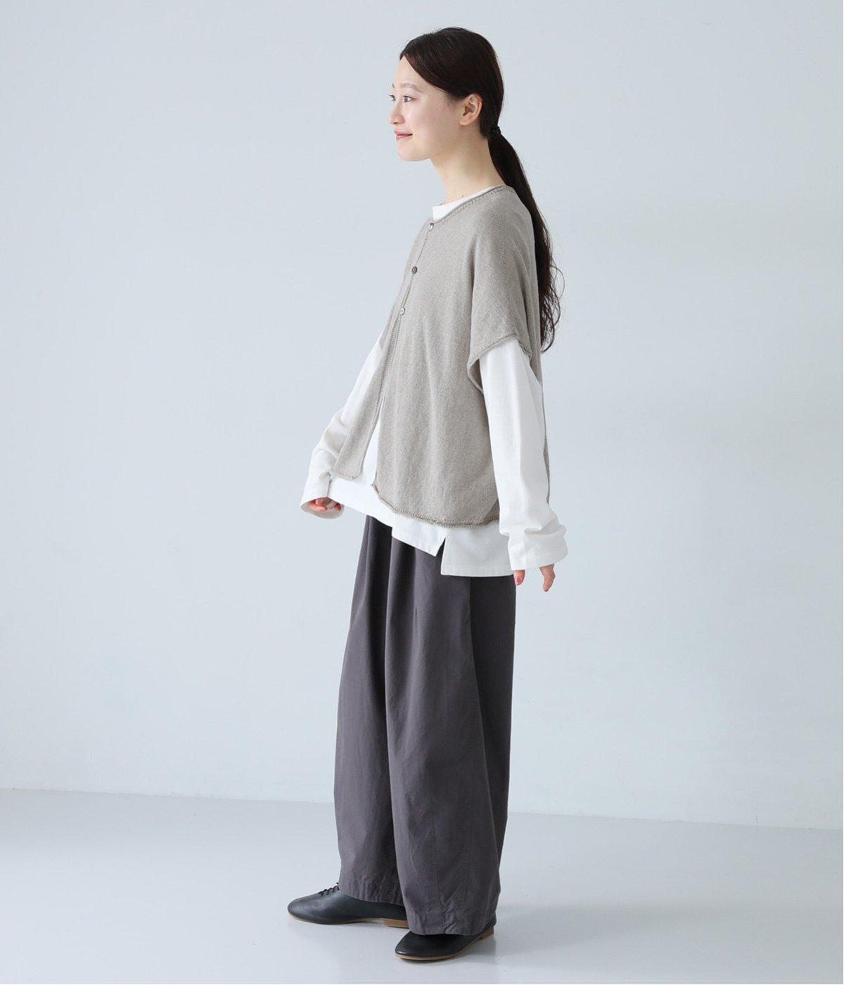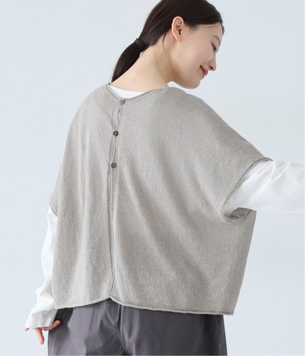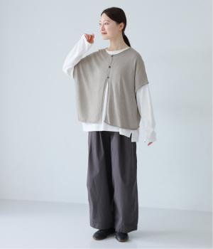 カーディガンとしても後ろ開きとしても着まわせる2way仕様のベストです。小さなボタンを3つのみ配して抜け感のある仕上がりに。裾などのくるりと丸まった編み端が愛らしいポイントです。ゆったりとしたドロップショルダーでインナーを合わせやすく、着こなしの幅が広がります。