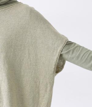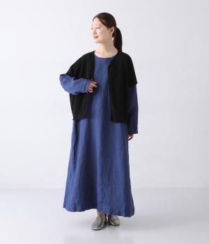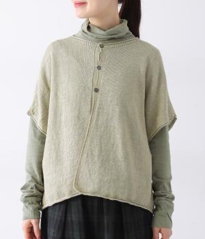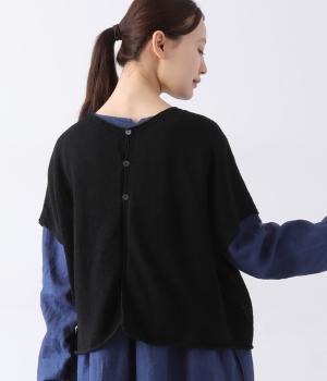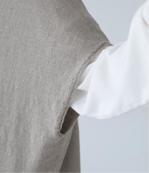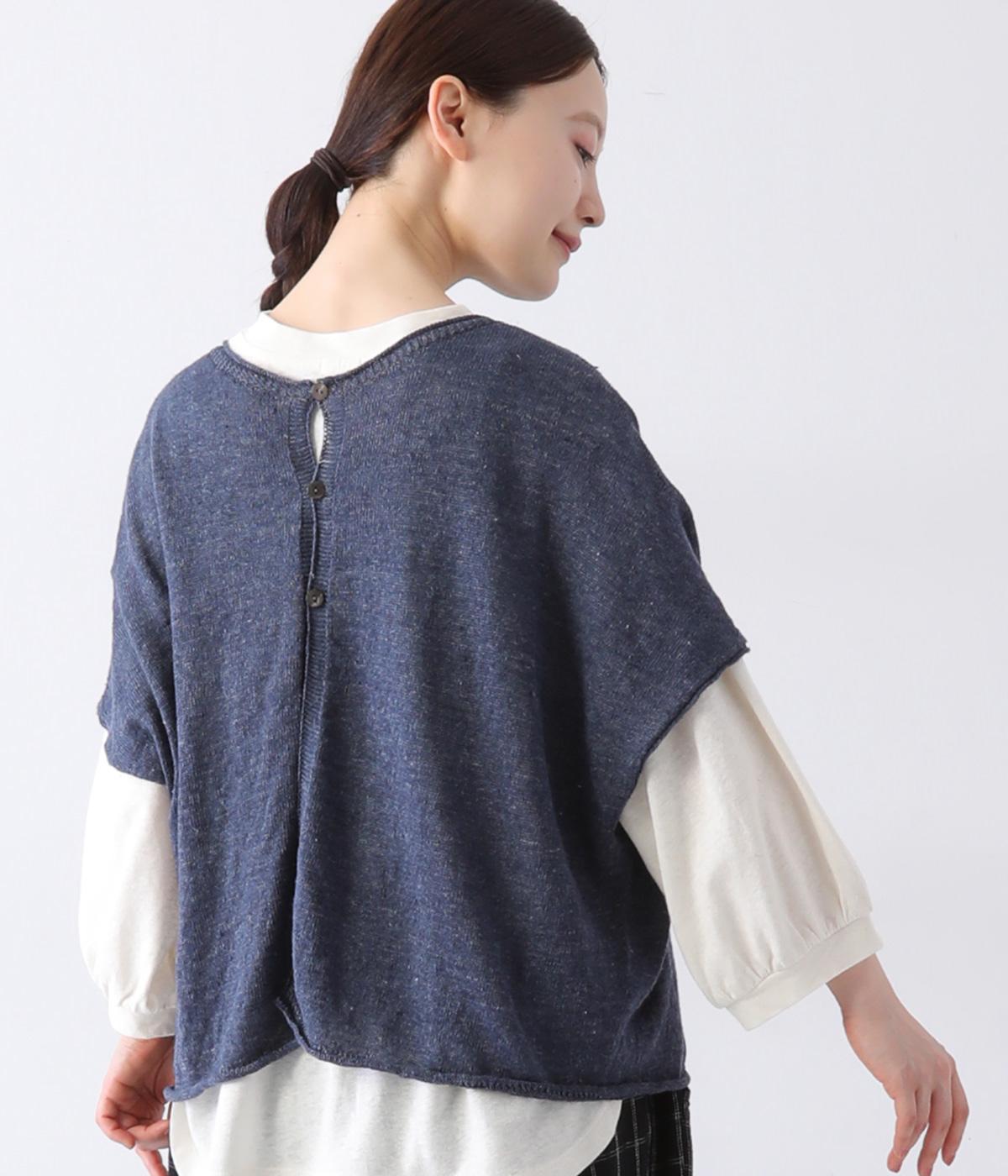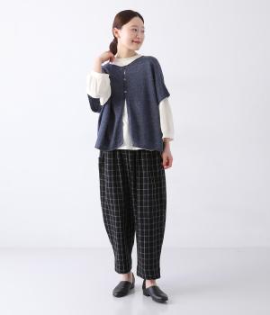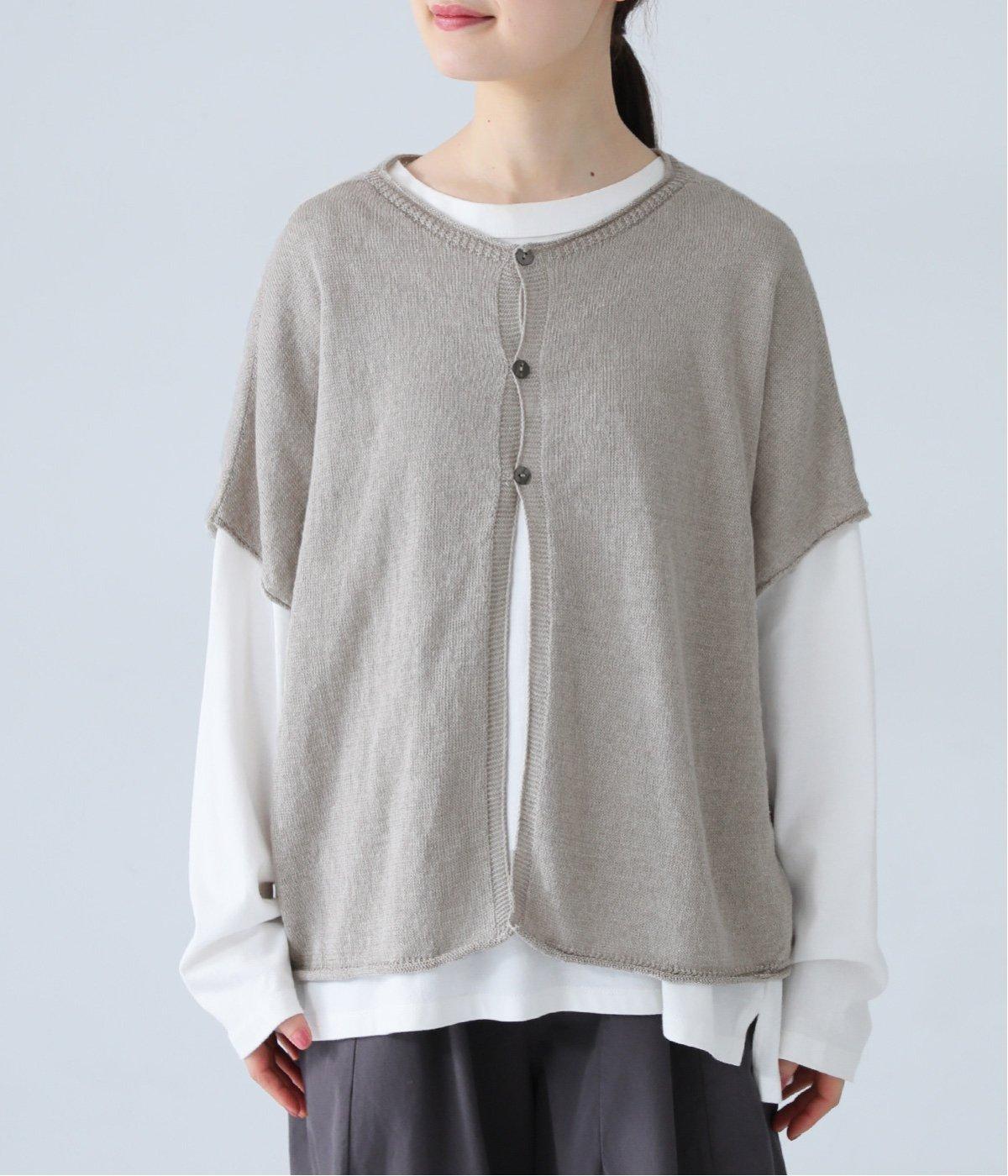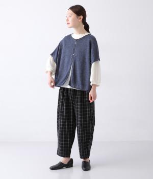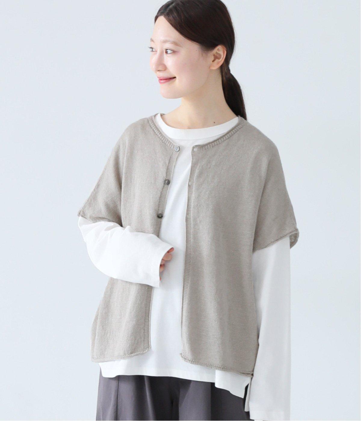 カーディガンとしても後ろ開きとしても着まわせる2way仕様のベストです。小さなボタンを3つのみ配して抜け感のある仕上がりに。裾などのくるりと丸まった編み端が愛らしいポイントです。ゆったりとしたドロップショルダーでインナーを合わせやすく、着こなしの幅が広がります。