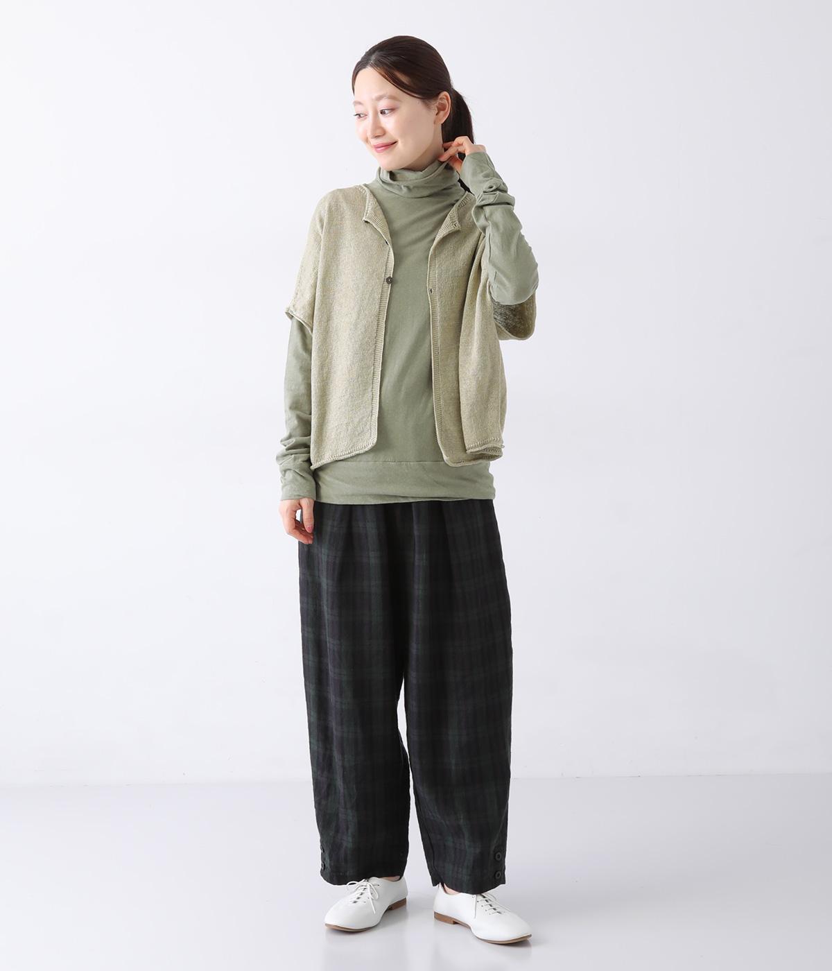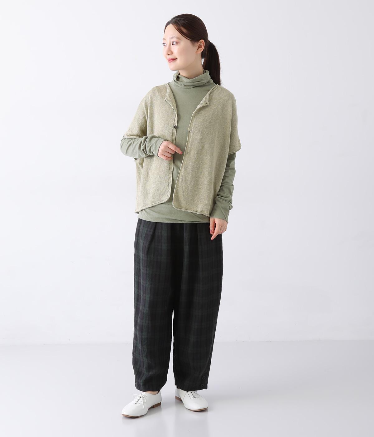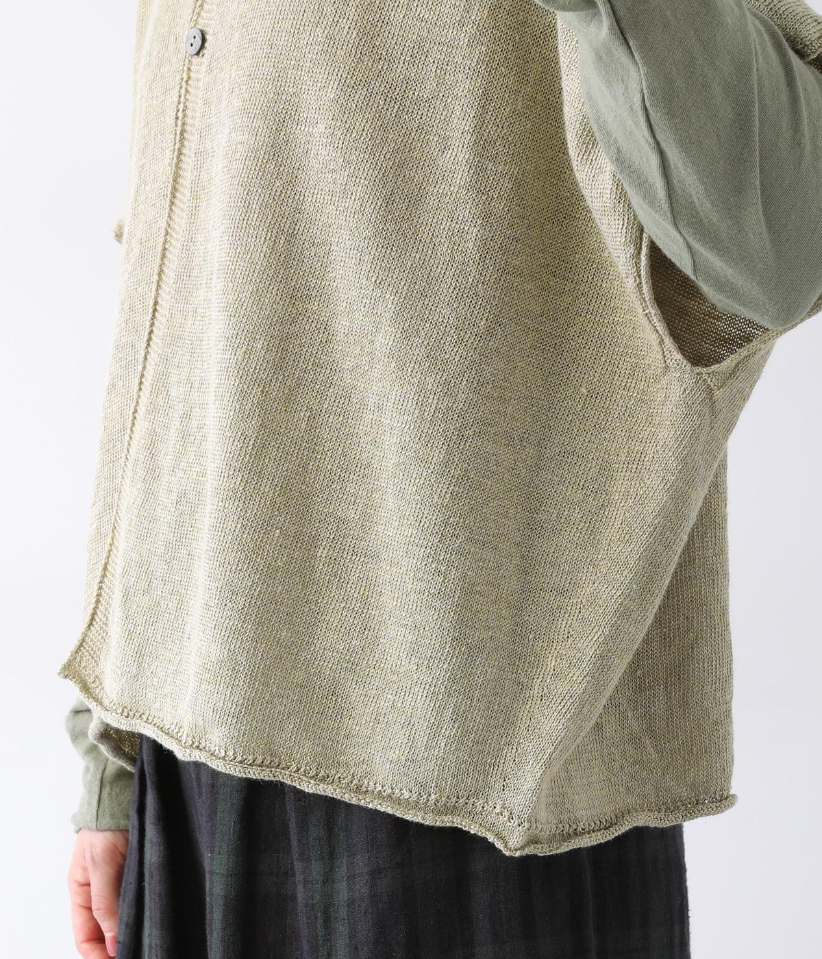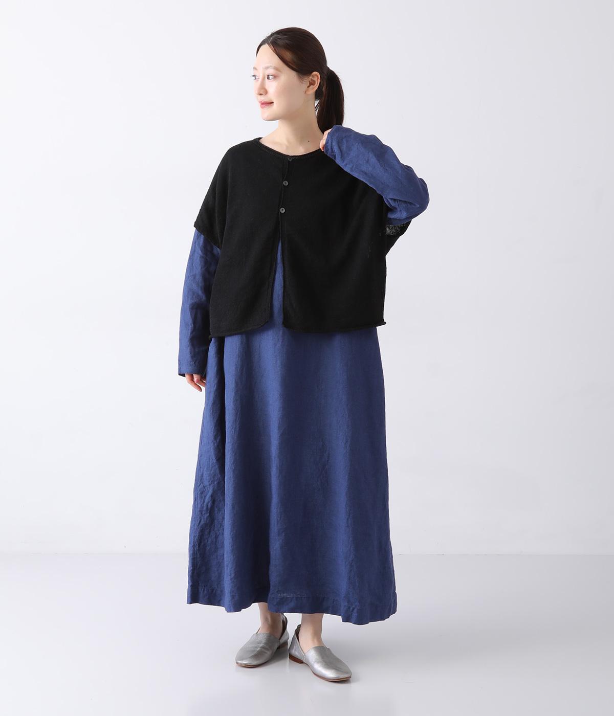 カーディガンとしても後ろ開きとしても着まわせる2way仕様のベストです。小さなボタンを3つのみ配して抜け感のある仕上がりに。裾などのくるりと丸まった編み端が愛らしいポイントです。ゆったりとしたドロップショルダーでインナーを合わせやすく、着こなしの幅が広がります。