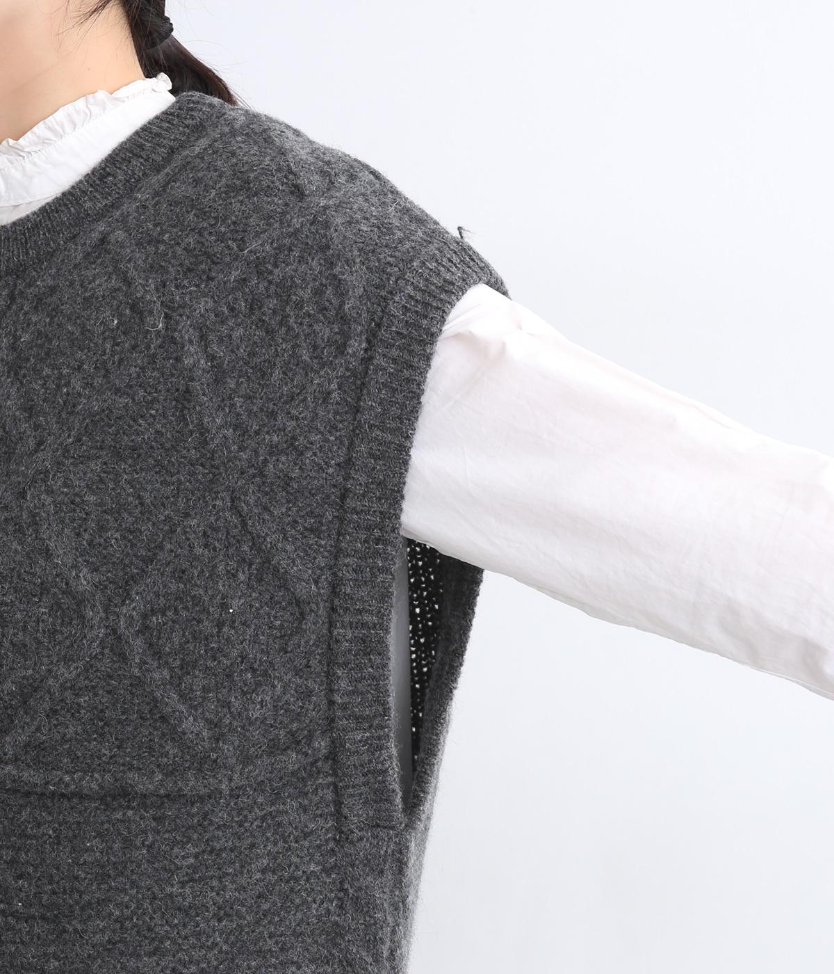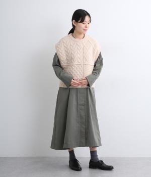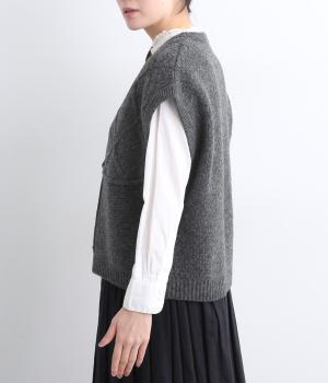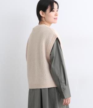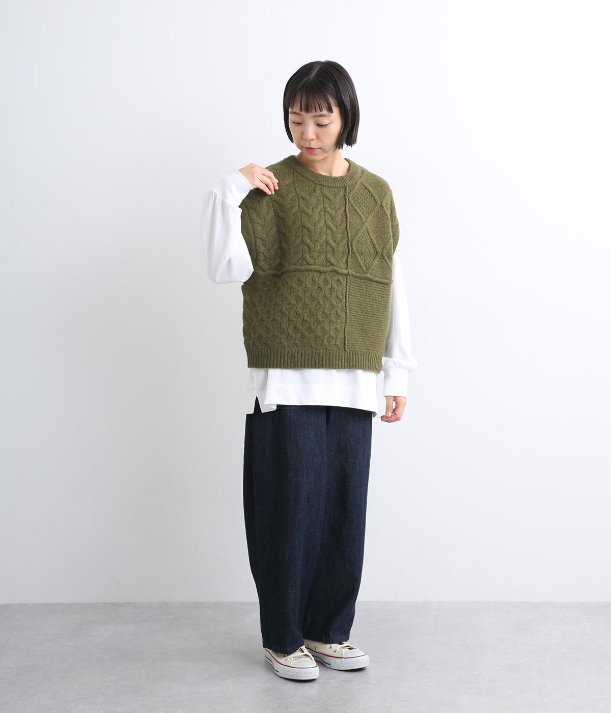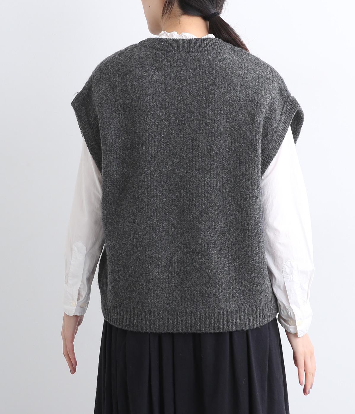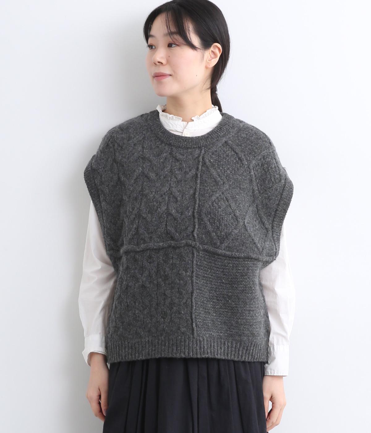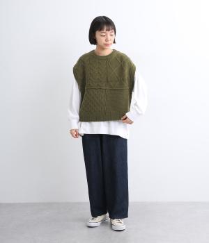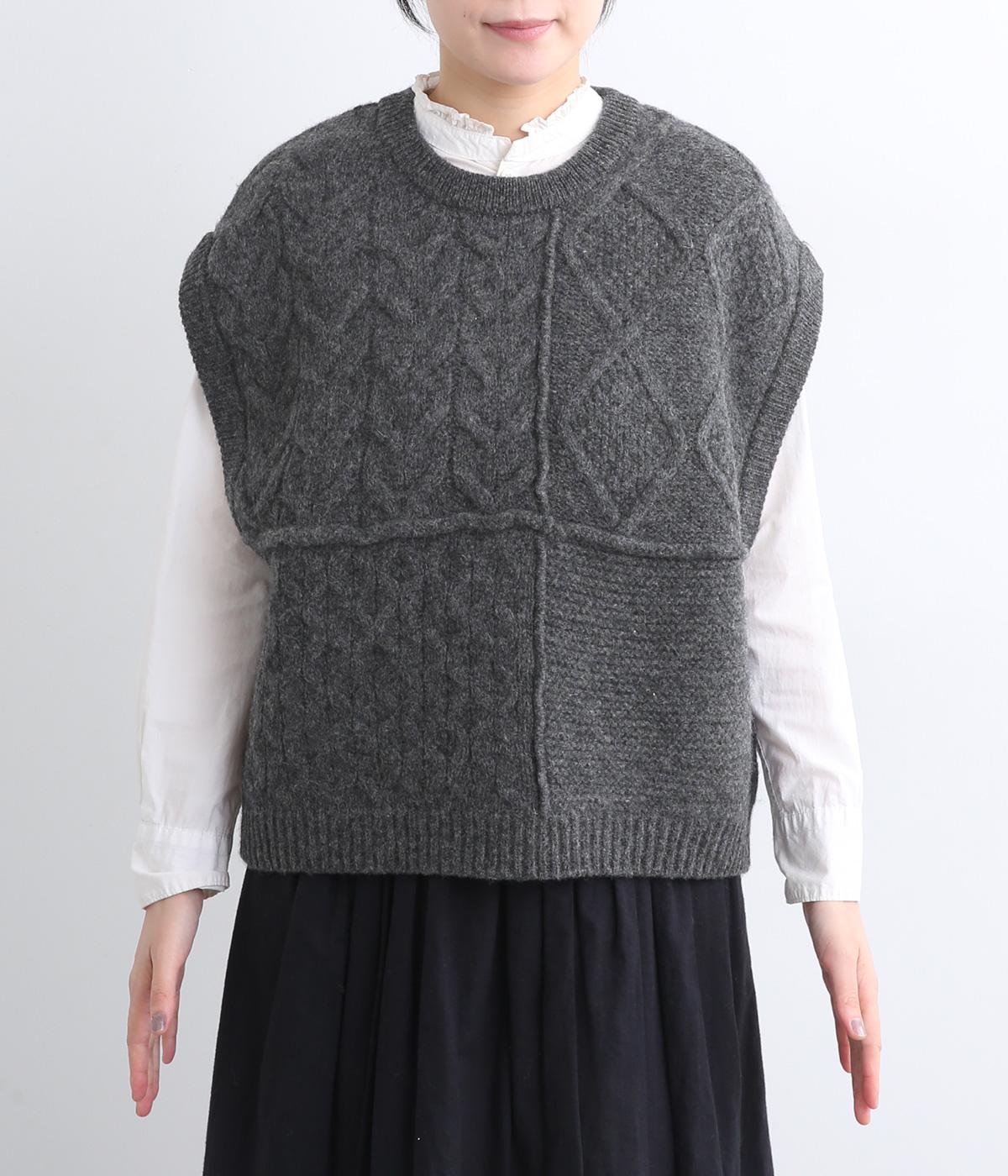 アラン模様を組み合わせてベストを仕立てました。背面はシンプルですっきりと見えます。袖口が広めでさまざまなインナーと好相性。ナチュラルな雰囲気でコーディネートの主役になる一枚です。