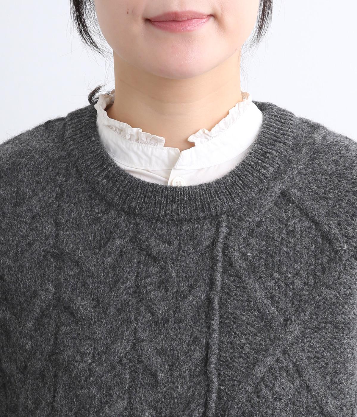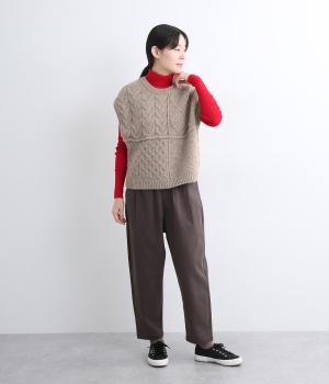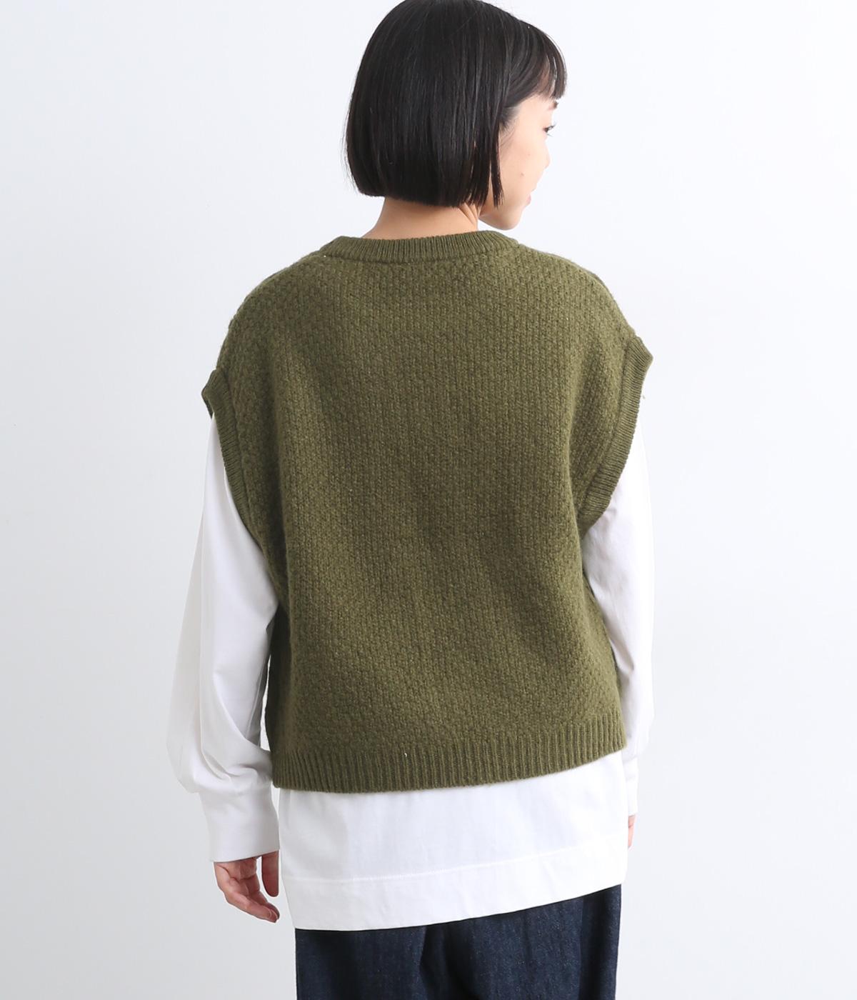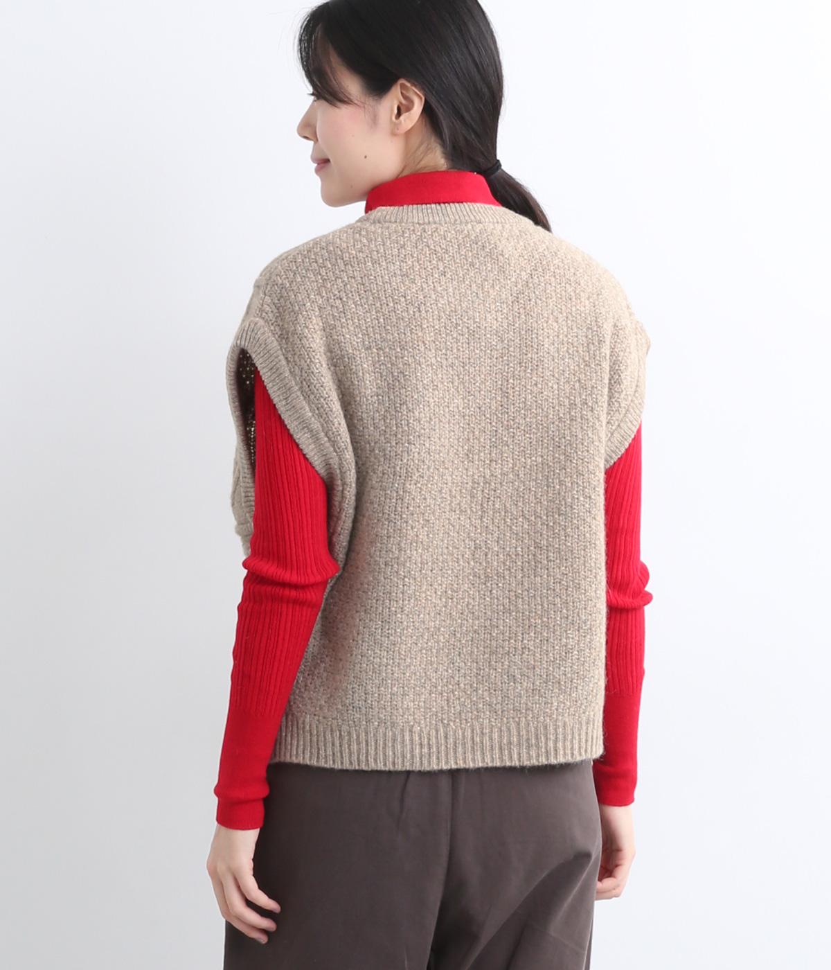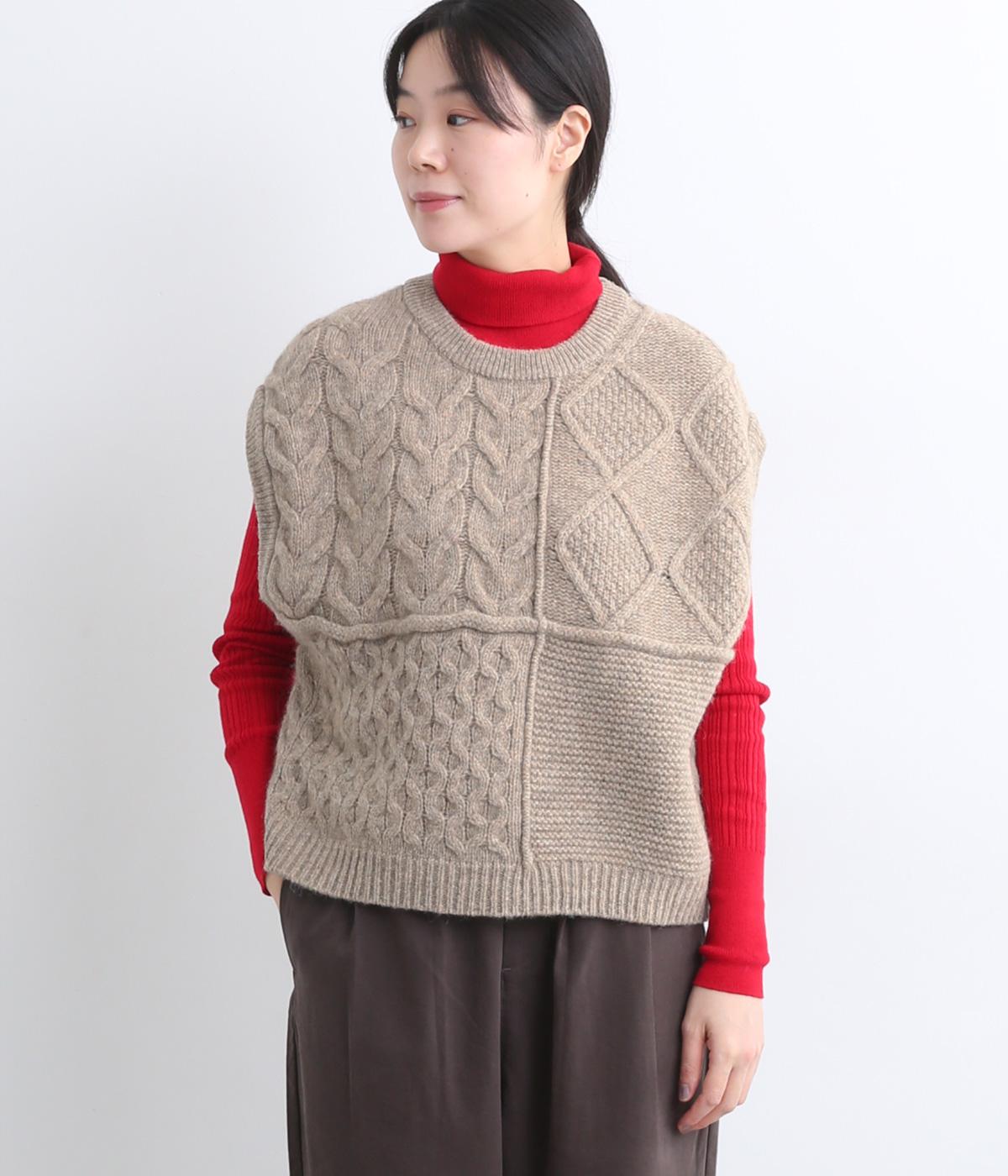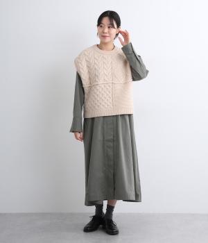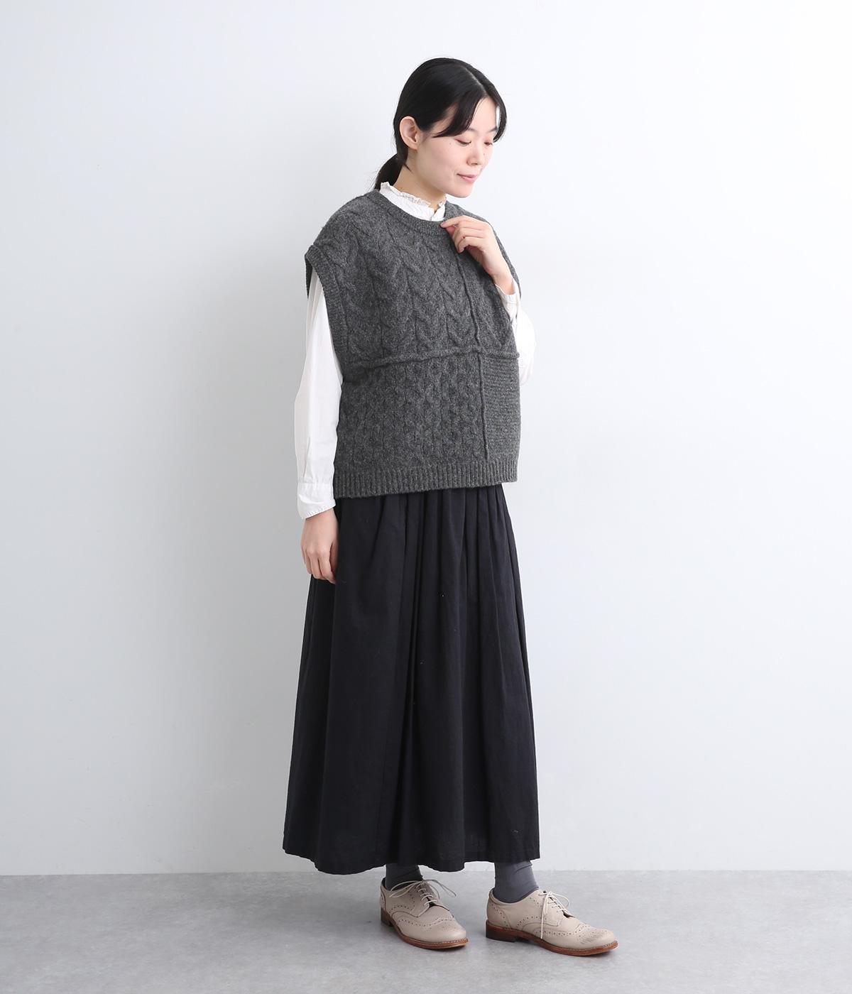 アラン模様を組み合わせてベストを仕立てました。背面はシンプルですっきりと見えます。袖口が広めでさまざまなインナーと好相性。ナチュラルな雰囲気でコーディネートの主役になる一枚です。