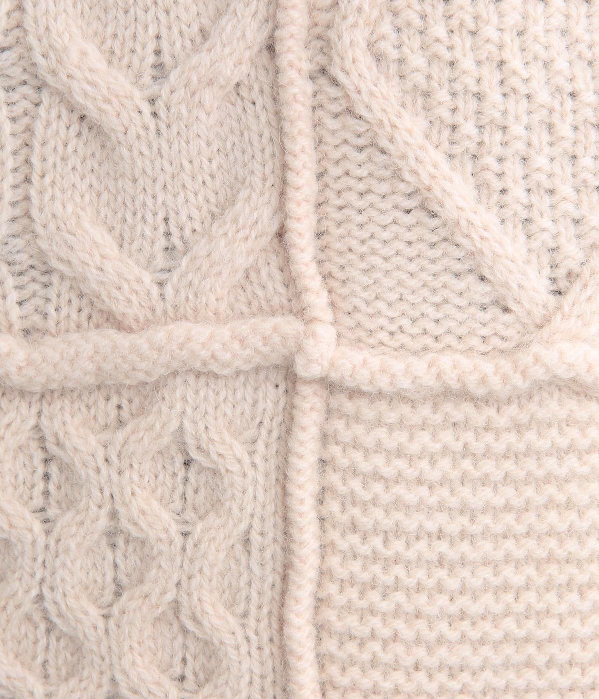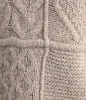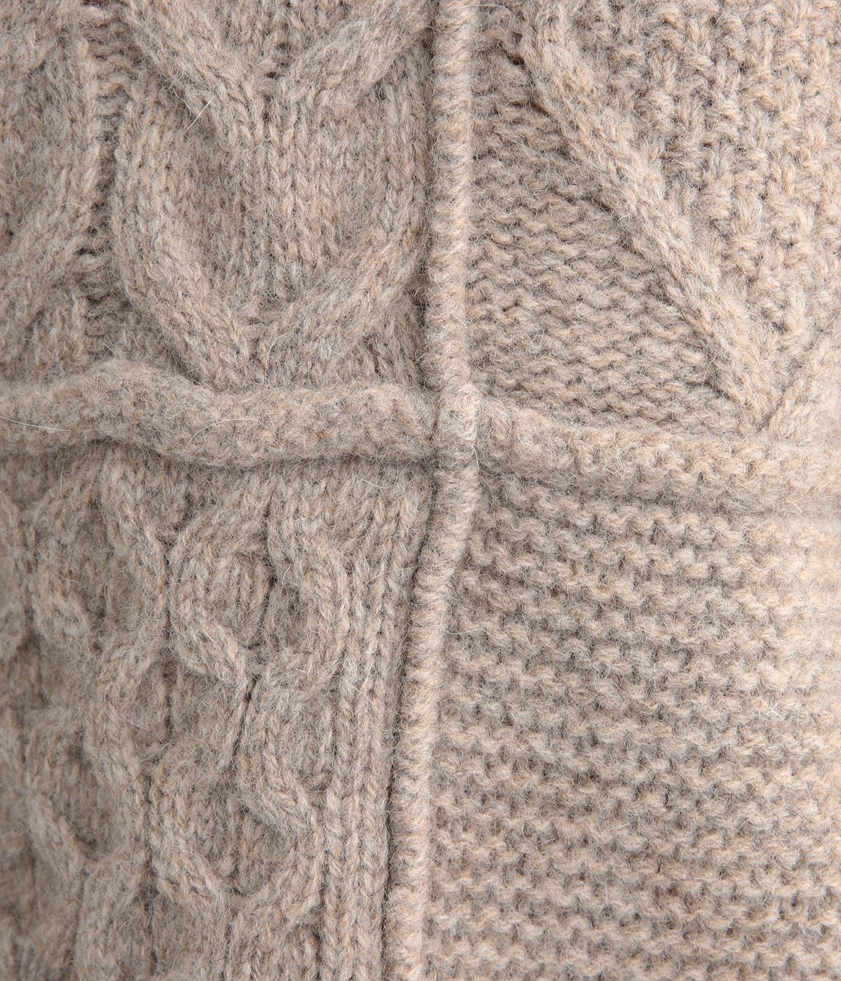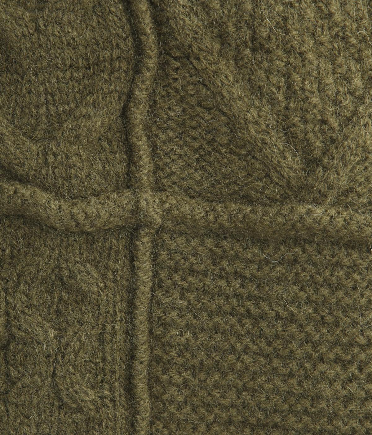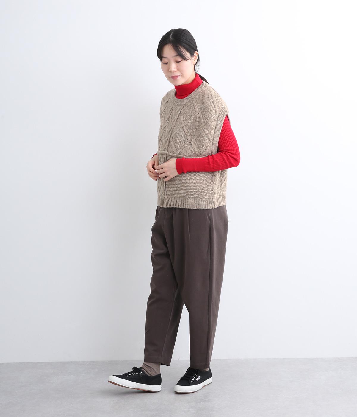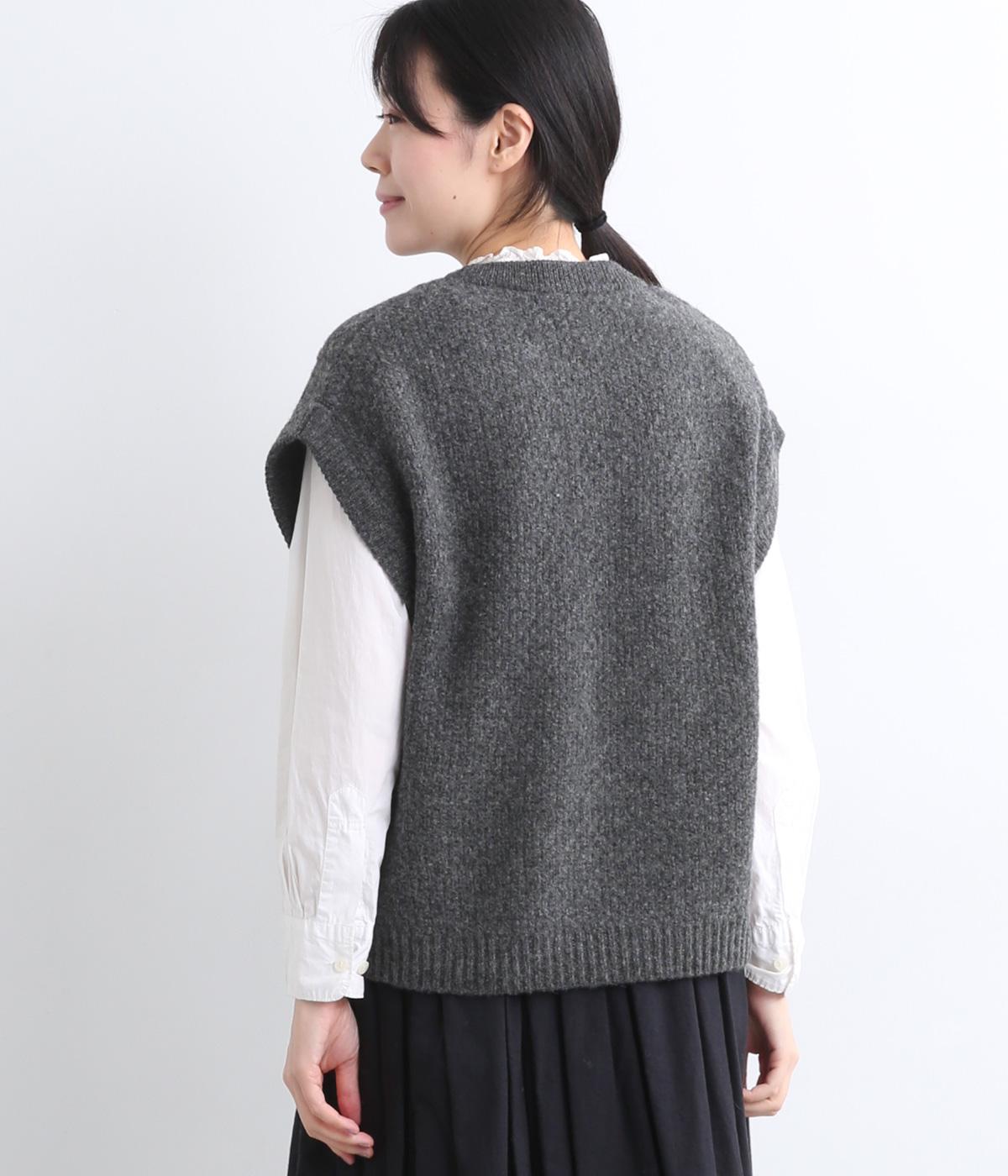 アラン模様を組み合わせてベストを仕立てました。背面はシンプルですっきりと見えます。袖口が広めでさまざまなインナーと好相性。ナチュラルな雰囲気でコーディネートの主役になる一枚です。