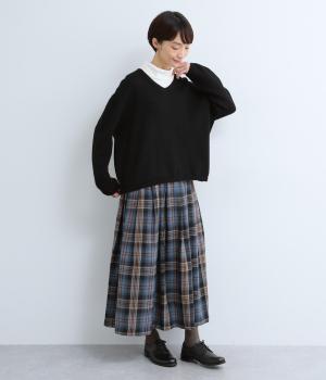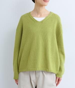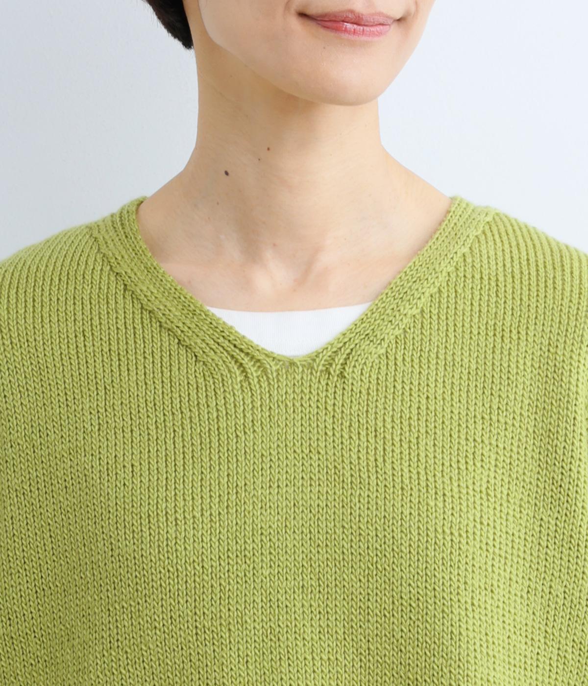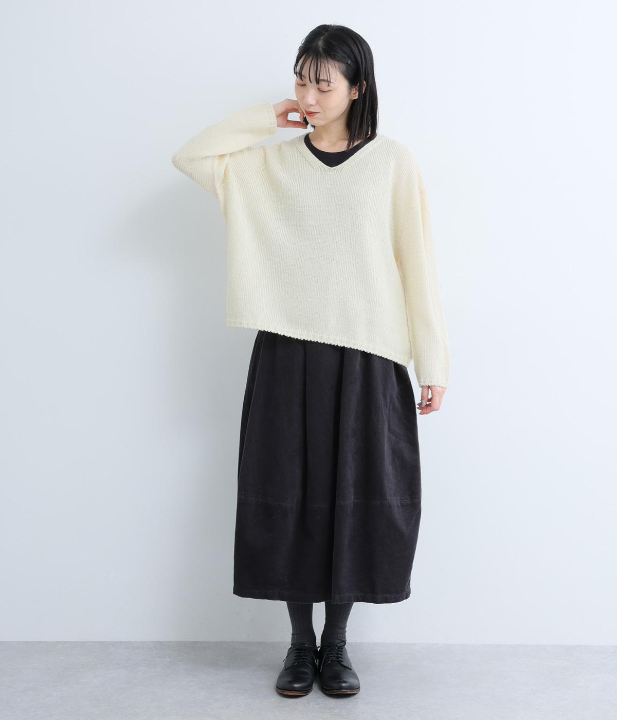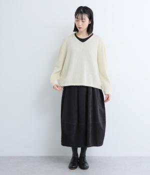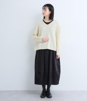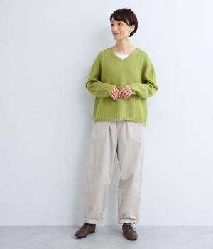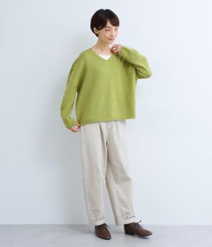 素材の風合いを活かした、シンプルなVネックデザインです。ほどよい深さのネックラインは、季節に合わせたレイヤードがしやすいのもうれしいポイント。身幅はゆったりめで抜け感がありつつ、だらしなくならない絶妙なバランスです。