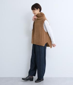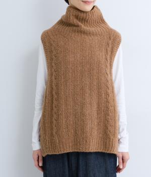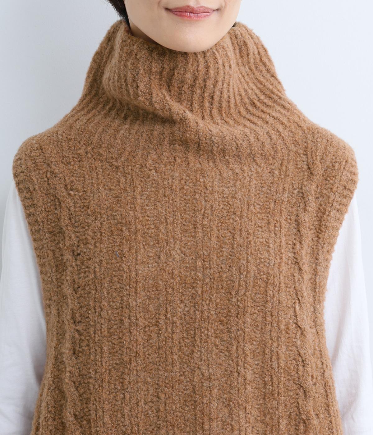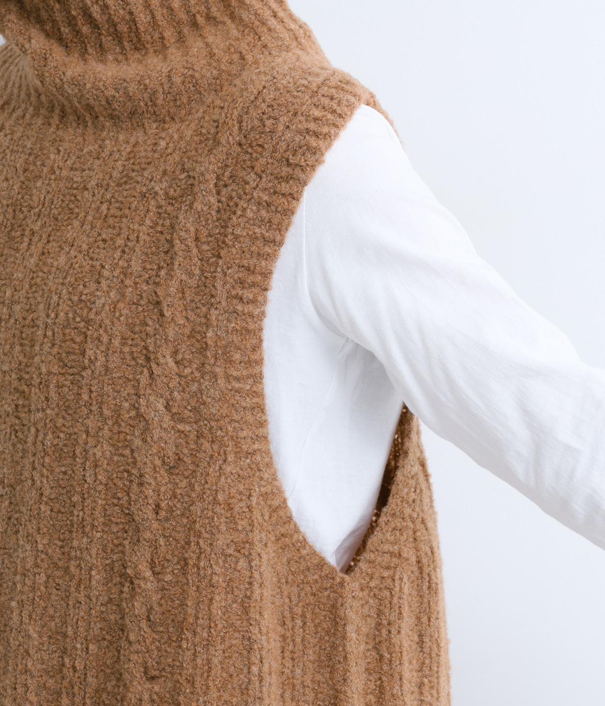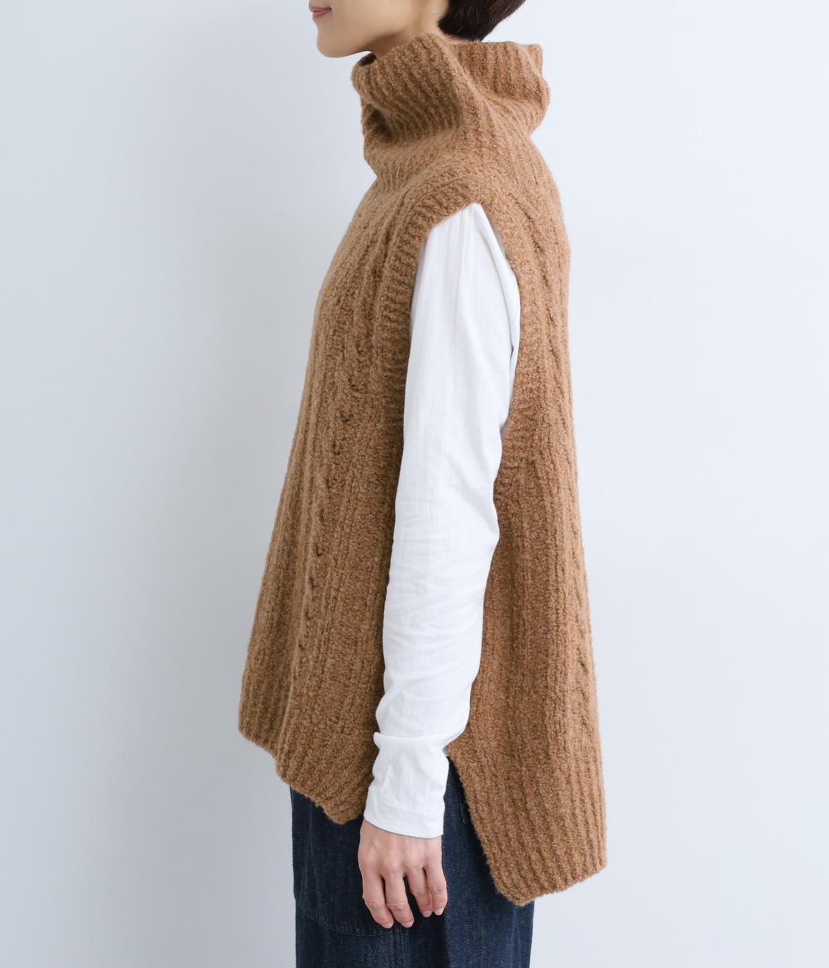 ボリュームのあるタートルネックがあたたかく、首まわりにほどよい存在感を添えるベストです。アームホールは広めで、どんなトップスともバランスよくレイヤードできます。裾のスリットが軽やかな抜け感を演出し、着こなしにリズムをプラス。編み地の表情がやさしく、ナチュラル感たっぷりに仕上がりました。